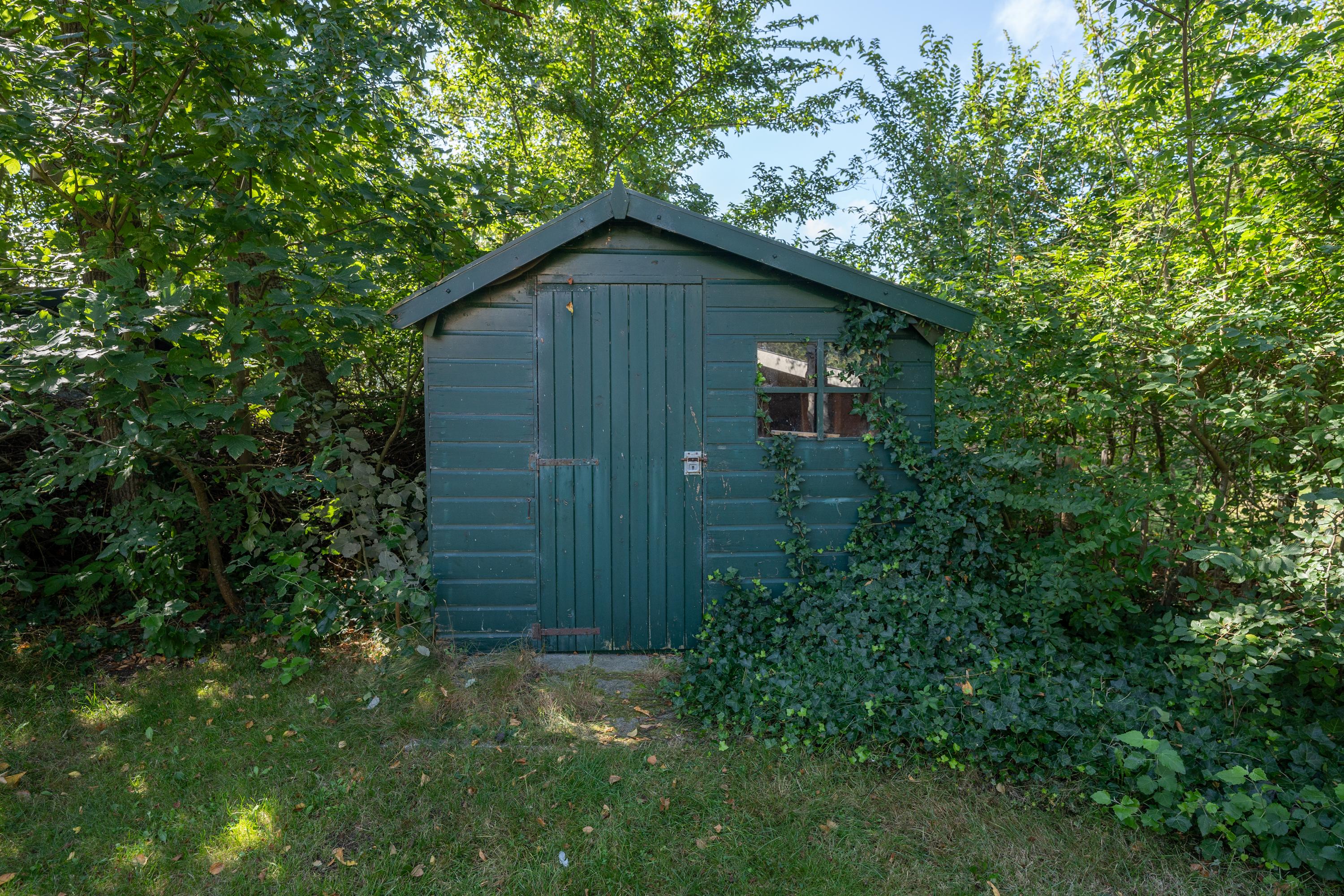 Ziet u zichzelf hier al zitten? In de tuin treft u nog een vrijstaand houten tuinhuisje, ideaal voor het opbergen van uw tuinmeubelen en/of fietsen.