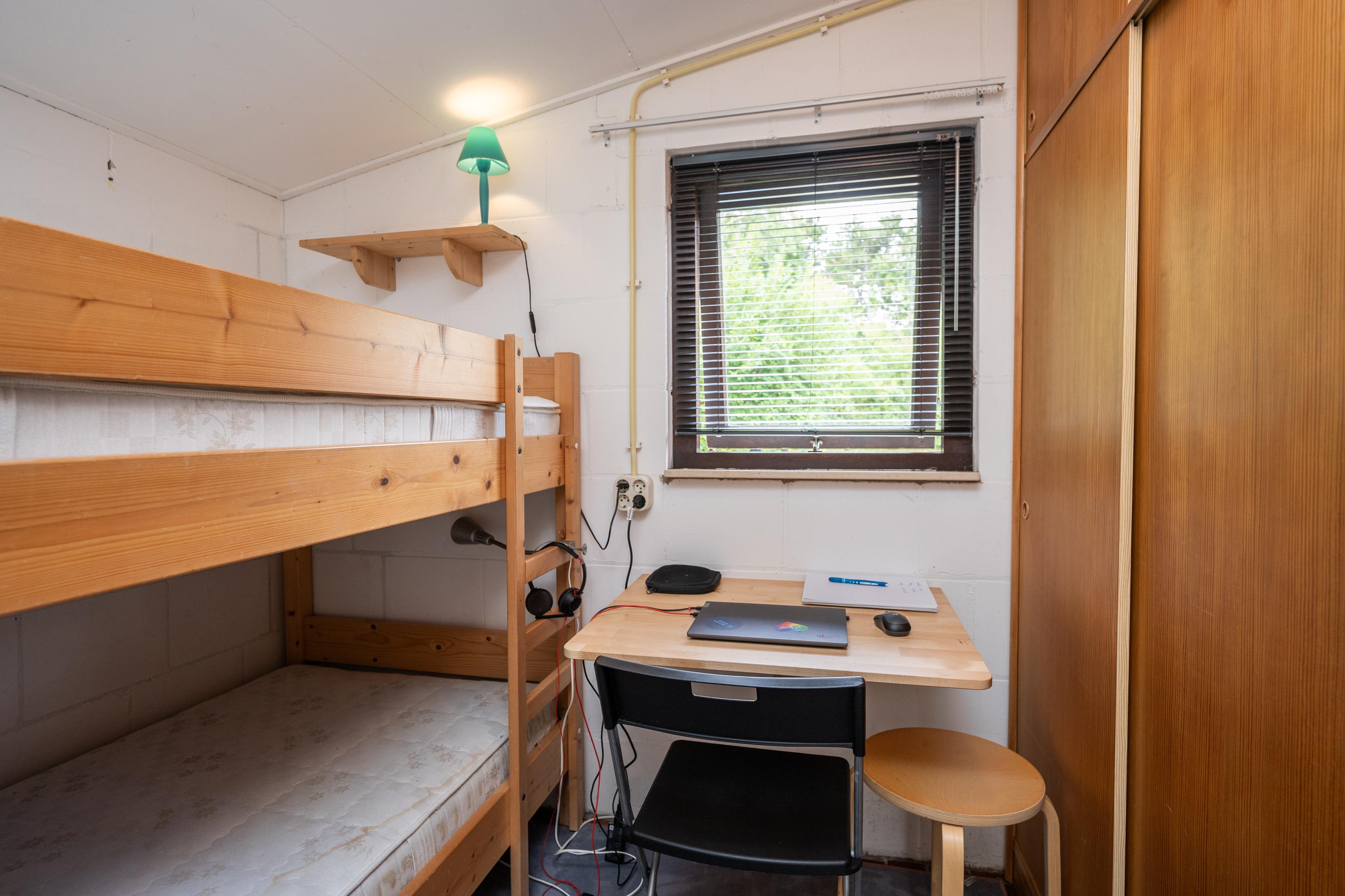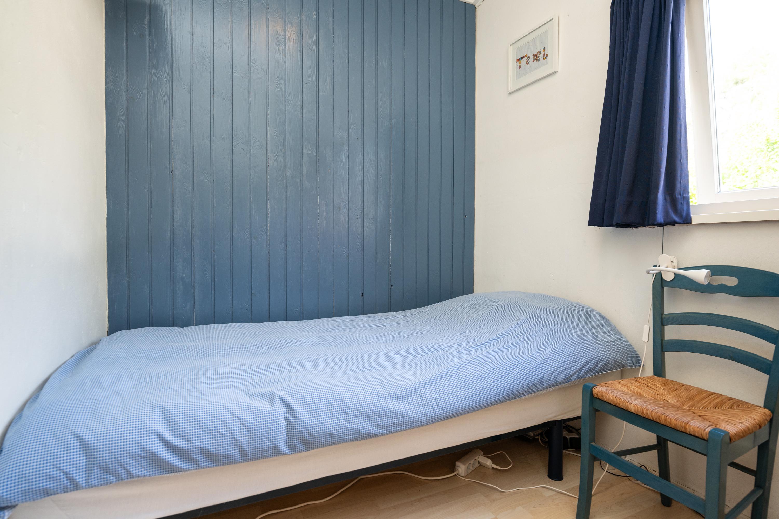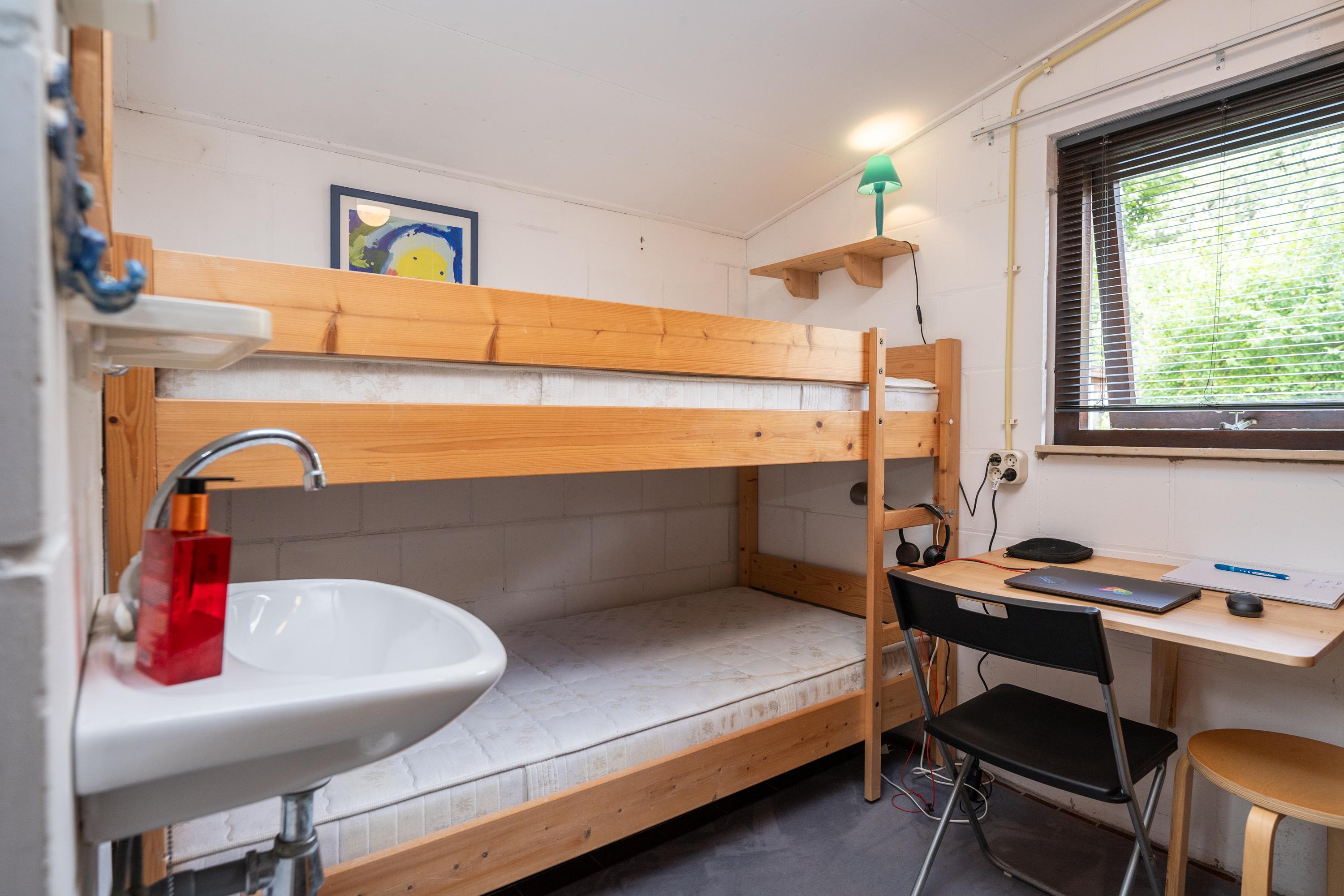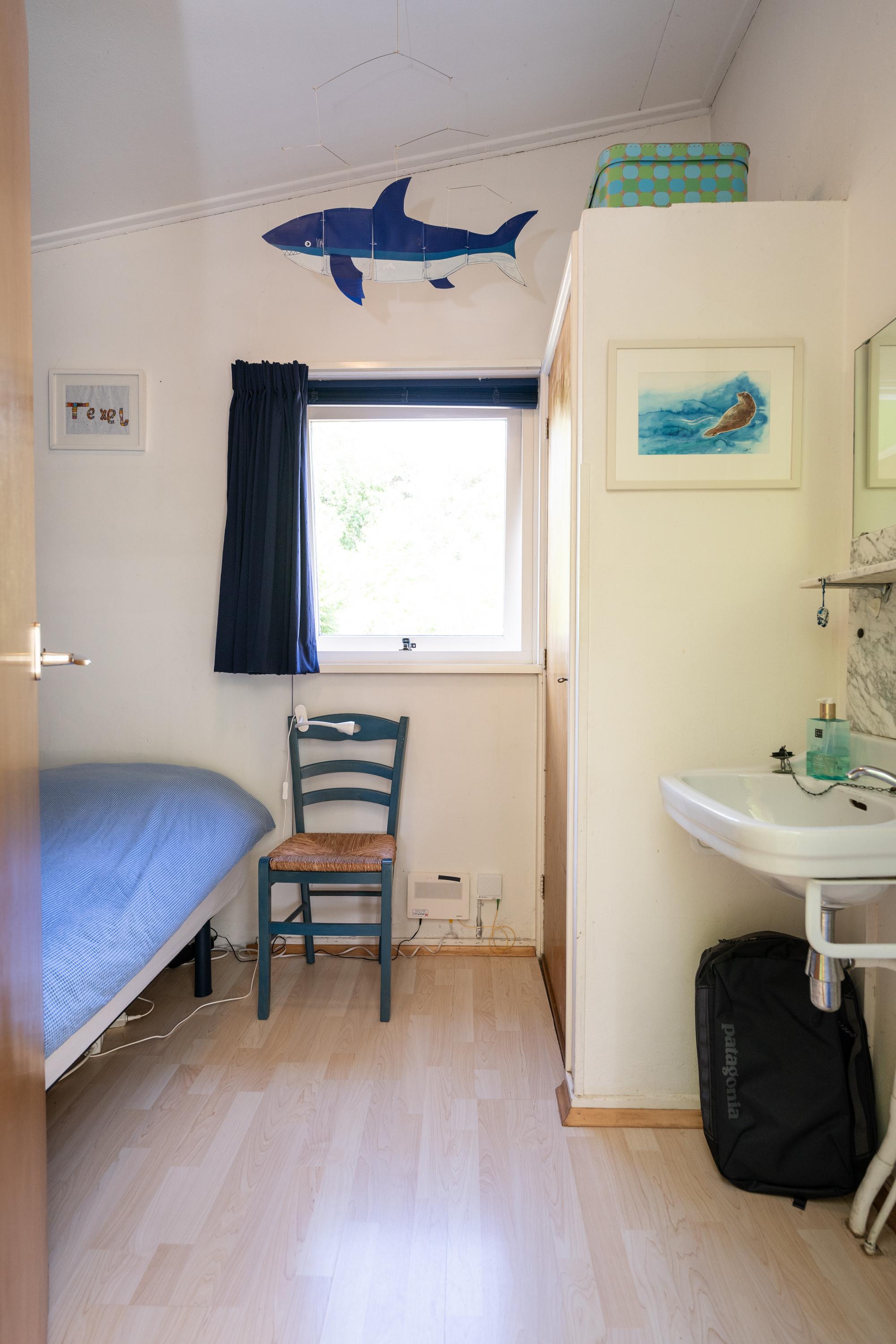 De berging is ingericht als slaapkamer en voorzien van een stapelbed en een eigen wastafel. Via de woonkamer bereikt u het terras waar het zomers heerlijk vertoeven is.
