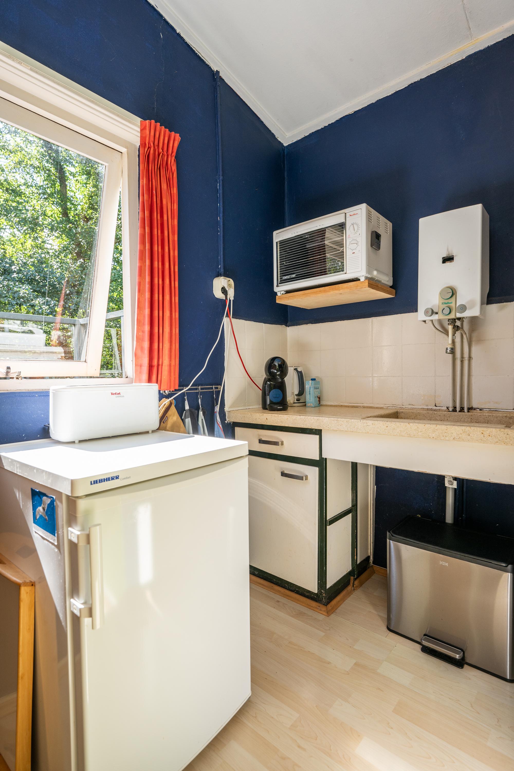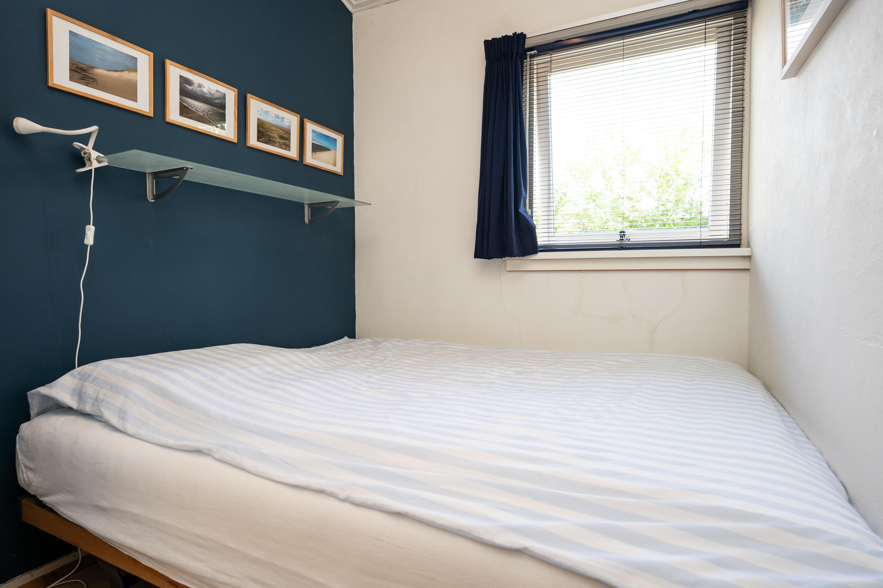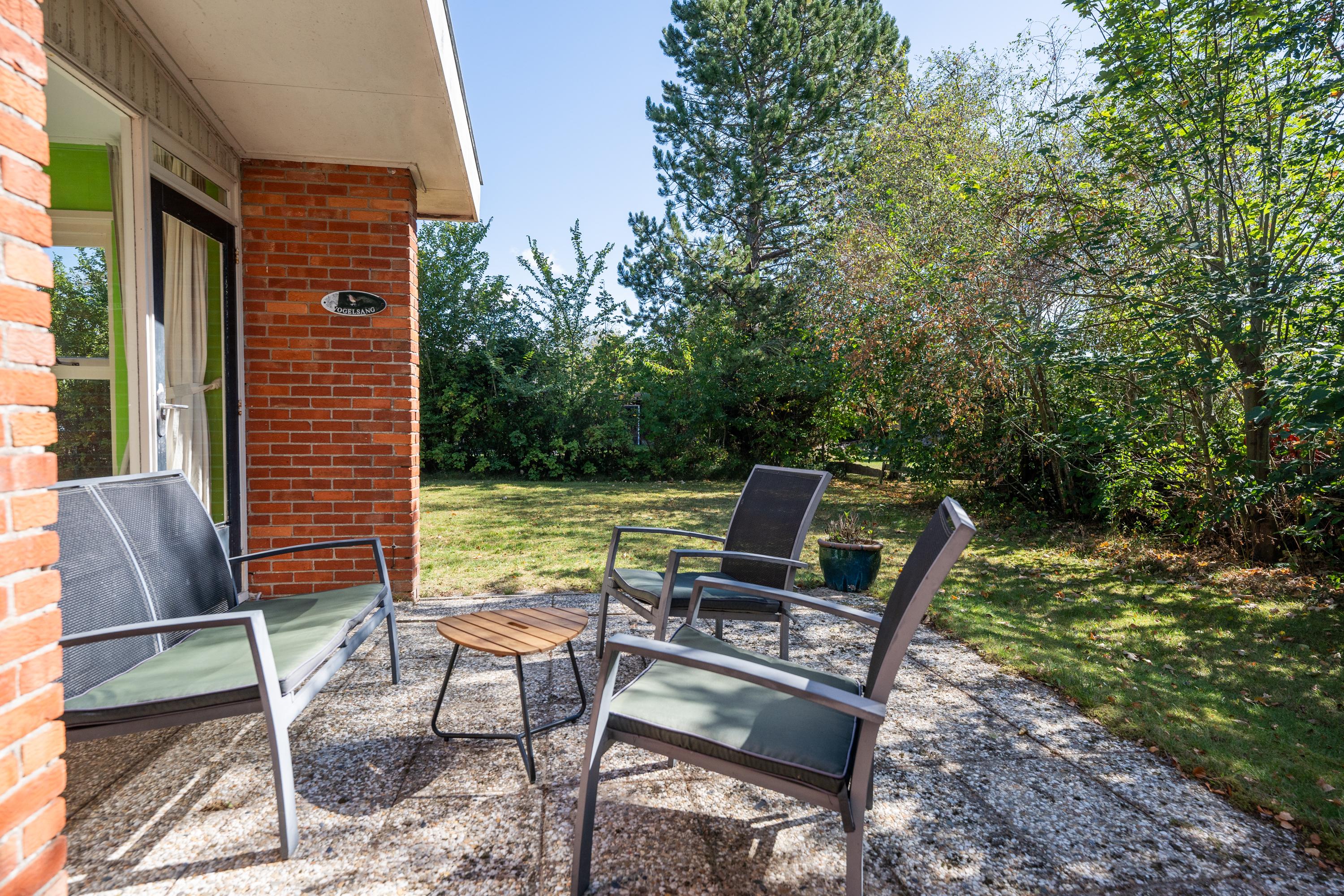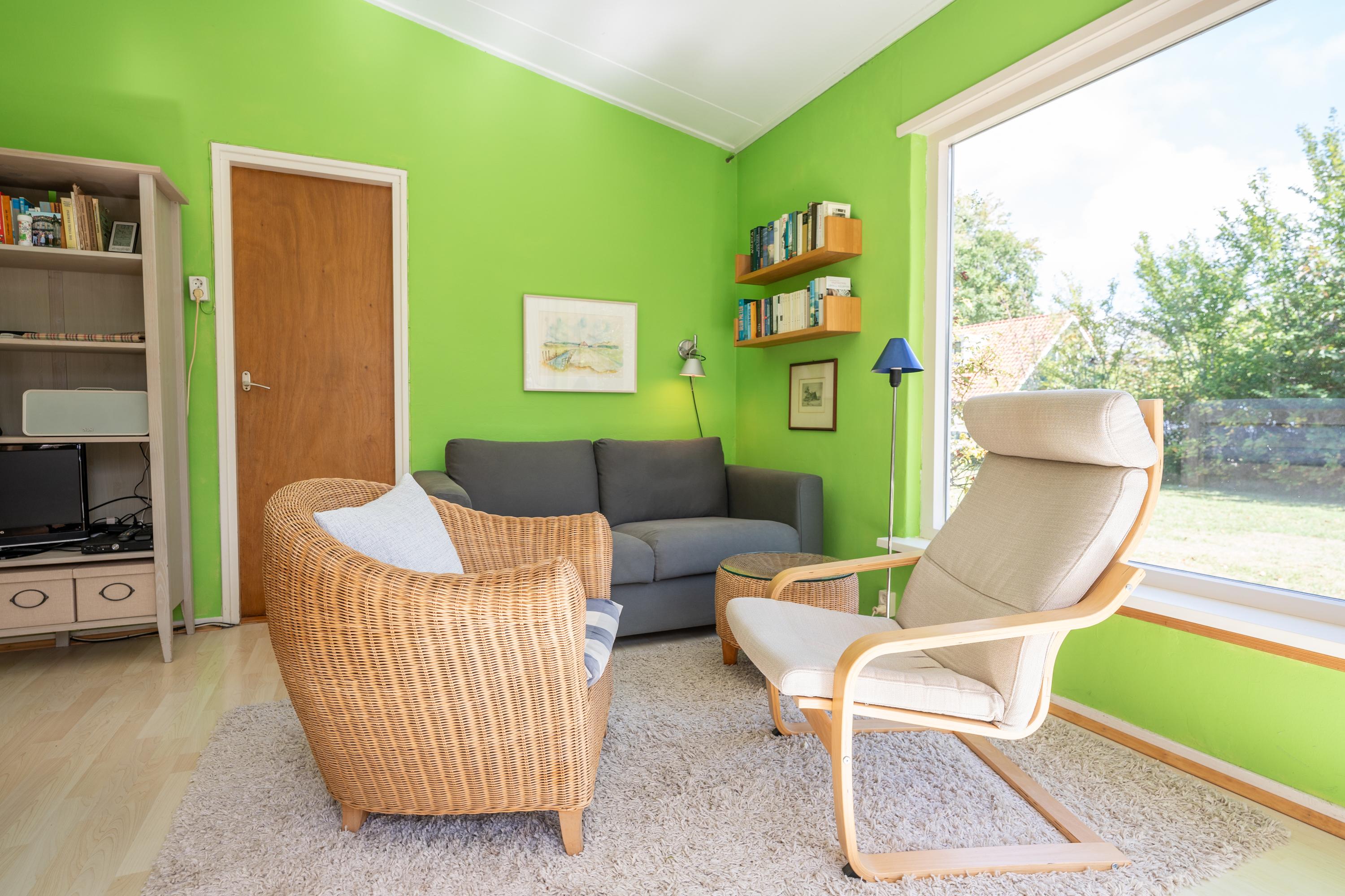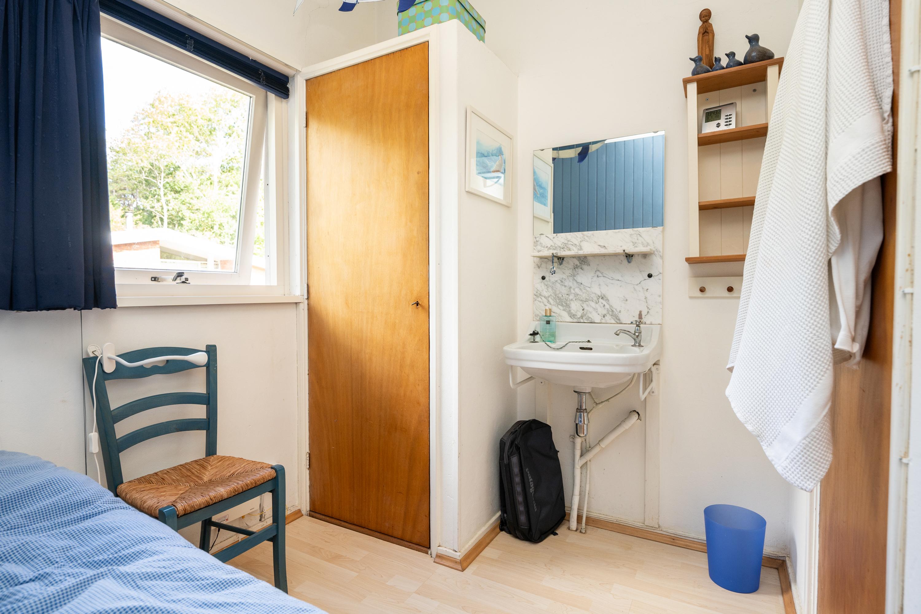 De berging is ingericht als slaapkamer en voorzien van een stapelbed en een eigen wastafel. Via de woonkamer bereikt u het terras waar het zomers heerlijk vertoeven is.