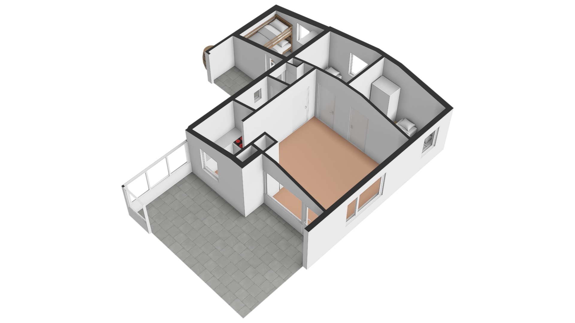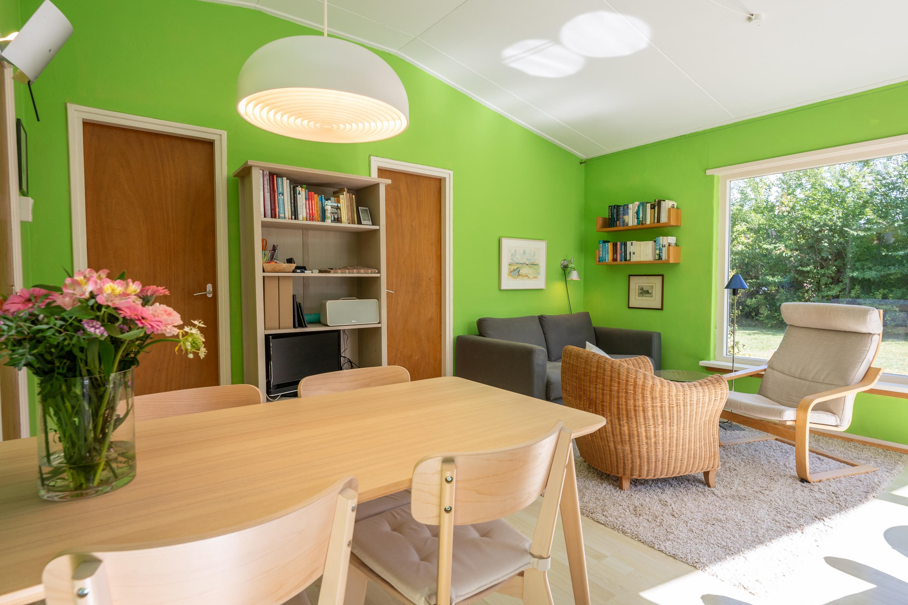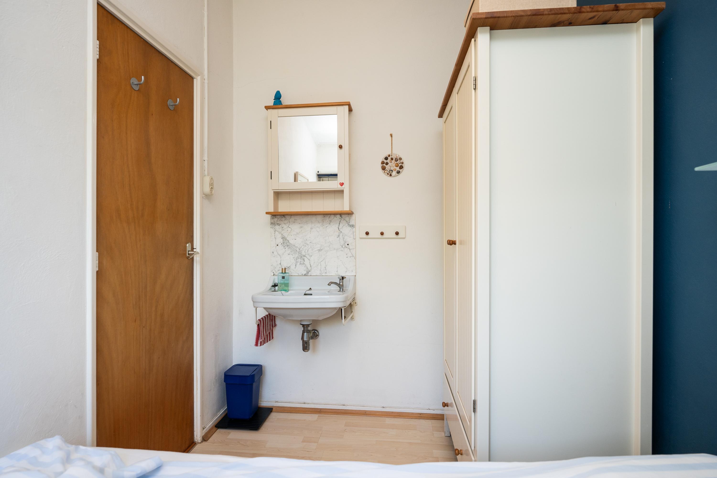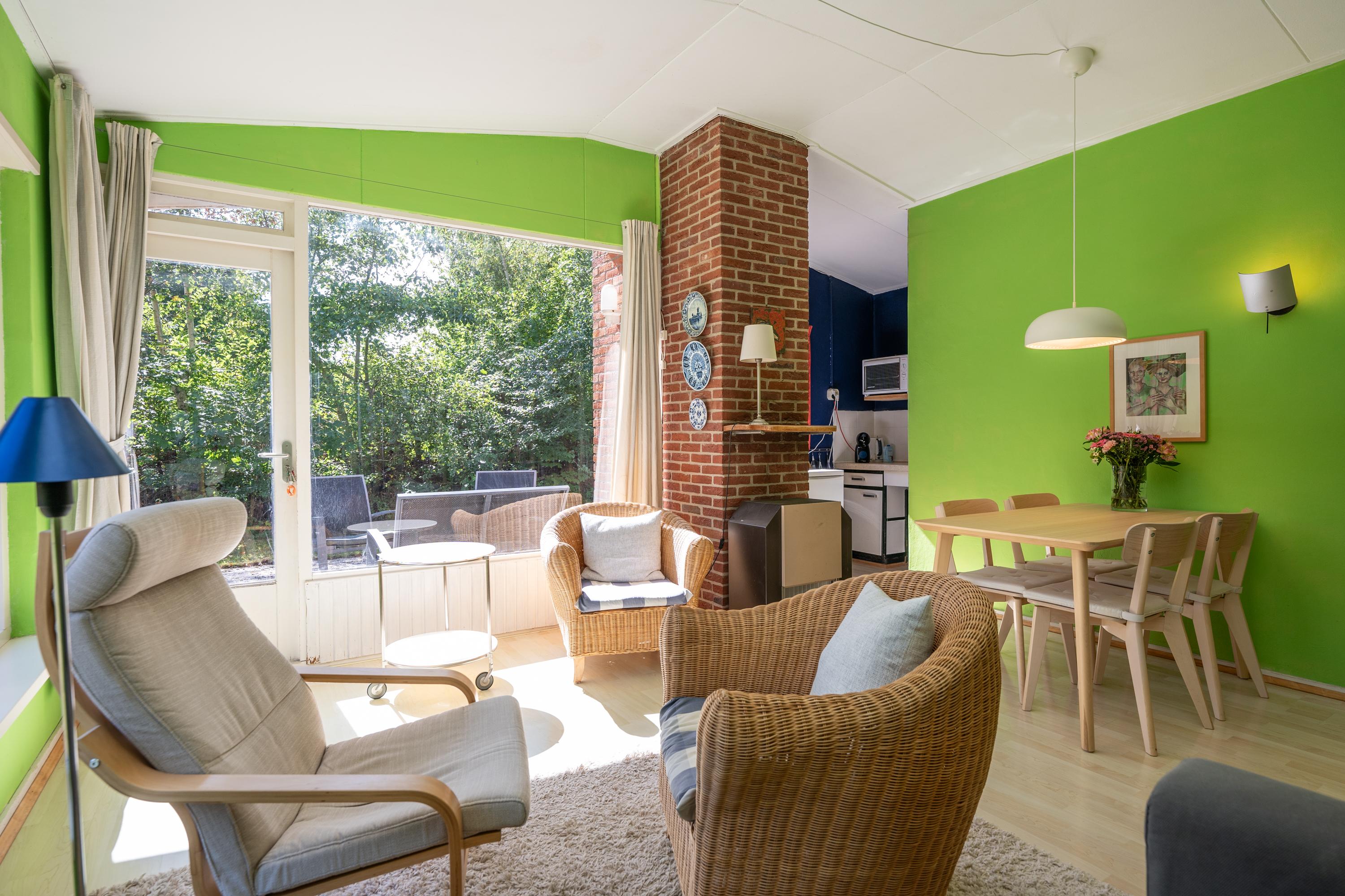 De berging is ingericht als slaapkamer en voorzien van een stapelbed en een eigen wastafel. Via de woonkamer bereikt u het terras waar het zomers heerlijk vertoeven is.