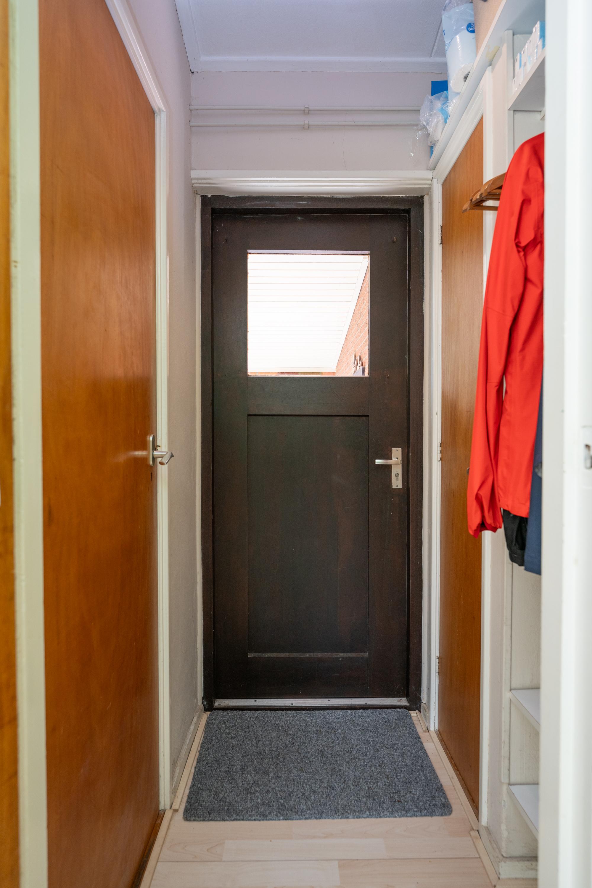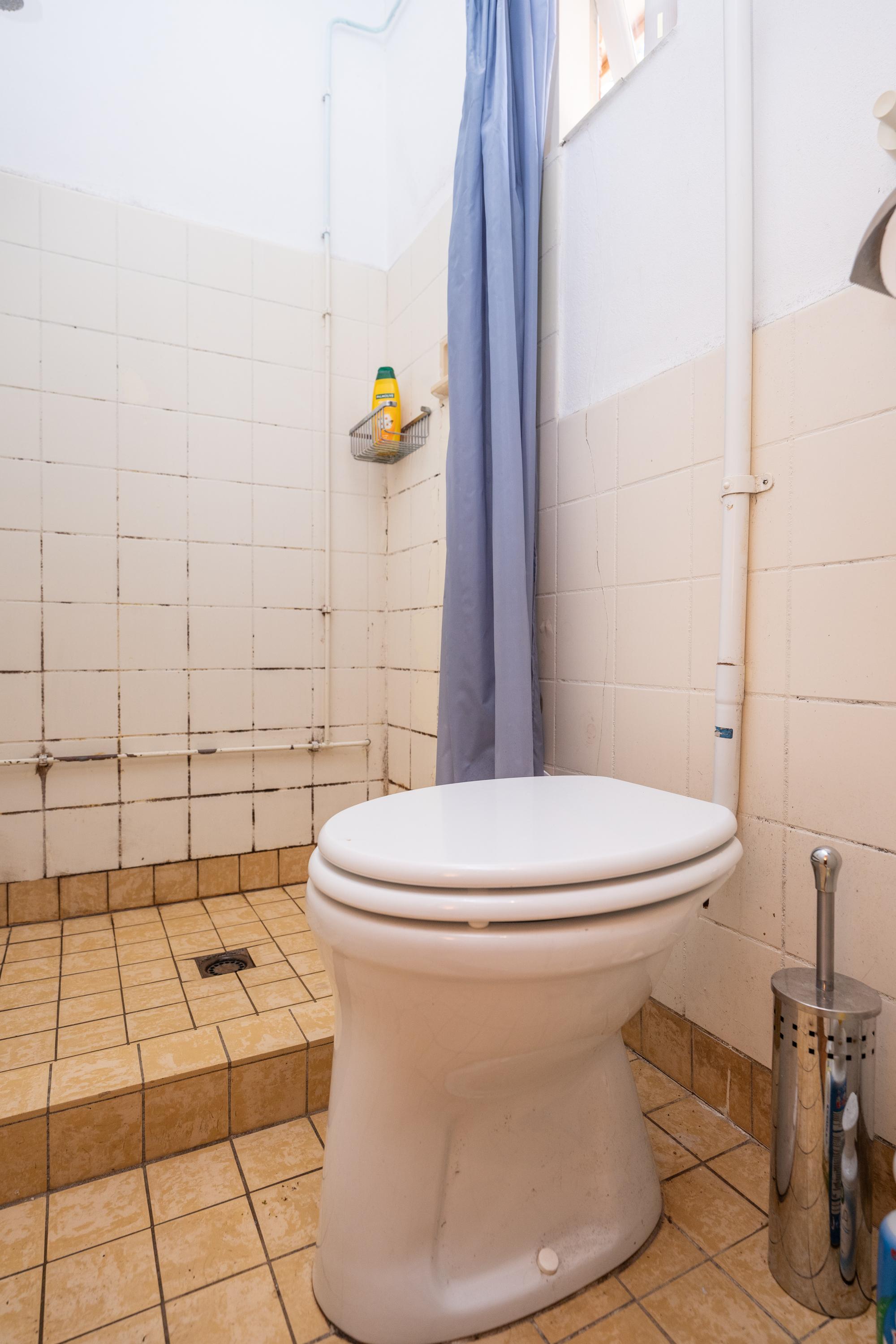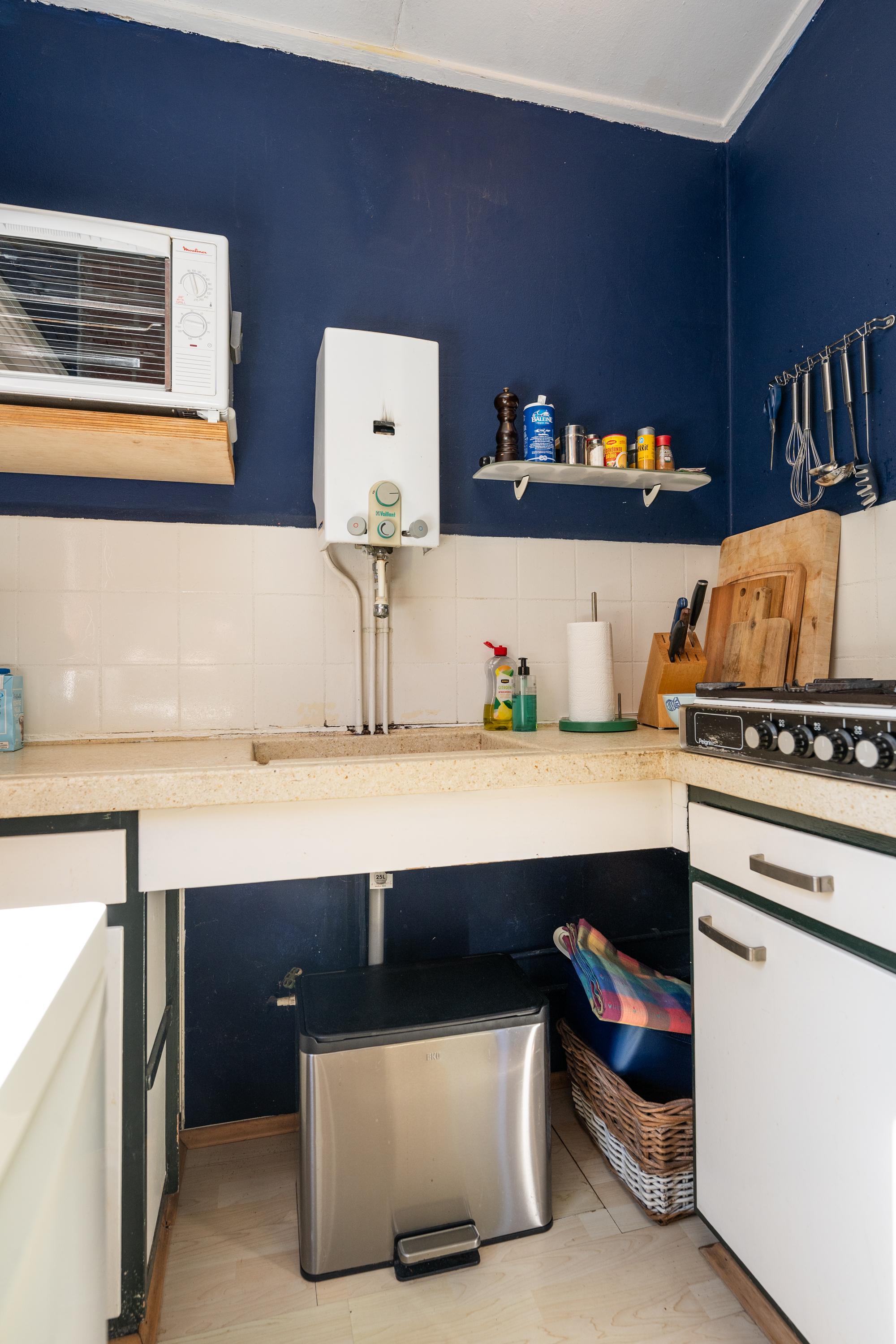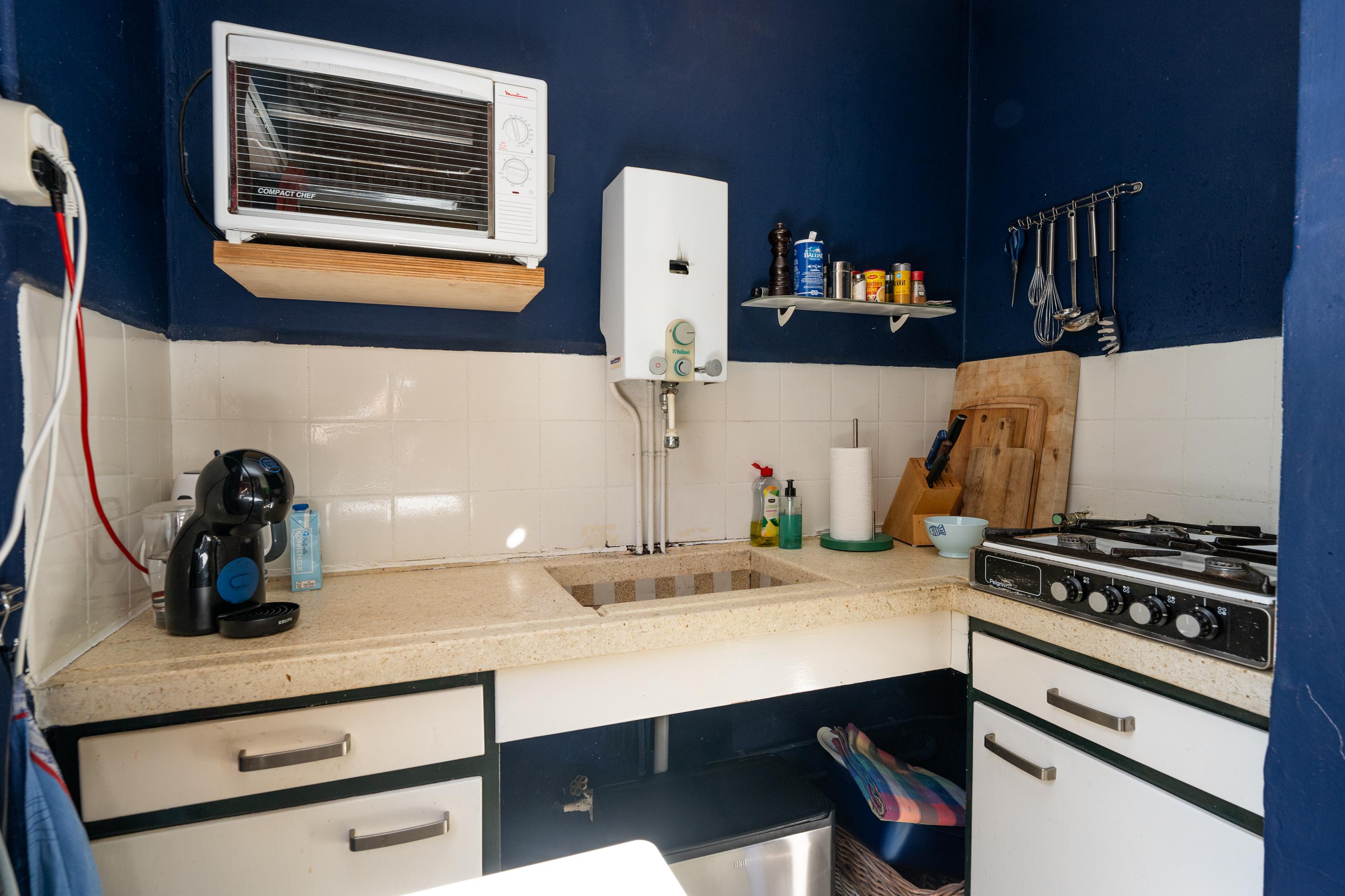 Entree in de hal met toegang tot de eenvoudige badkamer met toilet en doucheruimte. Deze heeft wel wat aandacht nodig. Een frisse, lichte woonkamer met volop kleur, waar grote ramen zorgen voor een mooie, natuurlijke lichtinval. De originele keuken is uitgerust met een granito aanrecht en diverse vrijstaande apparatuur.
