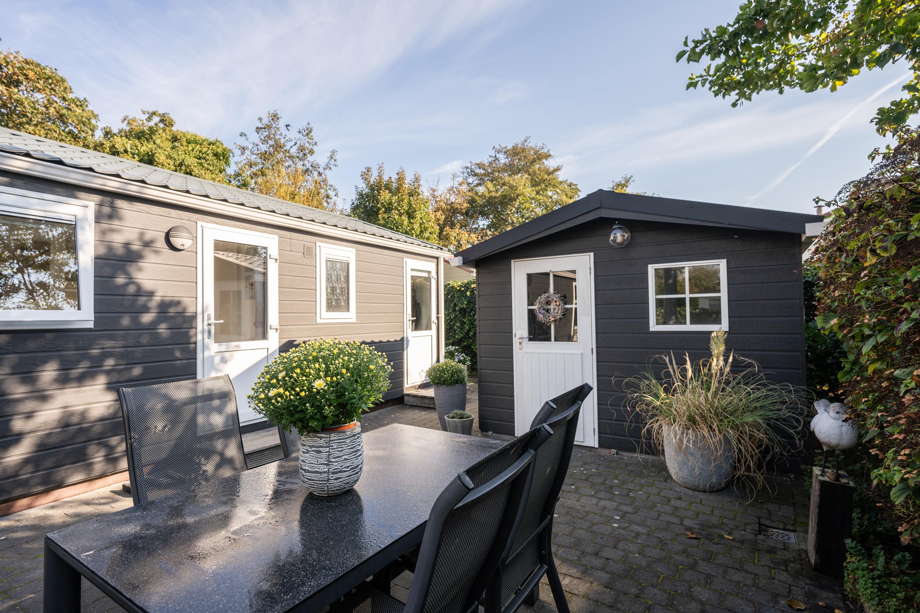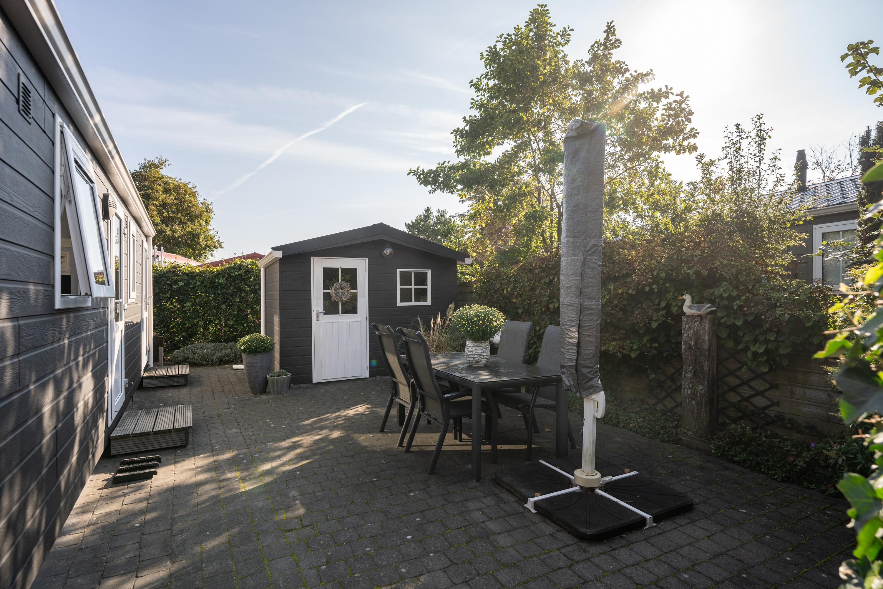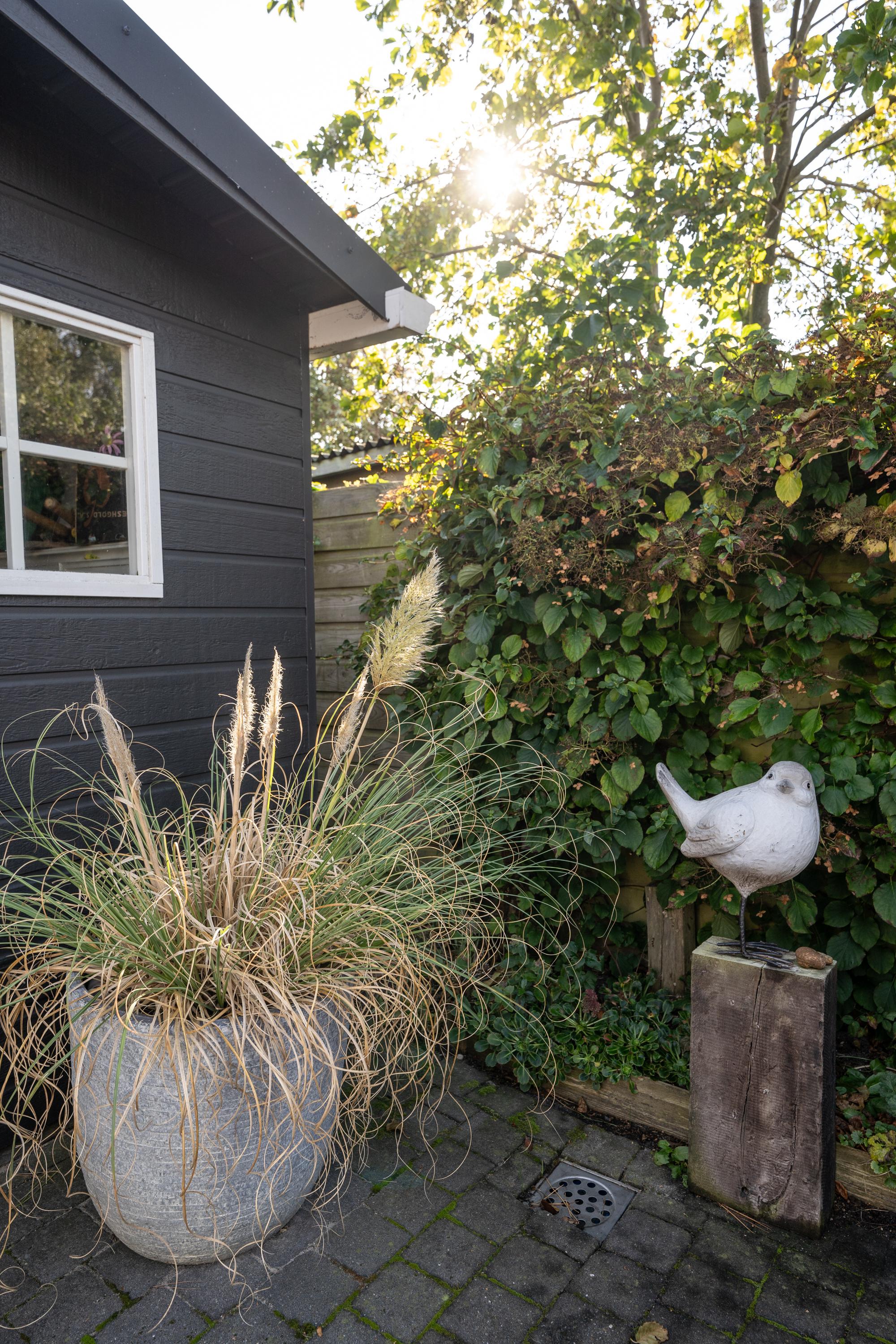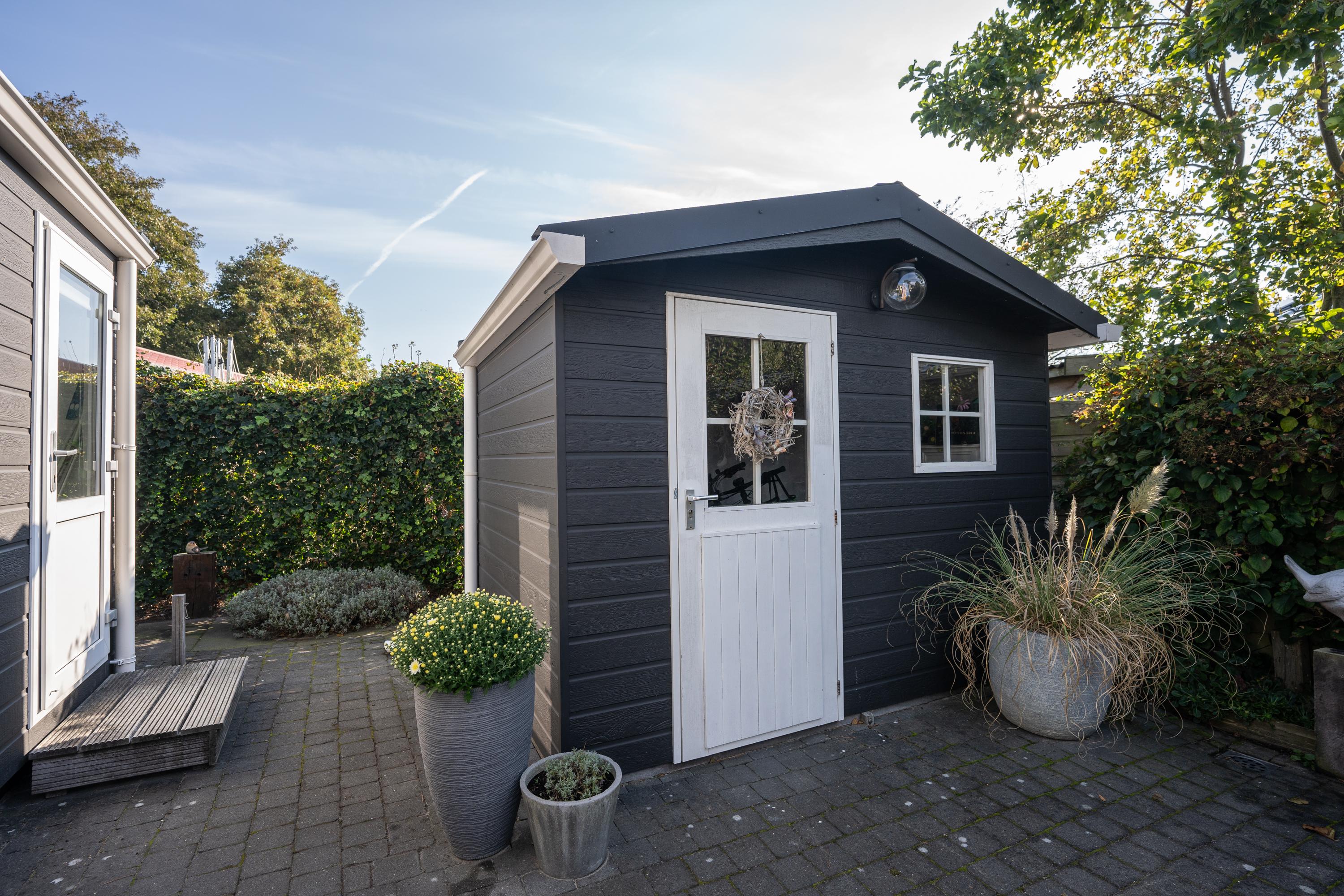 In de tuin staat een vrijstaand houten tuinhuis, ideaal voor het opbergen van de tuinmeubelen en/of fietsen.