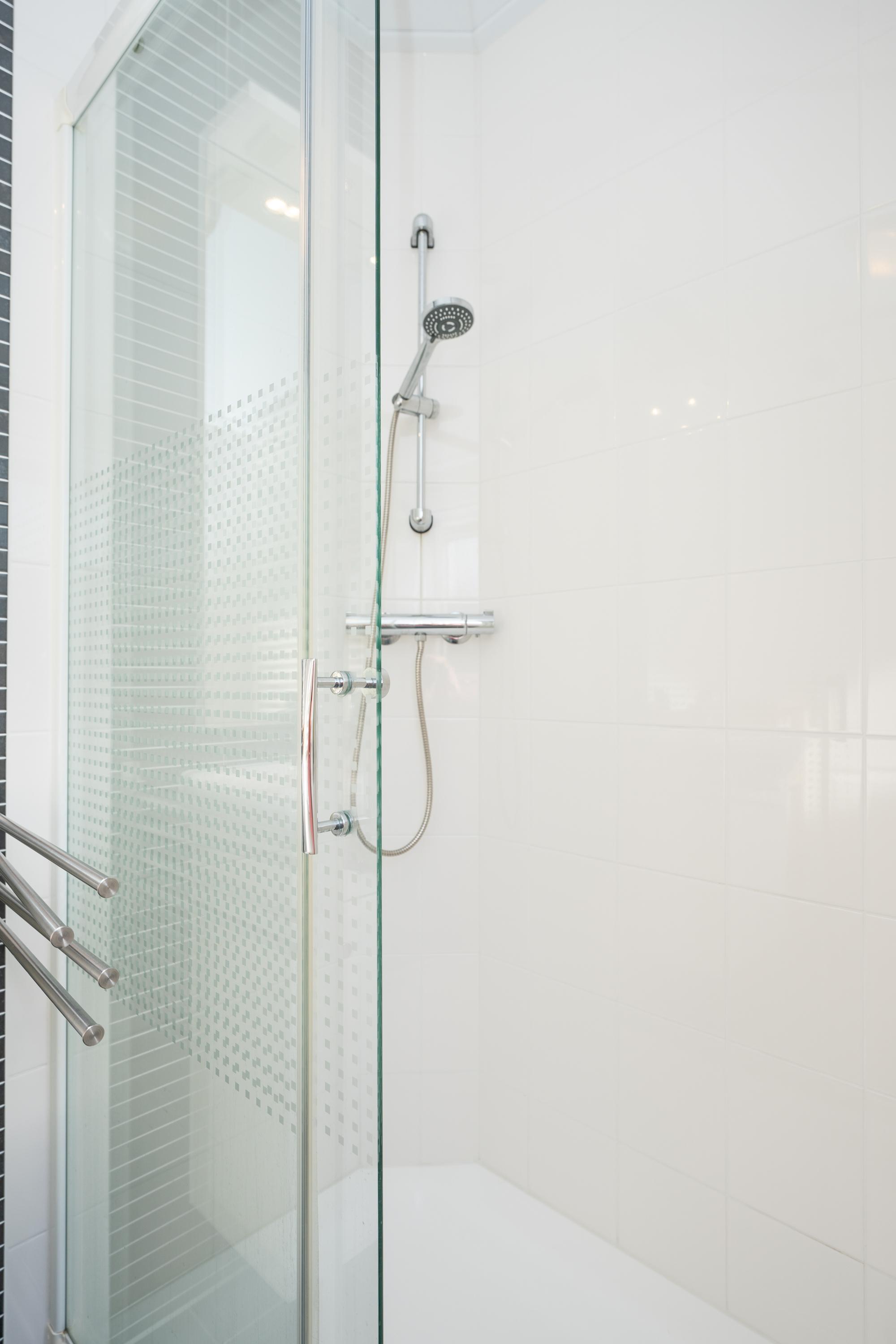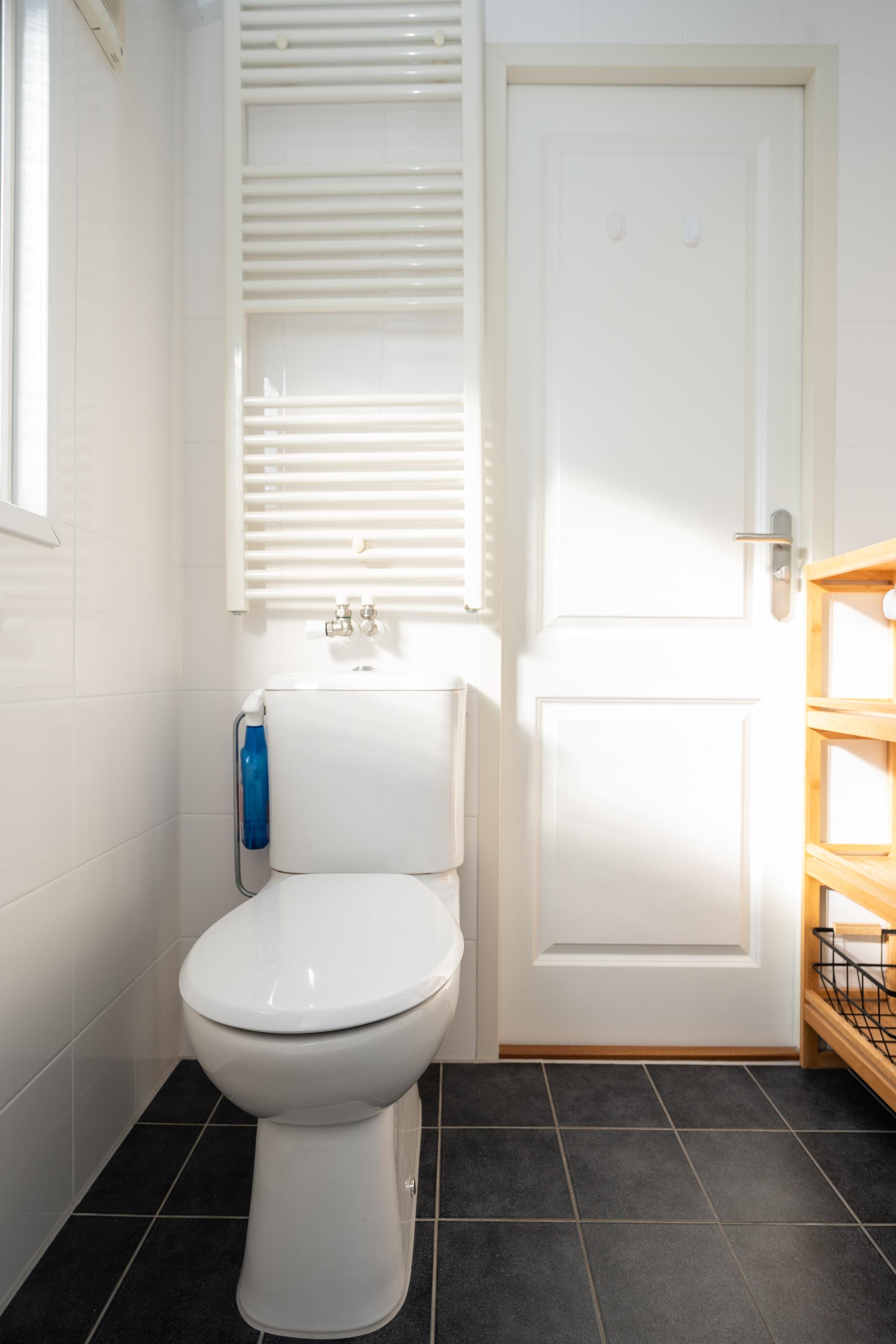 De nette badkamer is voorzien van een douchecabine, toilet, designradiator en een wastafel met meubel.