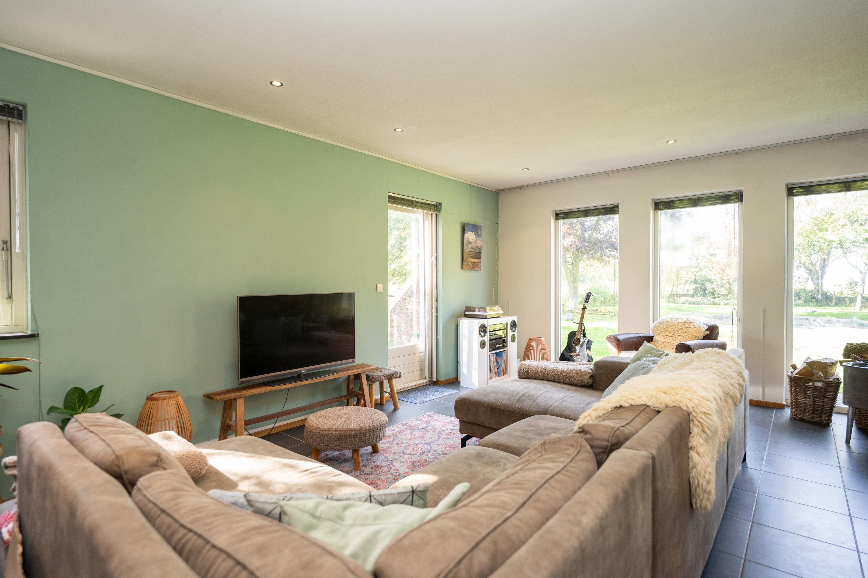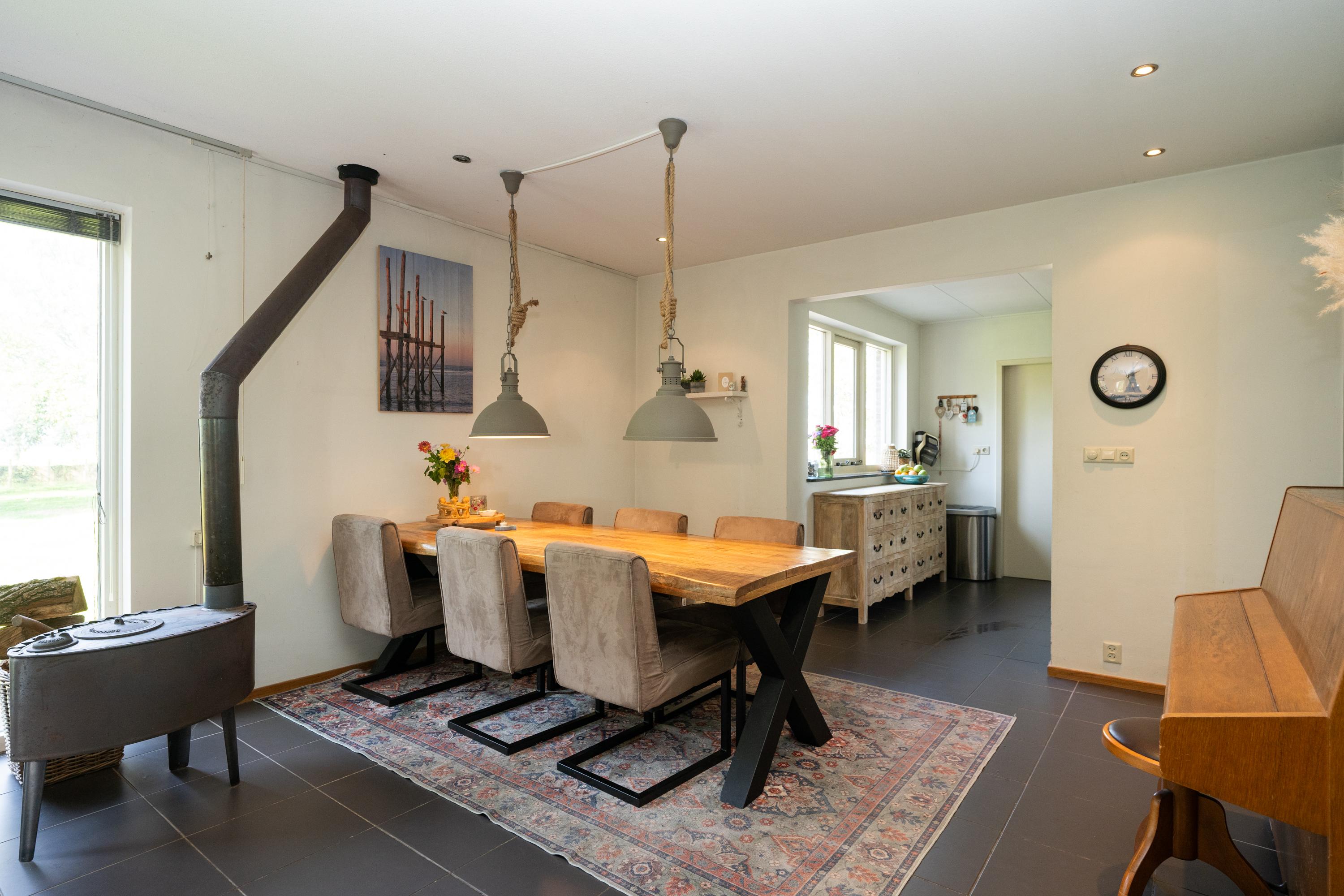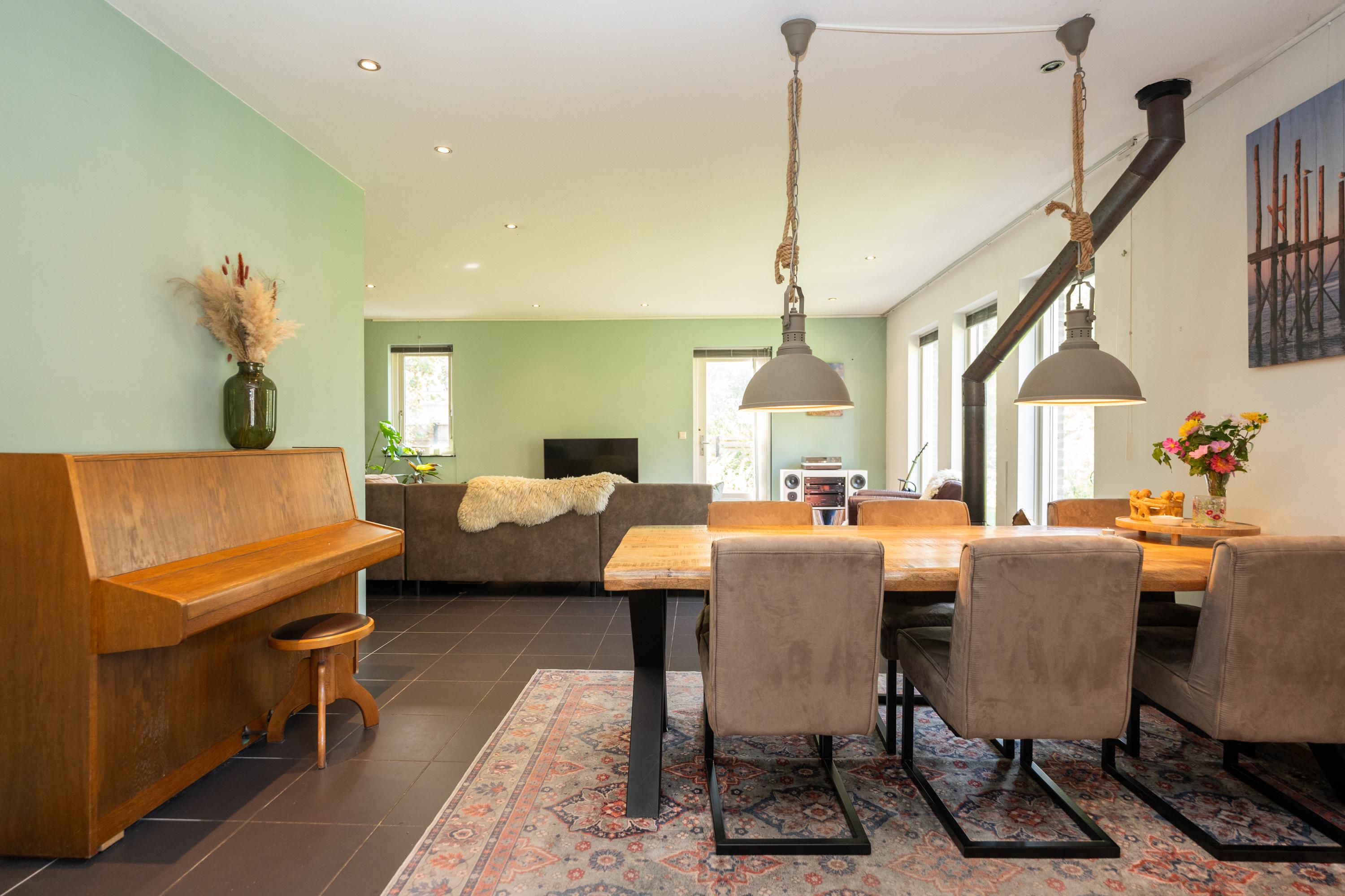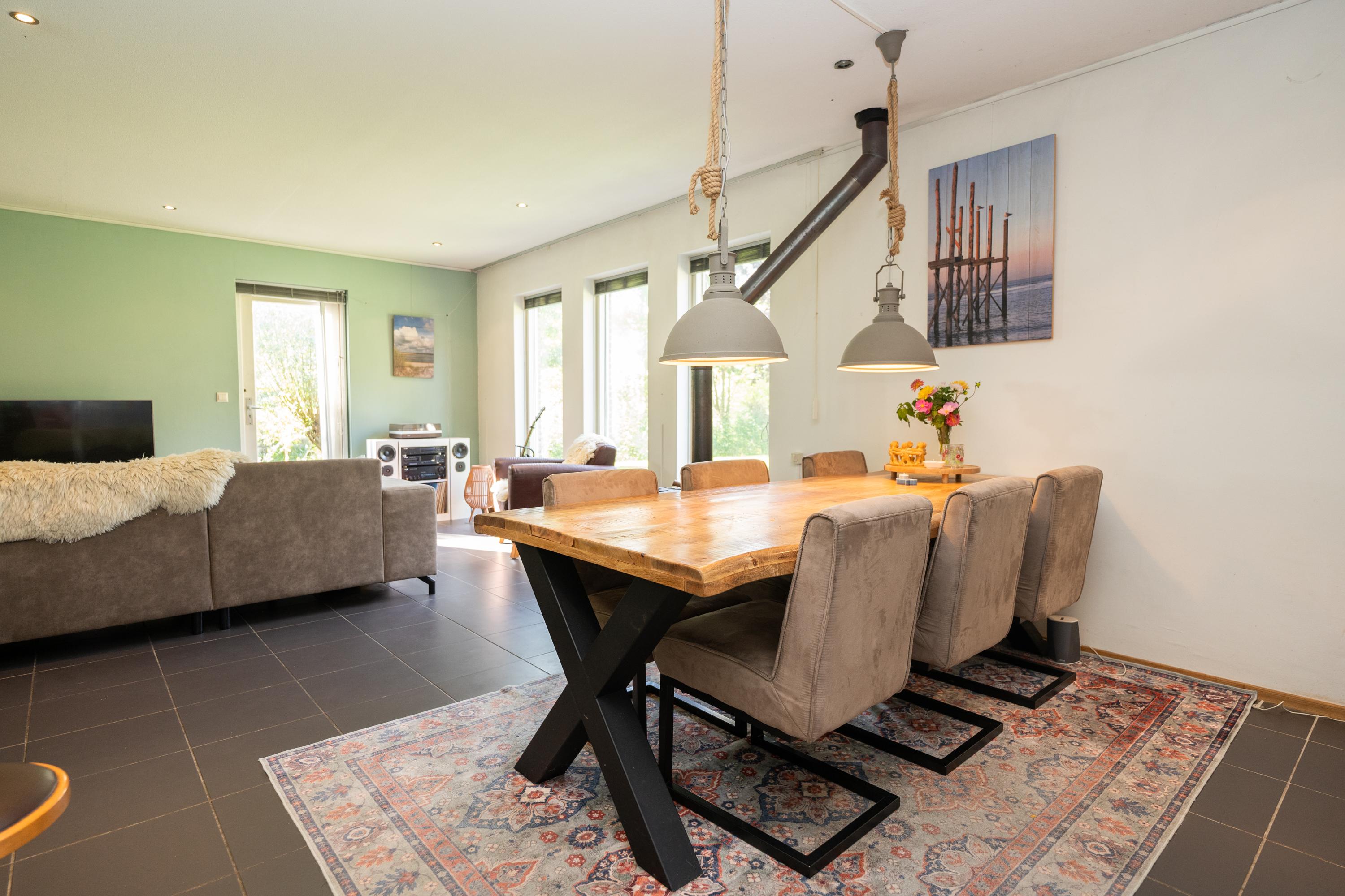 Bij binnenkomst valt direct de lichte en ruime woonkamer op, waar grote raampartijen zorgen voor een overvloed aan daglicht en een schitterend uitzicht over de groene achtertuin. De ruimte ademt gezelligheid, mede dankzij de sfeervolle houtkachel.