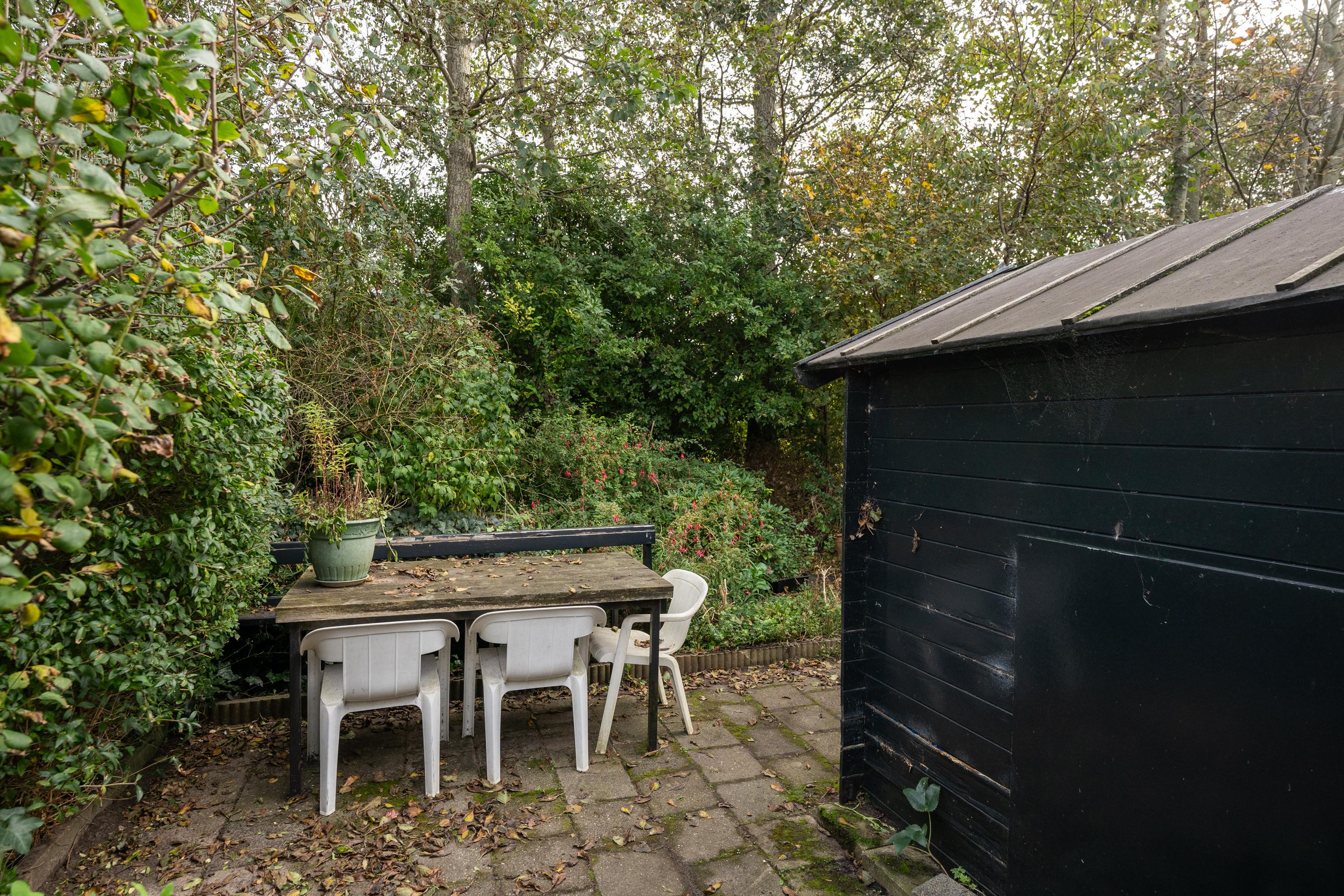 Verder treft u een houten tuinhuisje aan, perfect voor het opbergen van (tuin) gereedschap of een fiets.