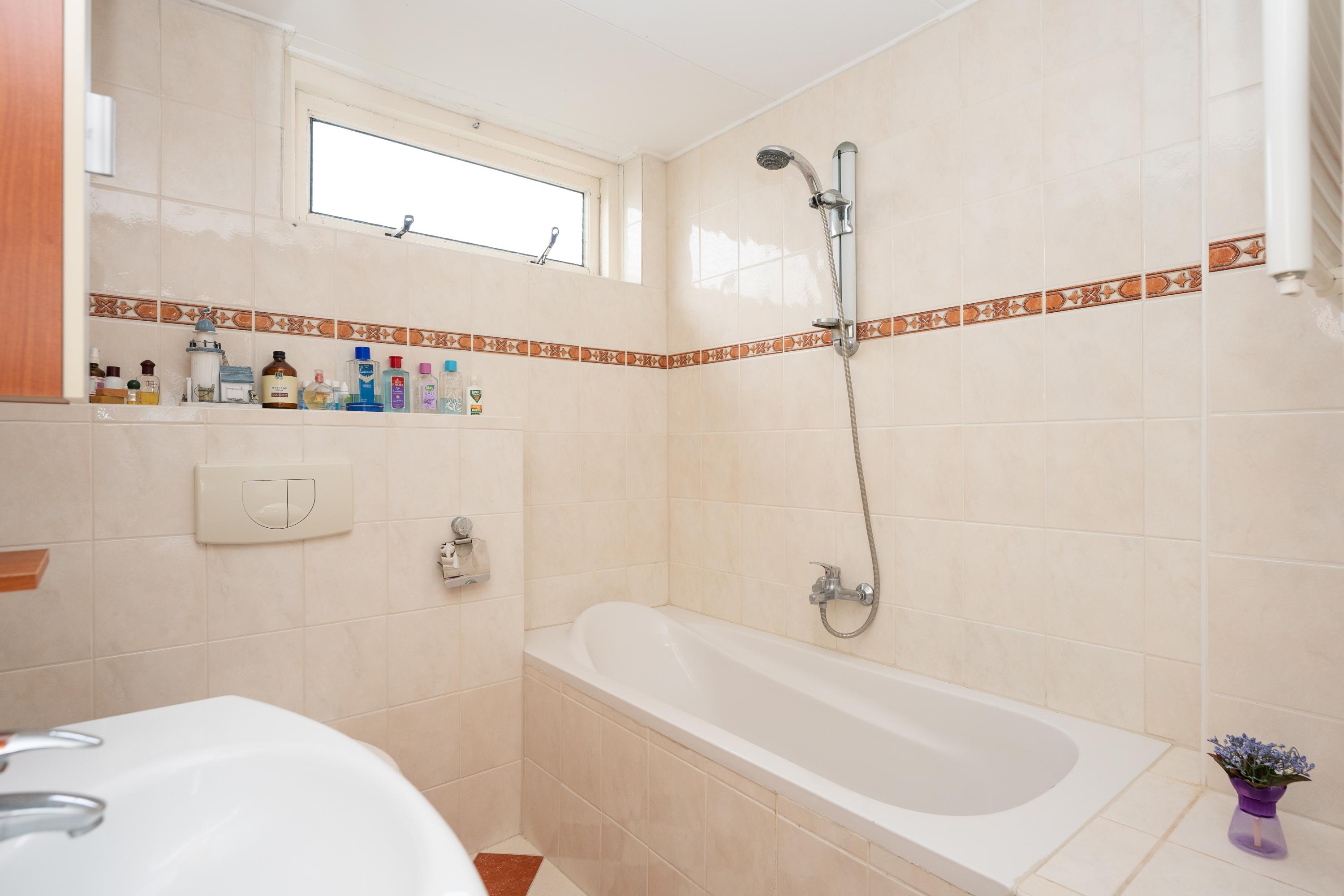 De badkamer is voorzien van een ligbad met douche, toilet en wastafelmeubel.