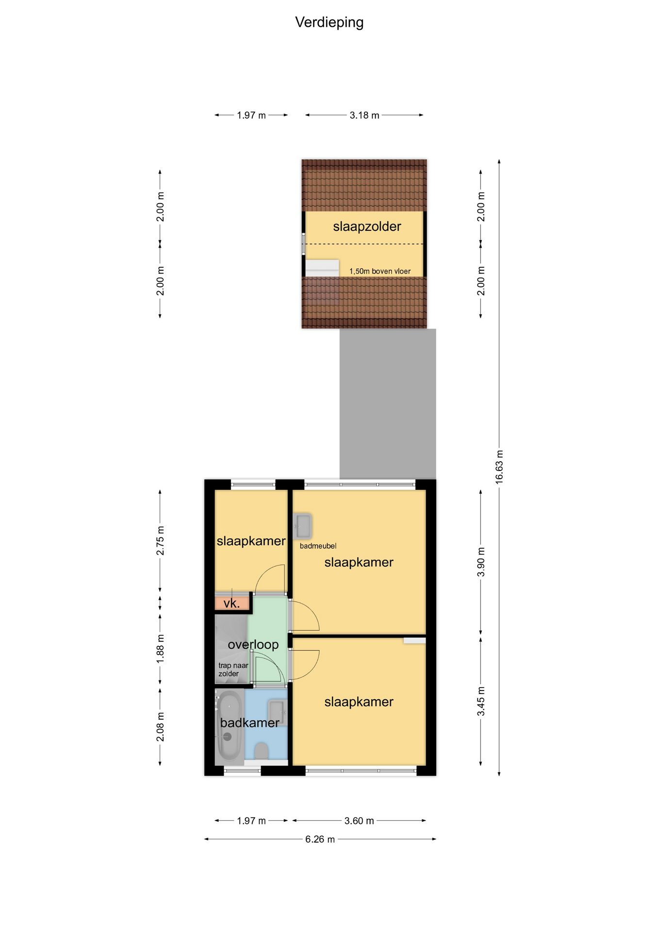 2e verdieping | Via een vaste trap bereikt u de tweede verdieping. Hier vindt u nog twee slaapkamers en tweede badkamer en een ruime bergruimte. Eén van de slaapkamers beschikt over een dakkapel, wat zorgt voor extra licht en ruimte.