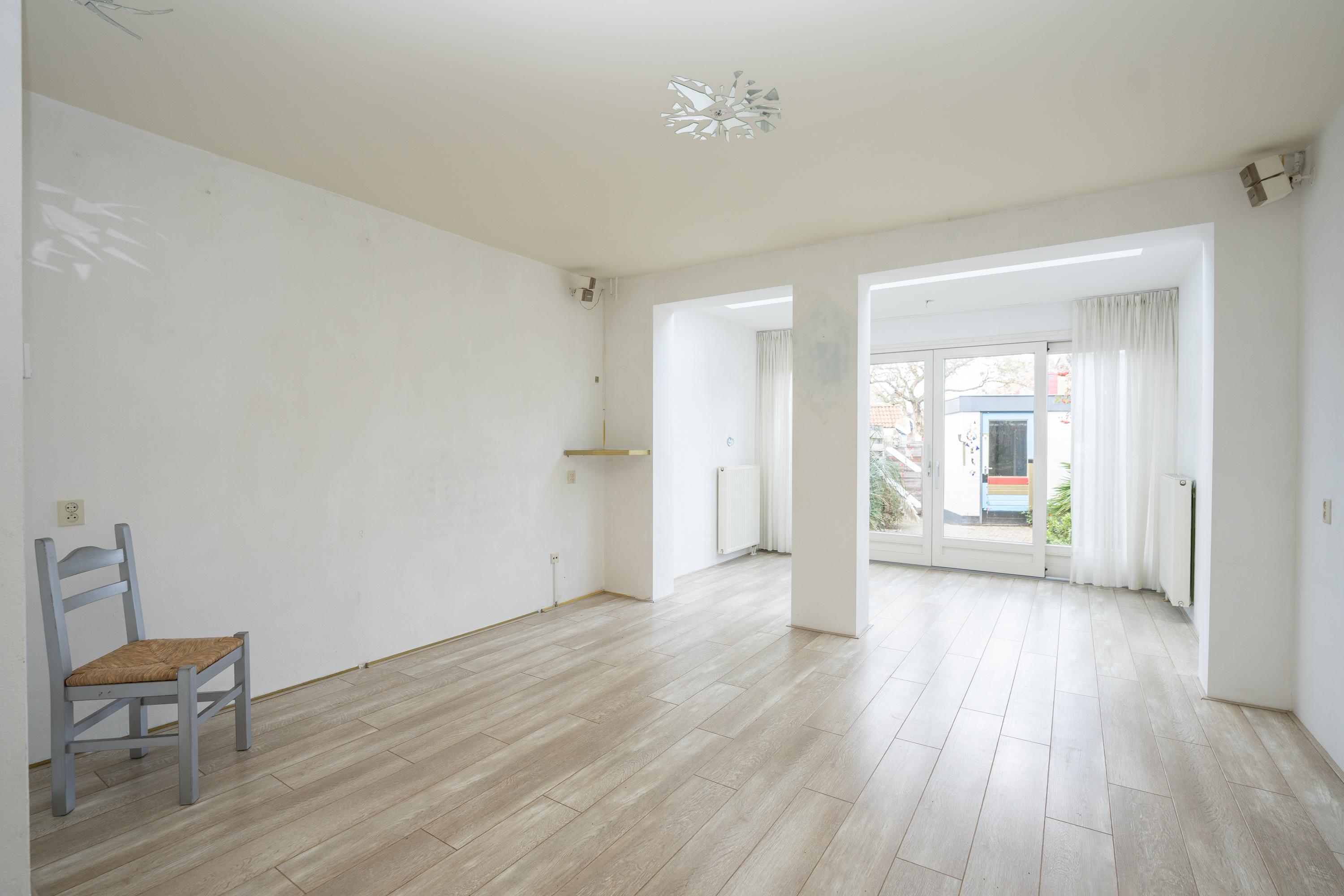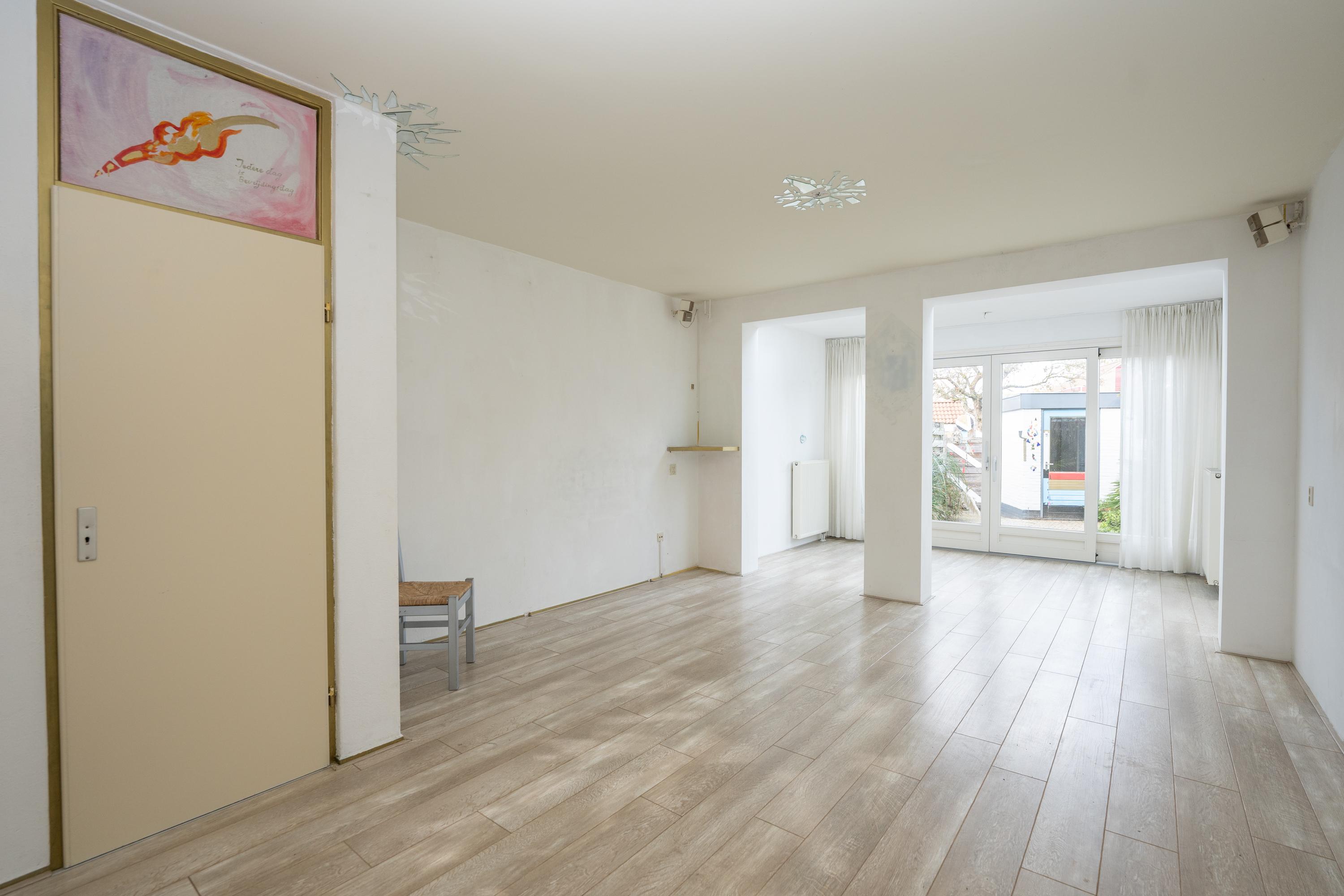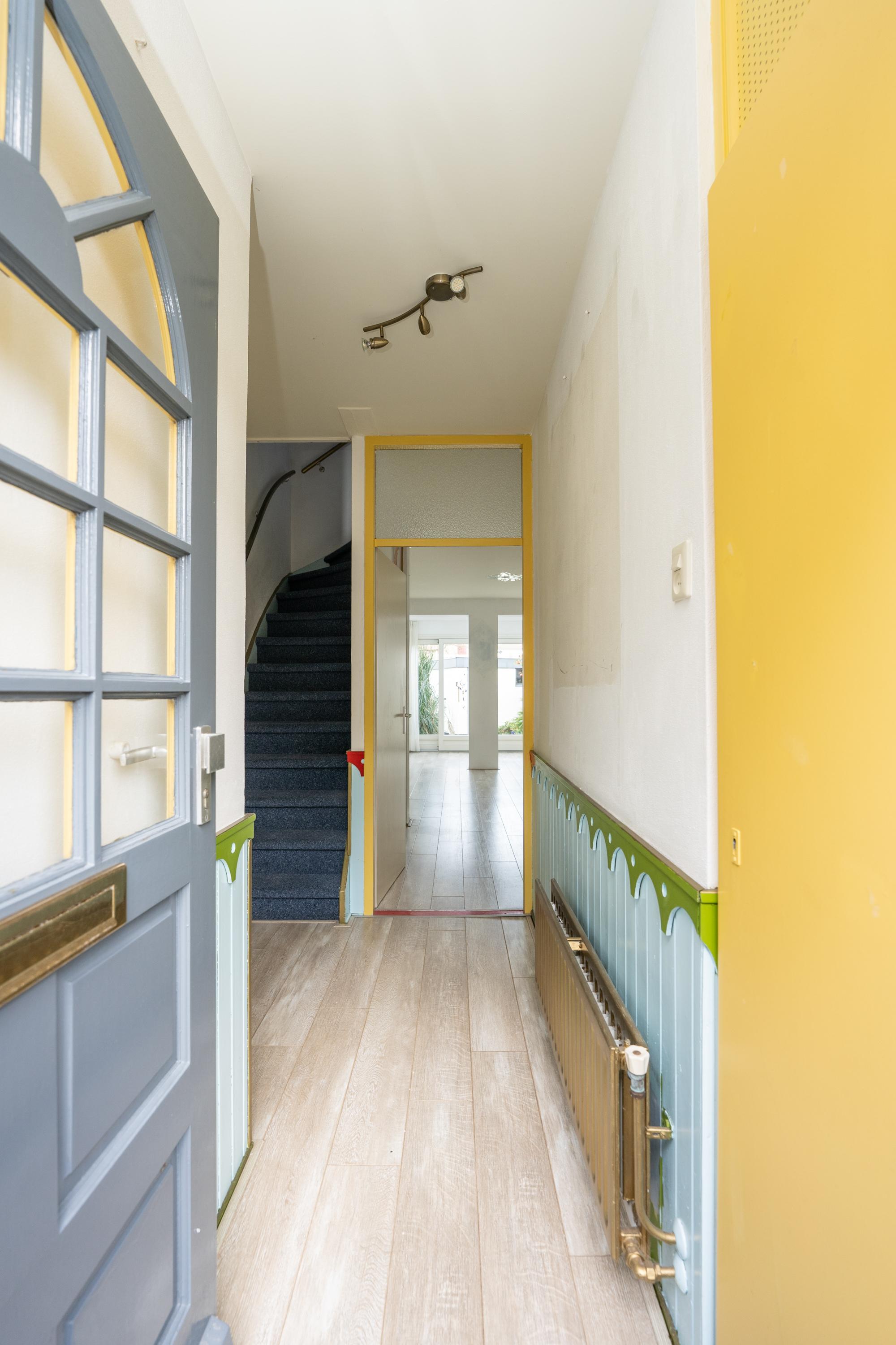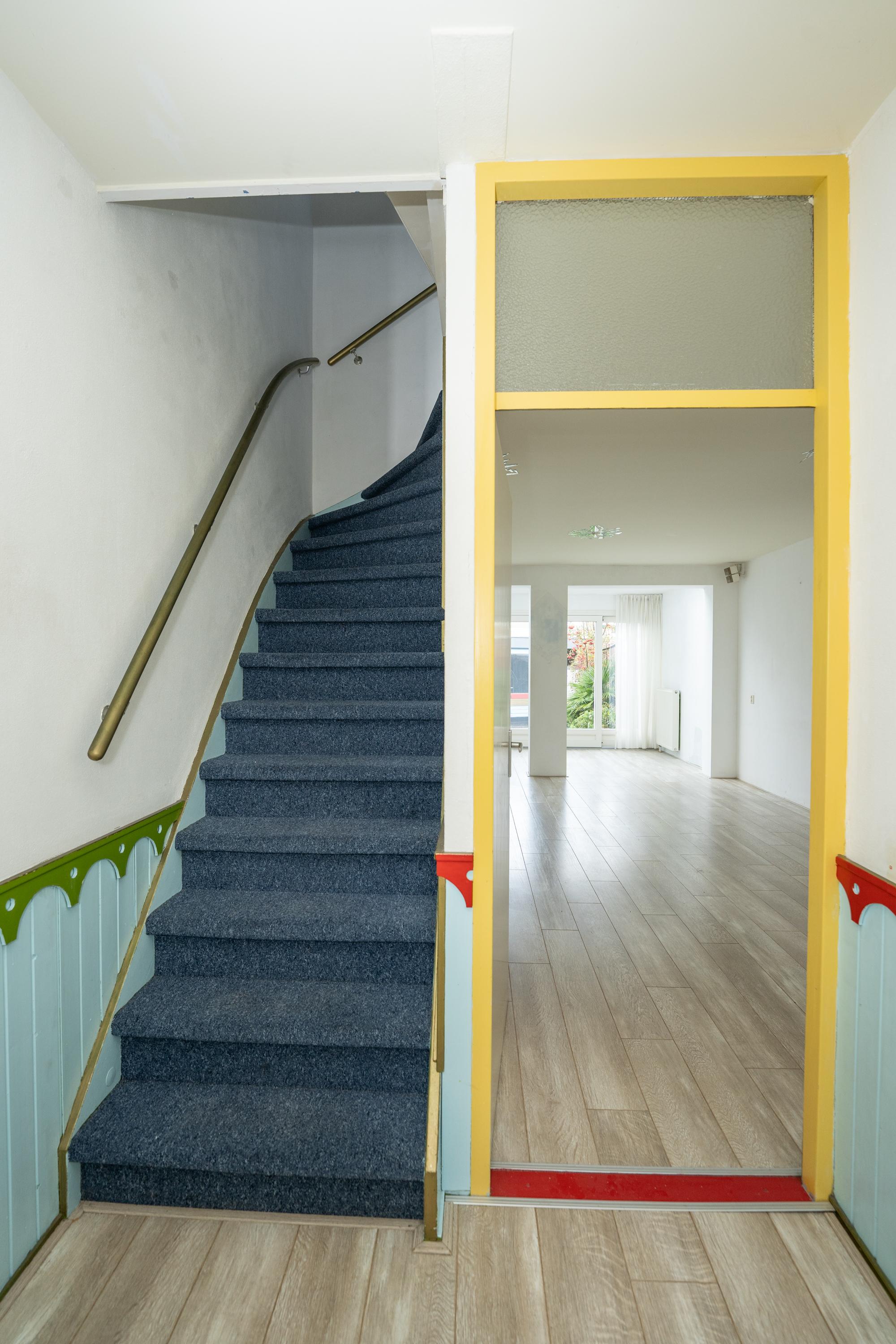 De entree biedt toegang tot de hal met toilet, trapopgang en een doorloop naar de lichte woonkamer.