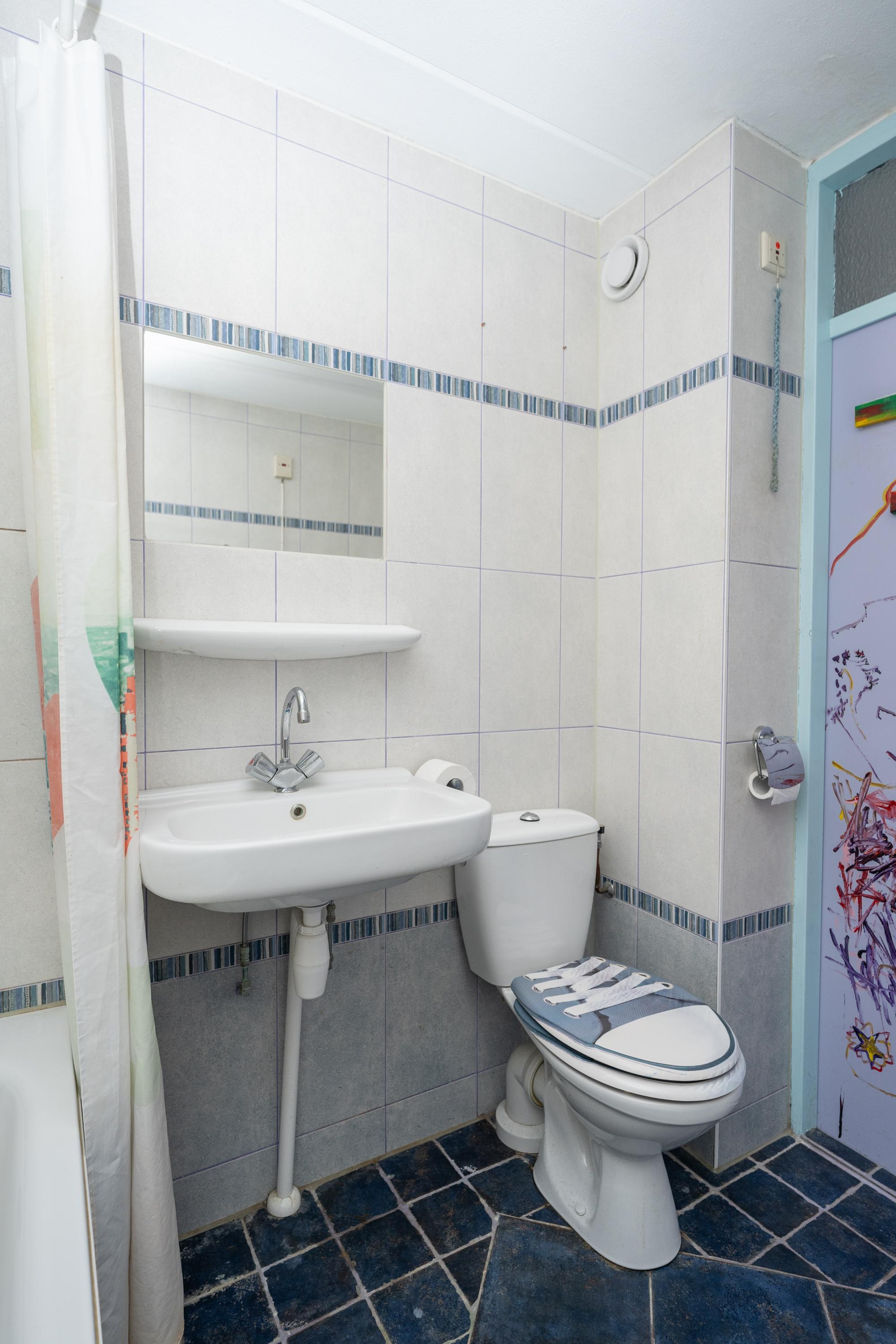 De frisse badkamer is voorzien van een toilet, wastafel en een ligbad met douche.