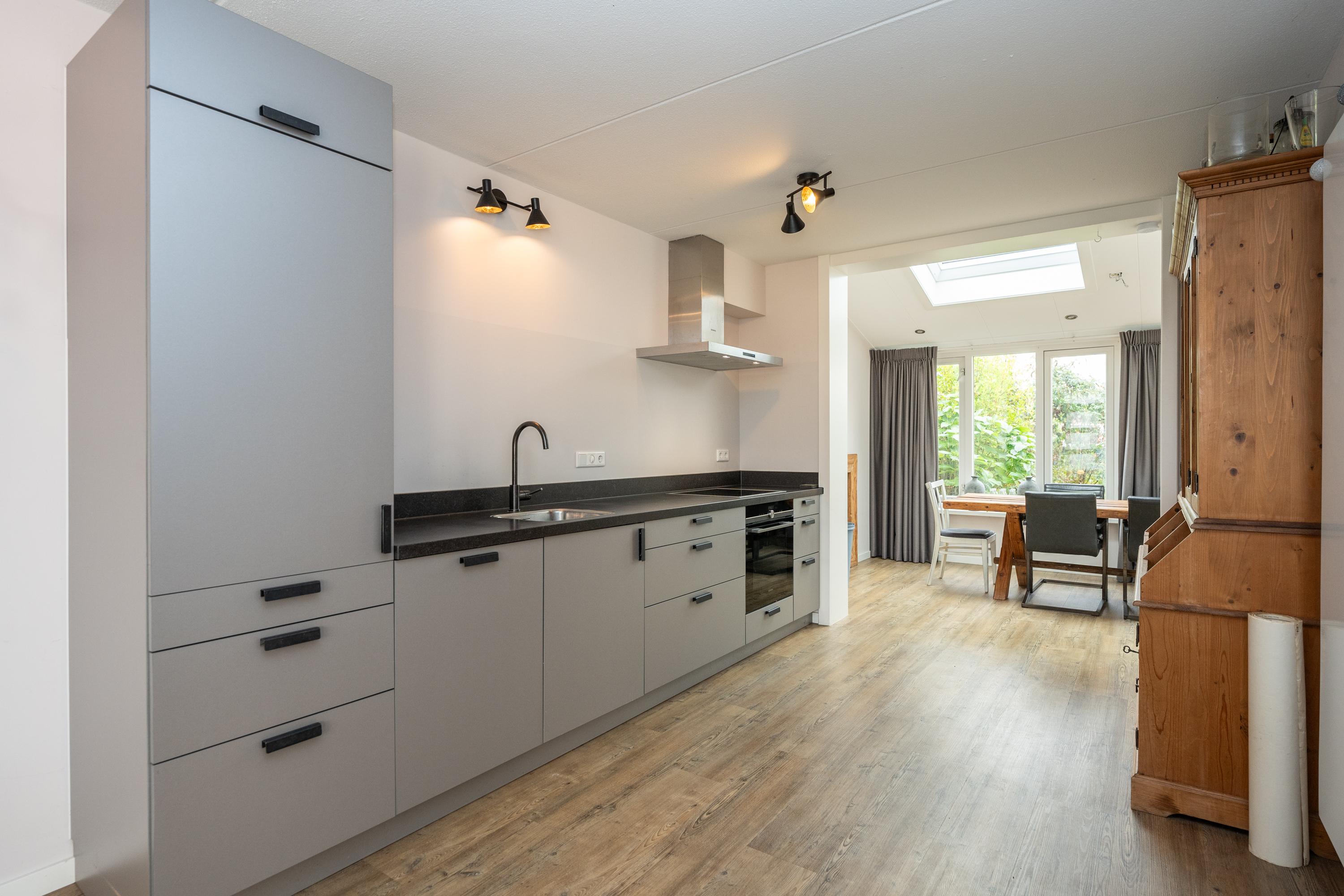 De stijlvolle keuken ligt prominent in het midden van de woning en is voorzien van diverse inbouw apparatuur.