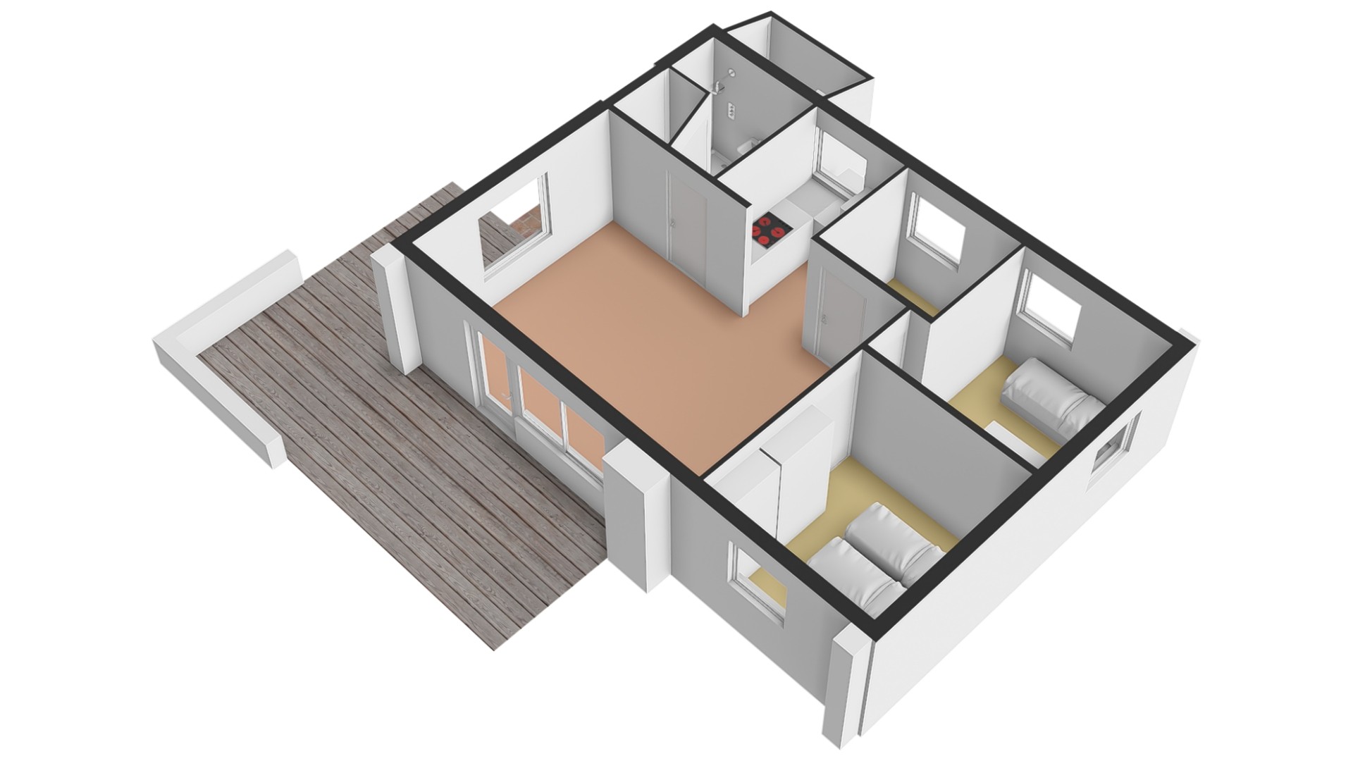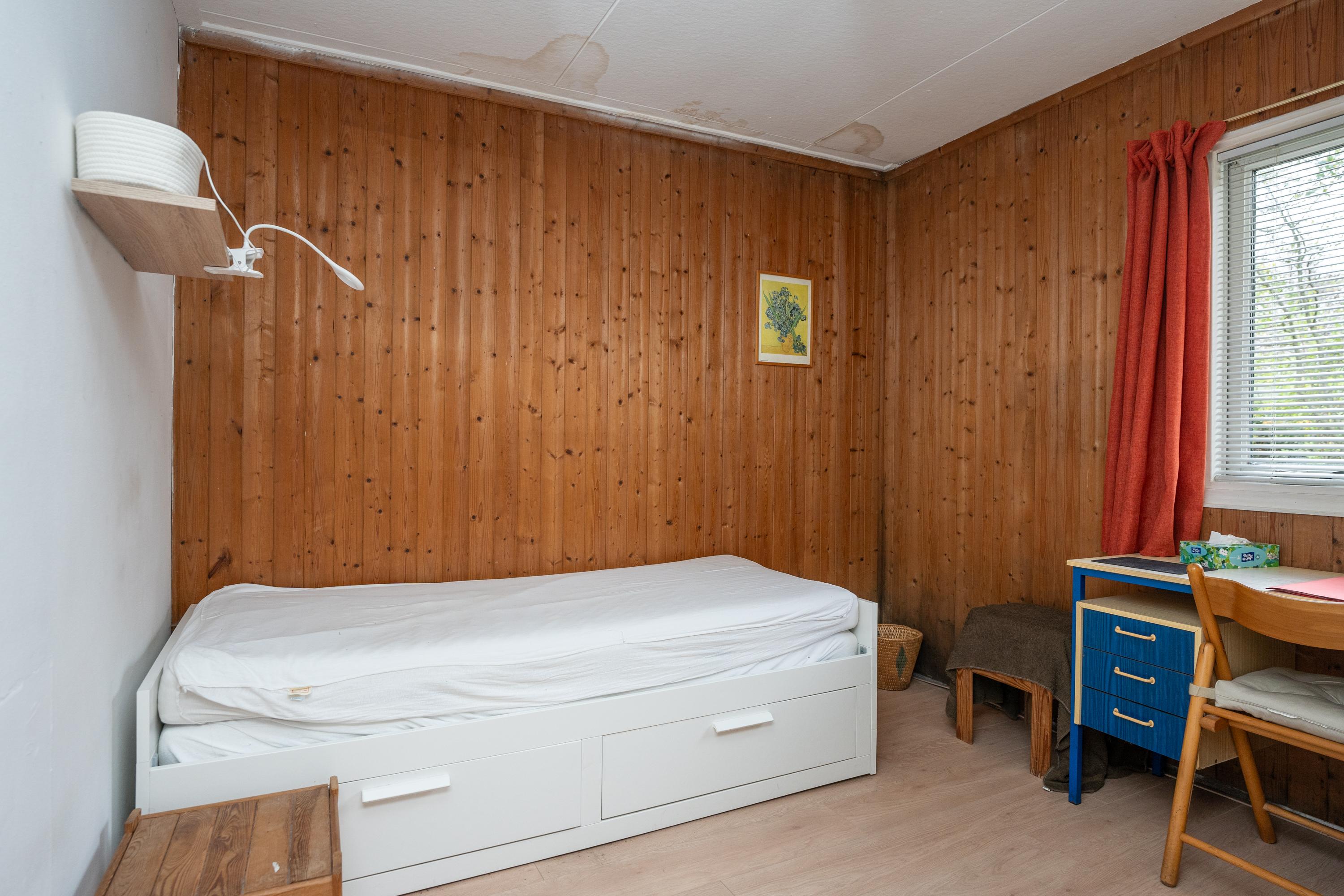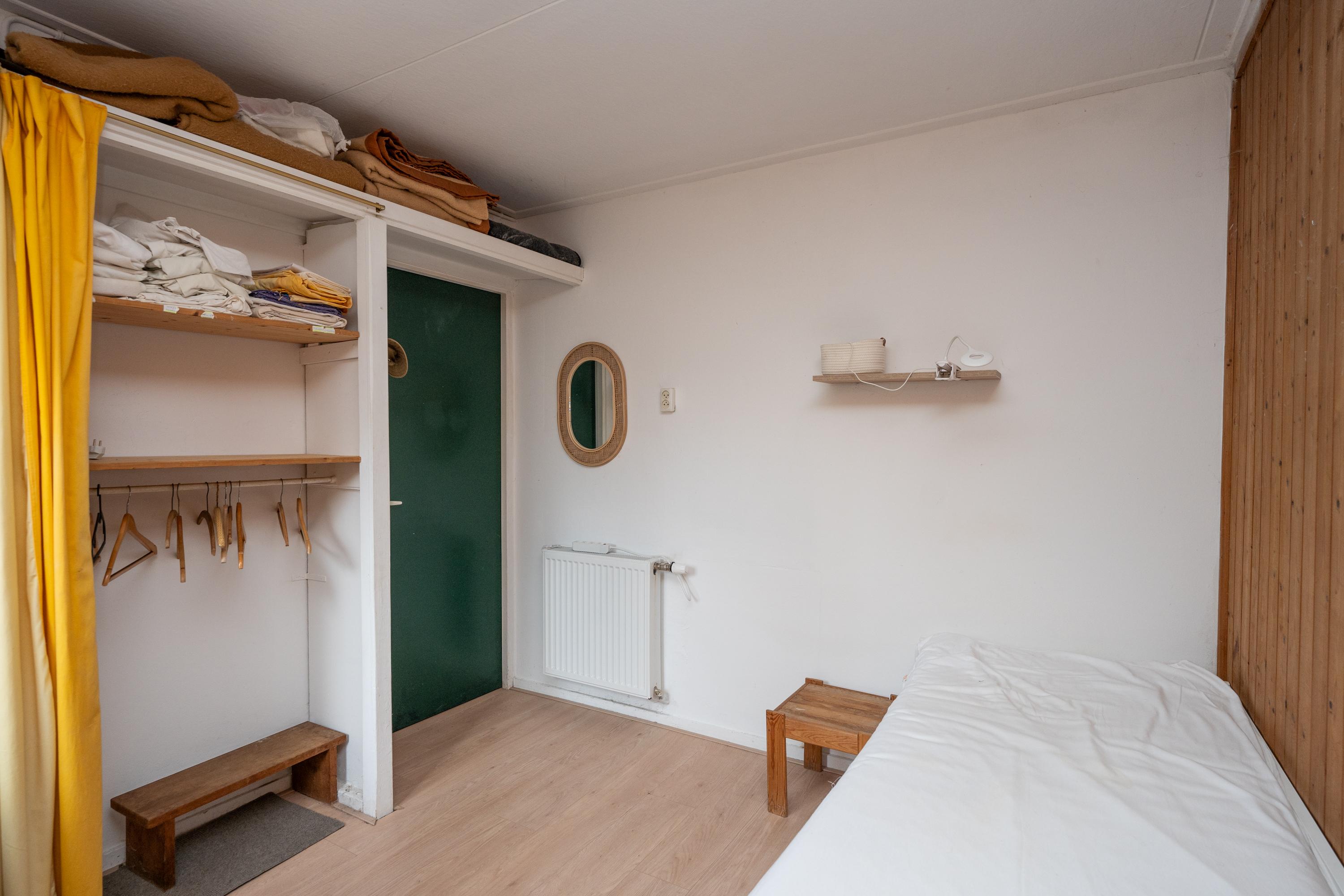 De woonkamer staat in verbinding met de keuken, de badkamer en 3 slaapkamers. De eenvoudige badkamer heeft een doucheruimte met harmonicadeur, wastafel en toilet. In de kleinste slaapkamer staat een eenpersoonsbed. In de 2 andere slaapkamers staan eenpersoonsbedden met een extra onderbed voor een 2de persoon.