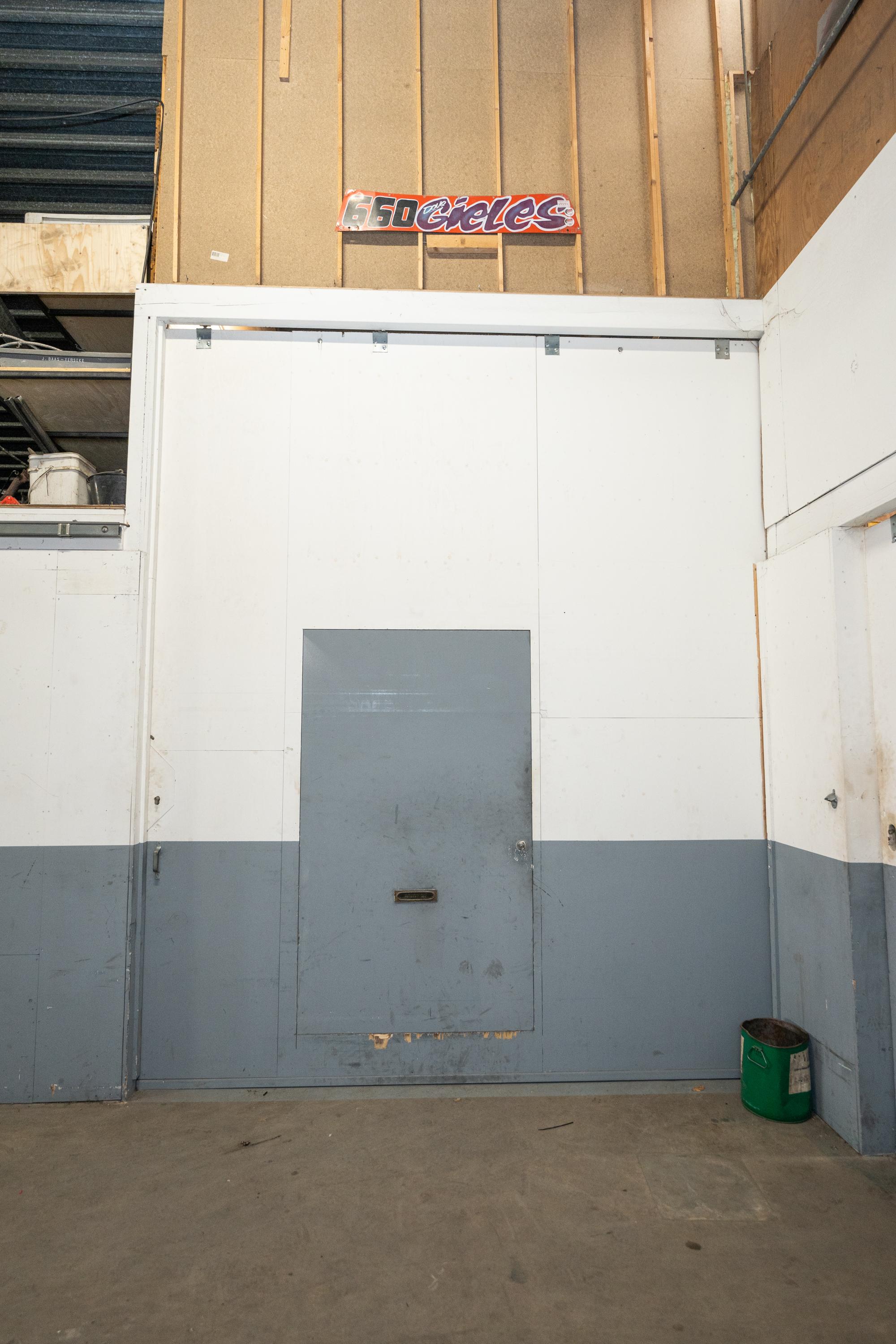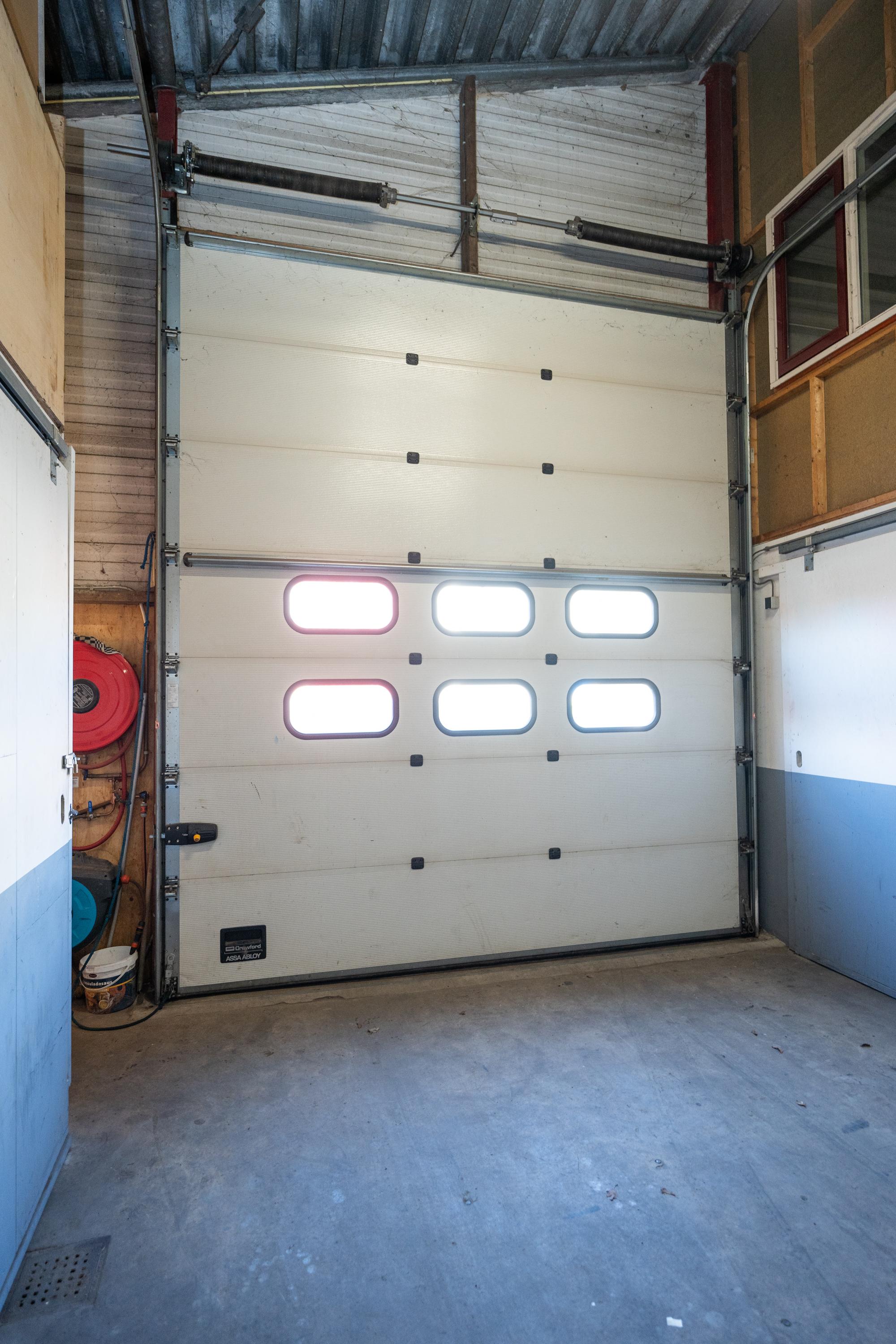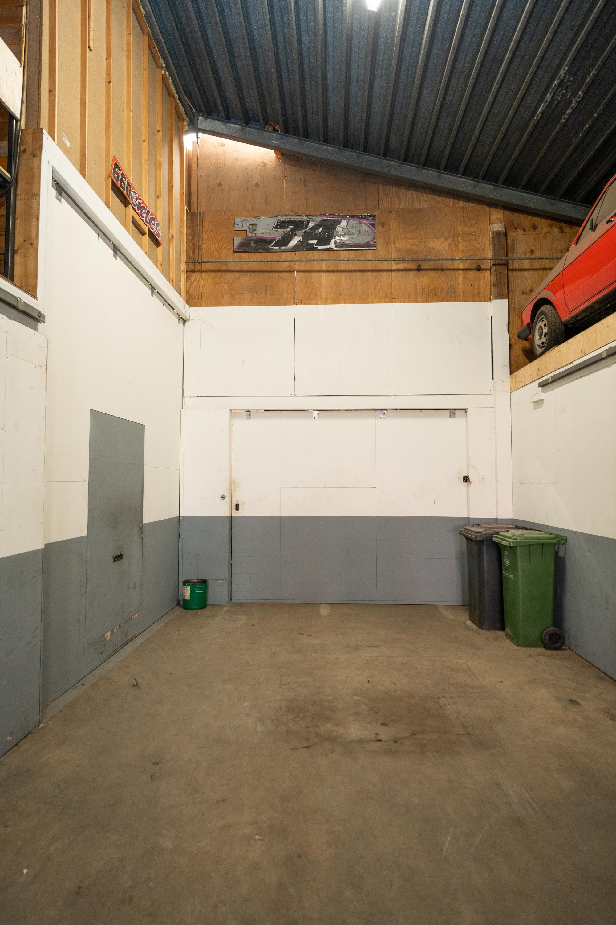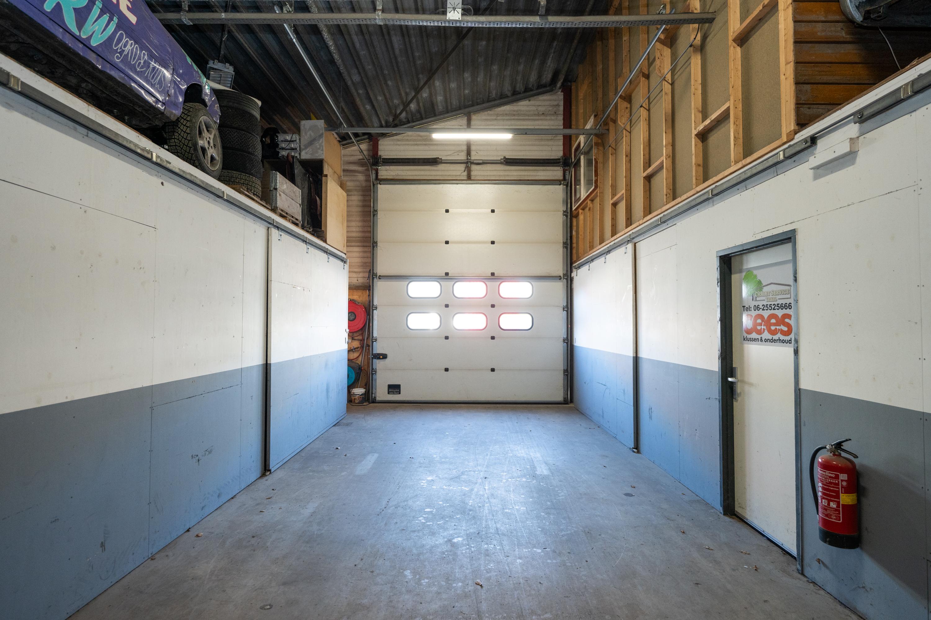 De brede roldeur en royale hoogte maken het object uitstekend geschikt voor opslag, werkplaats en stalling.