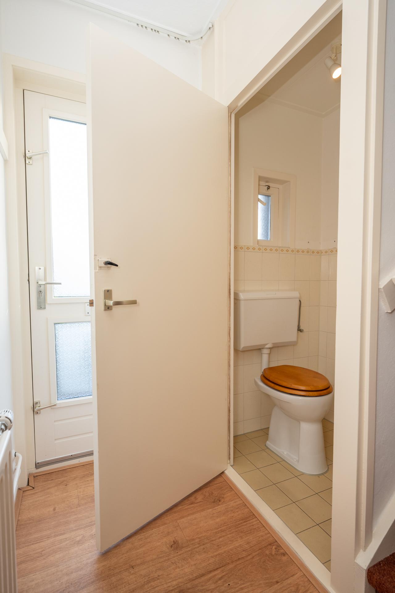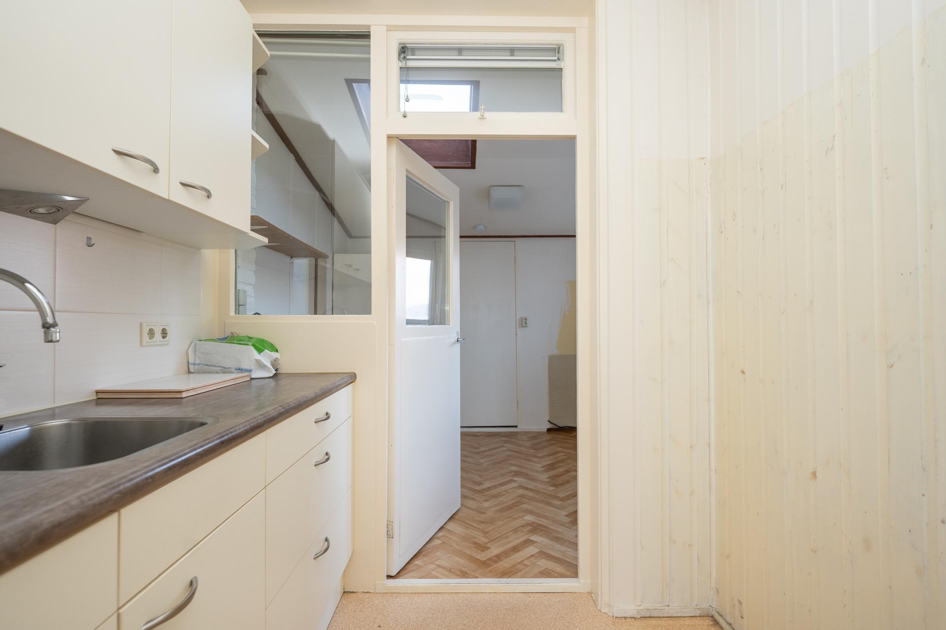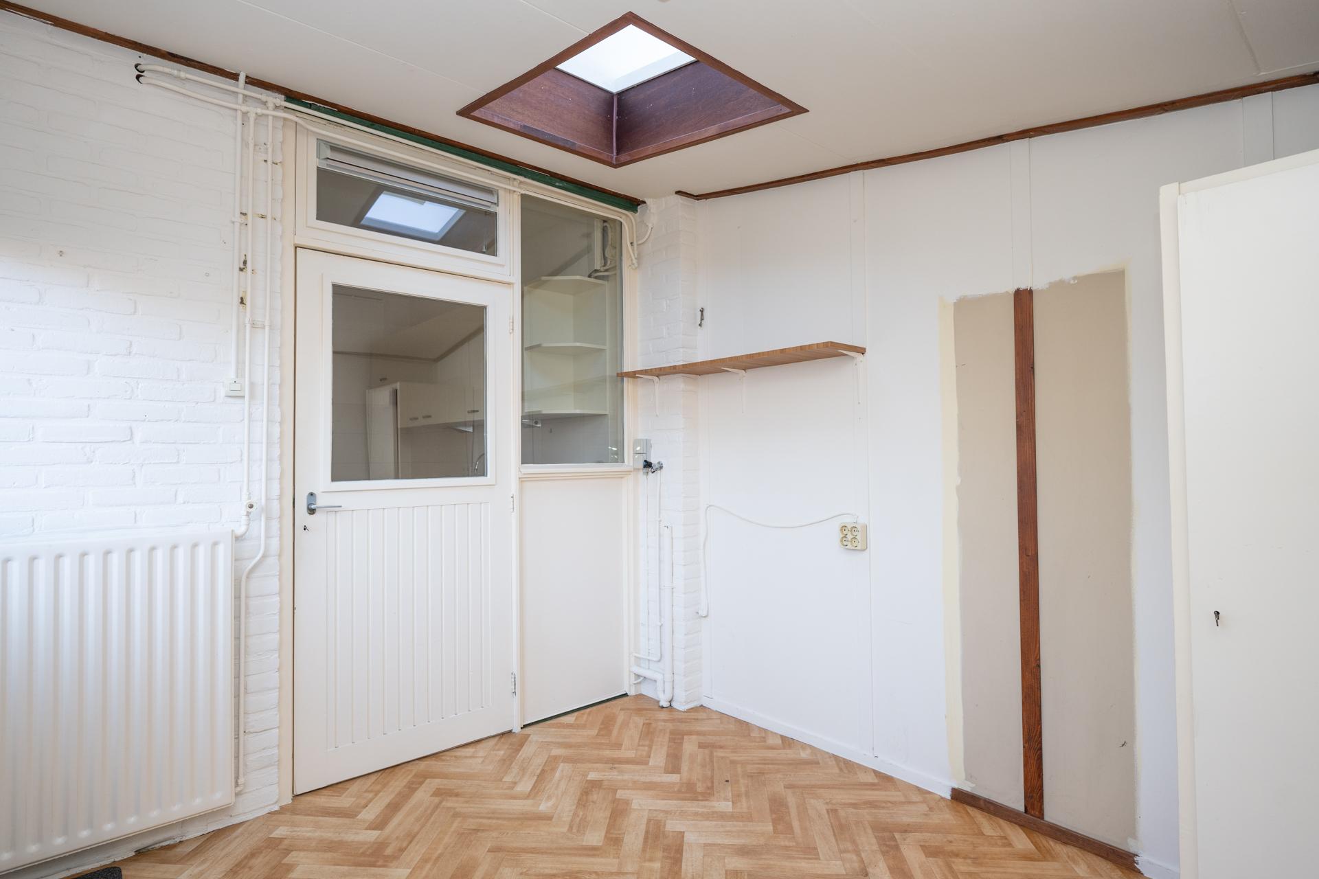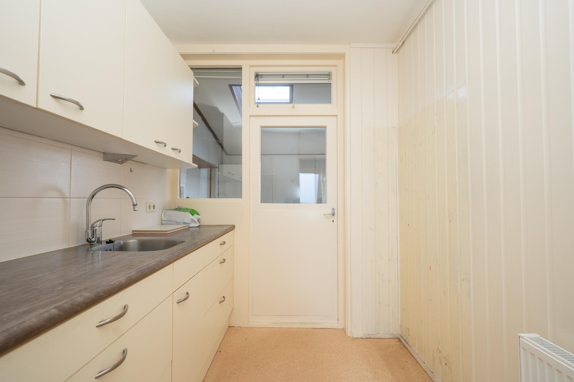 De aangebouwde bijkeuken is praktisch en licht door de aanwezige lichtkoepel. Vanuit de bijkeuken is er toegang tot de achtertuin en een doorloop naar de berging.