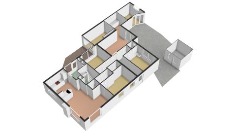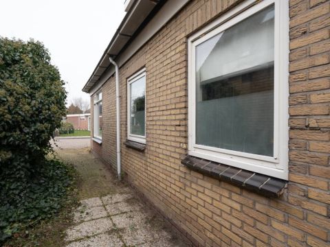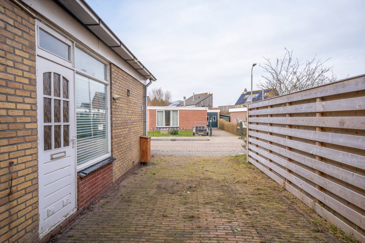 De zijkant van de woning is bestraat, hier bevindt zich de entree en toegang tot een slaapkamer.