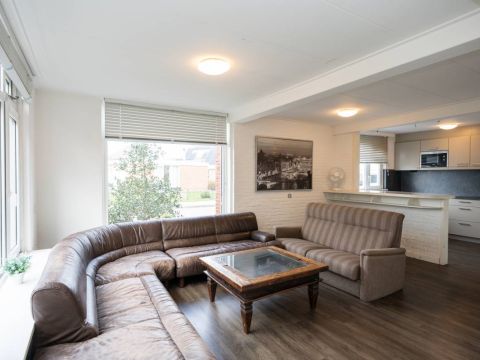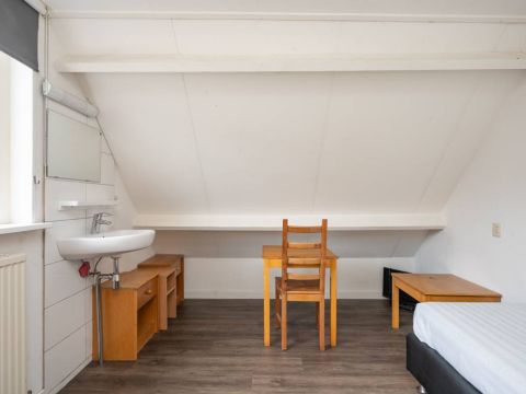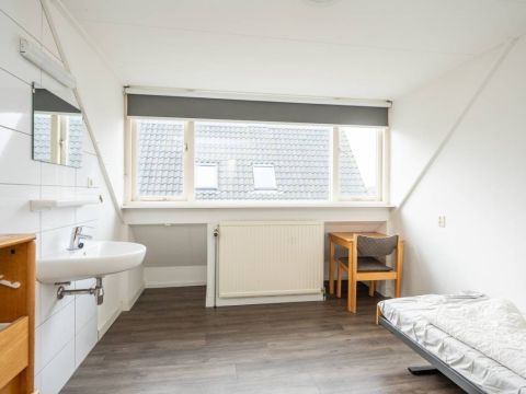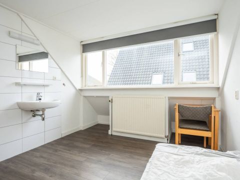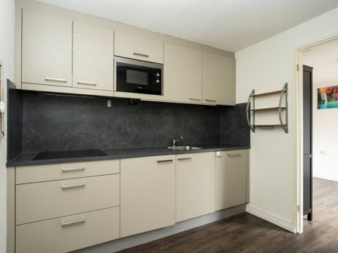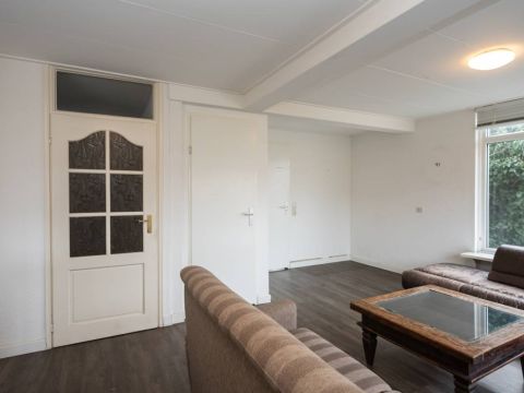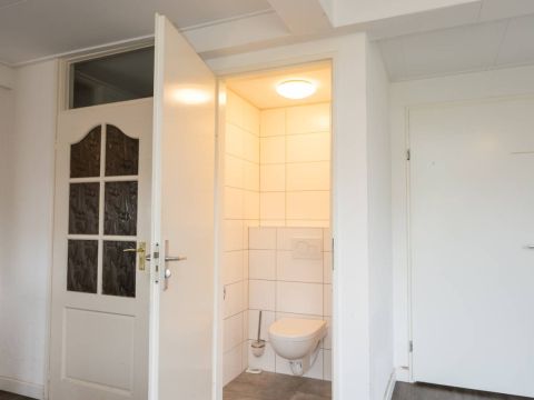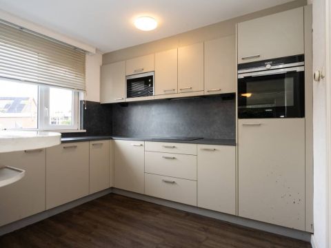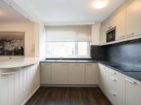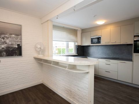 De woonkamer is aan de voorkant gelegen en middels de grote raampartijen is er een fijne lichtinval. De halfopen keuken is gescheiden door een bar. Via de woonkamer is er toegang tot een toilet en doorloop naar een slaapkamer met eigen badkamer.