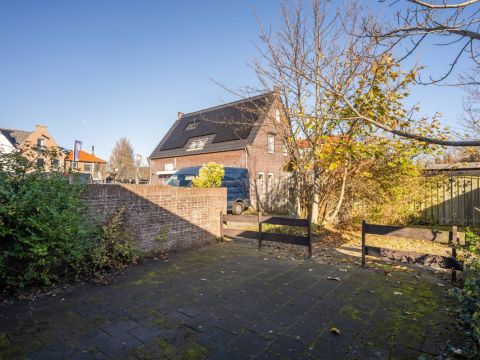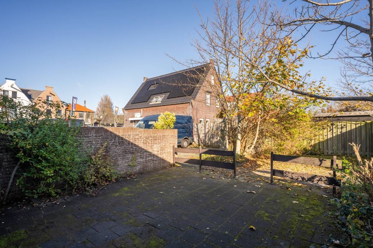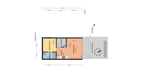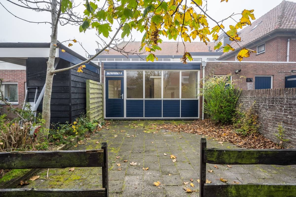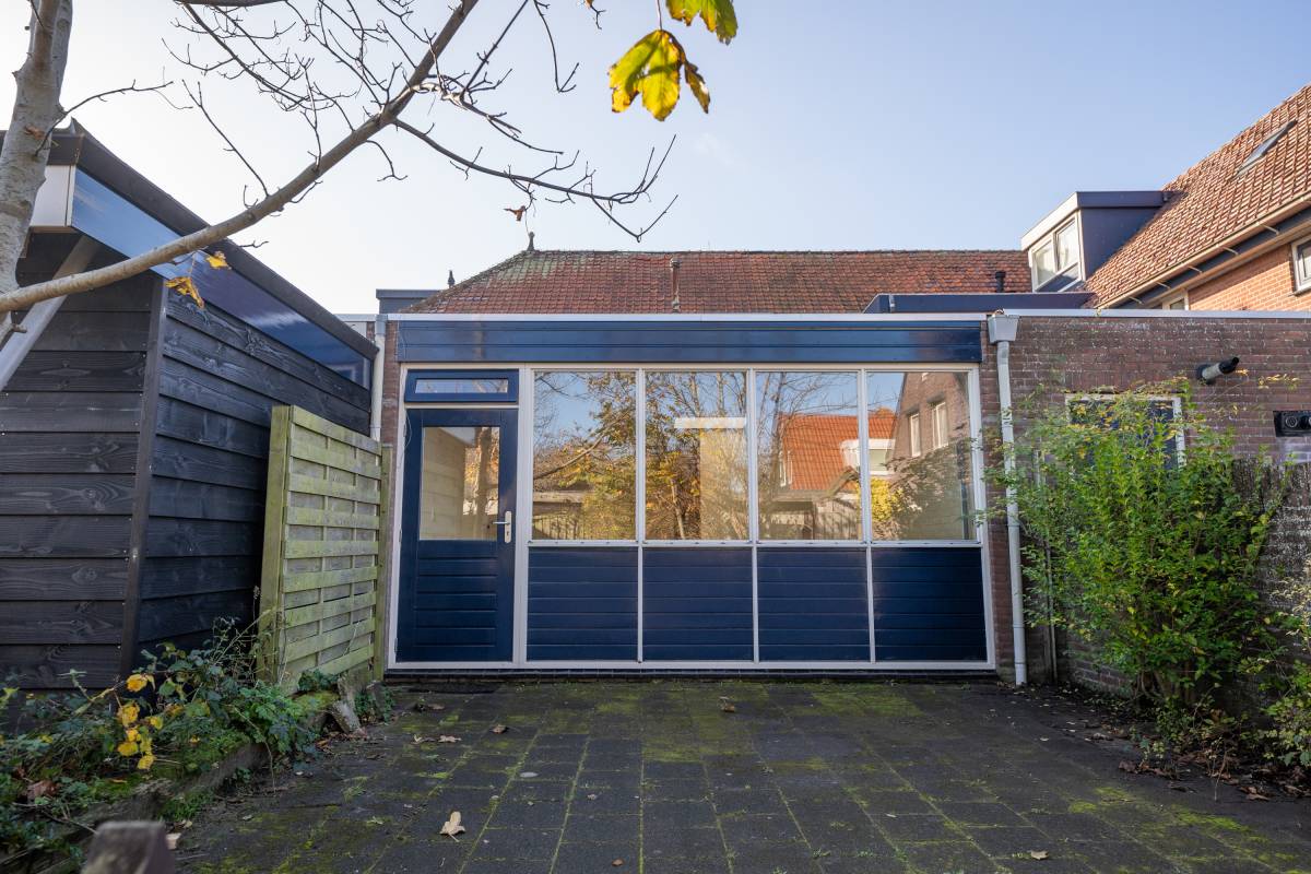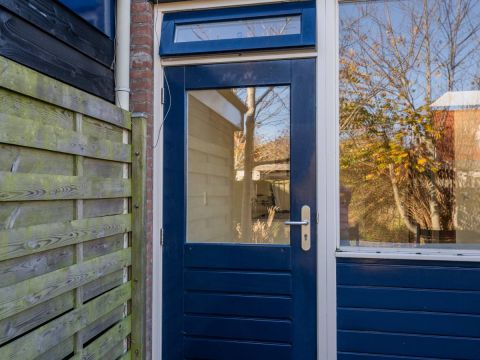 Via de openslaande deur is de bestraatte tuin bereikbaar. Parkeren kan op het gezamenlijke parkeerterrein.
