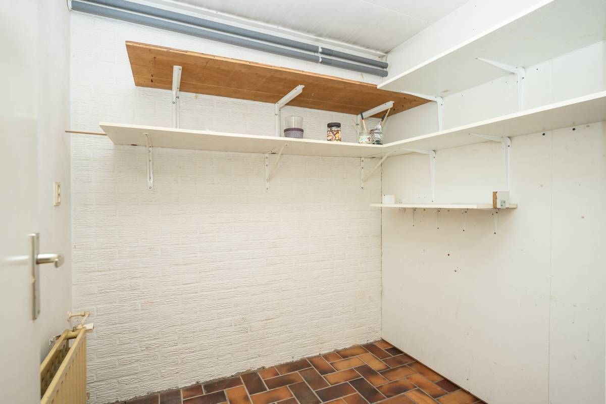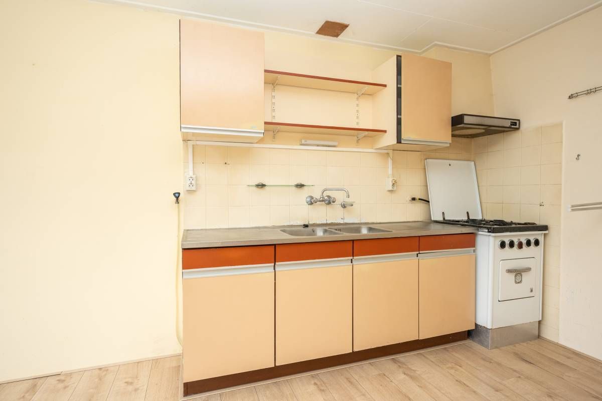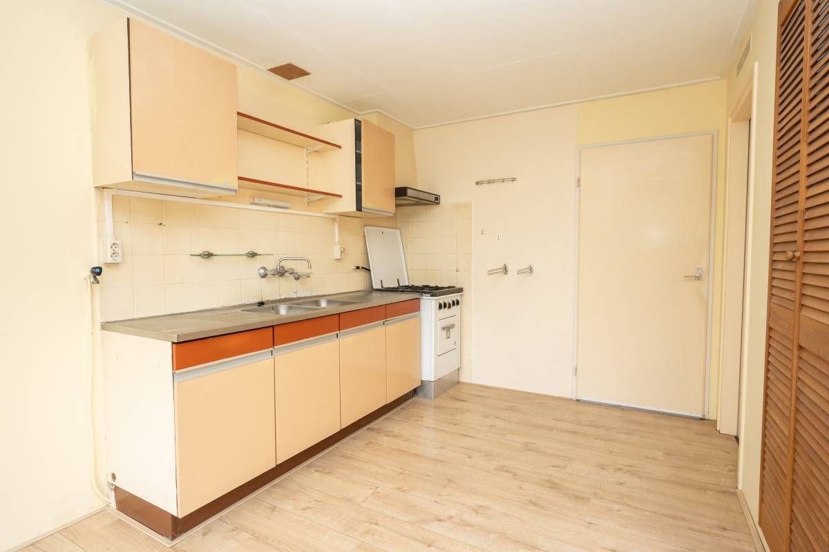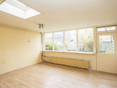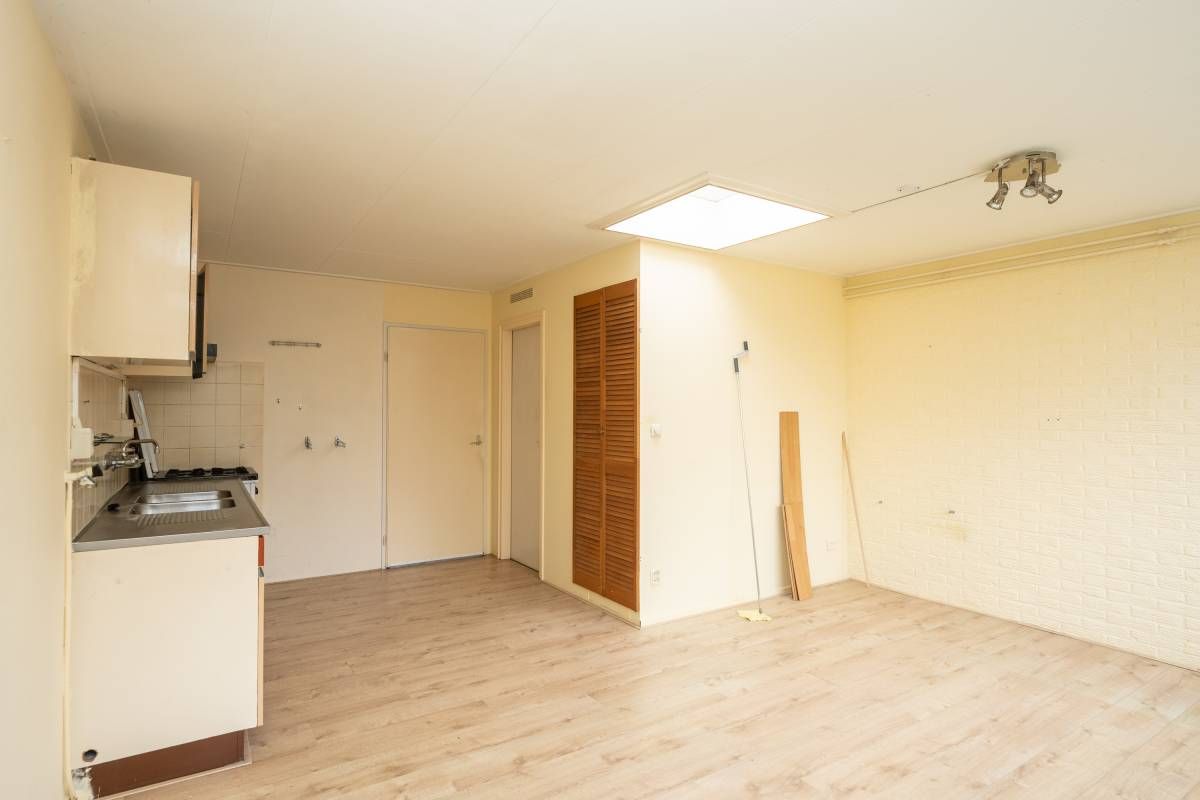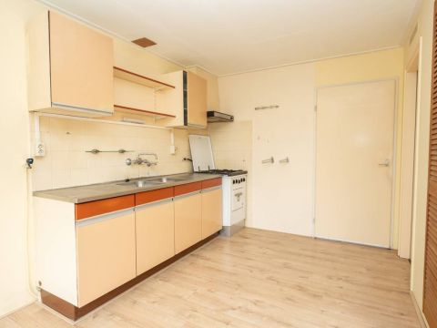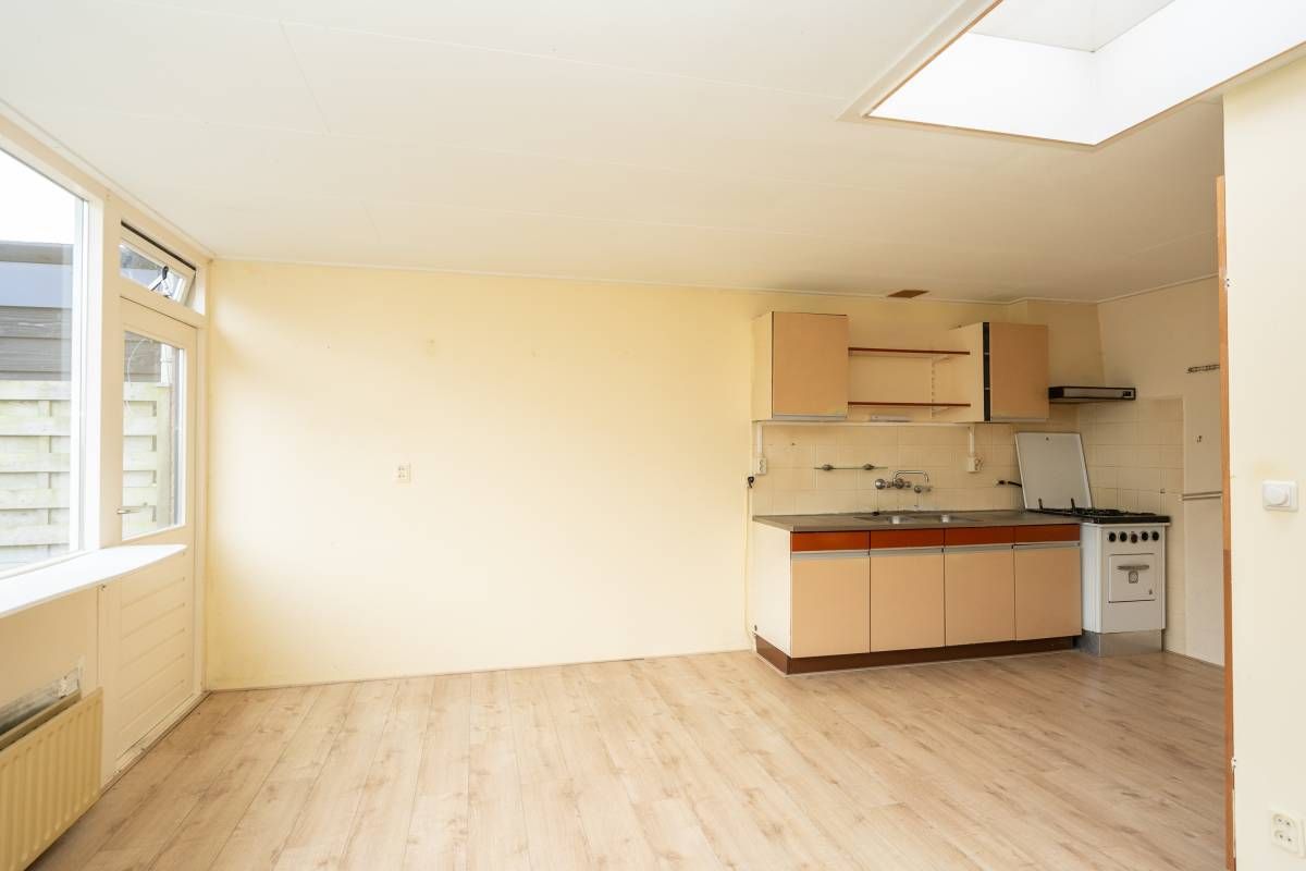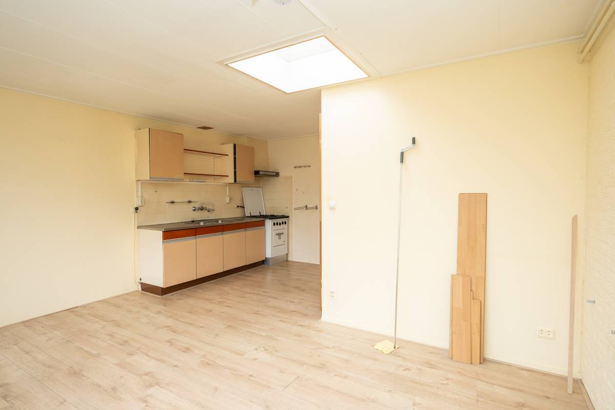 De ruime woonkamer is voorzien van een nette laminaatvloer en heeft een eenvoudig keukenblok. Via de keuken is de aansluitende inpandige berging bereikbaar.