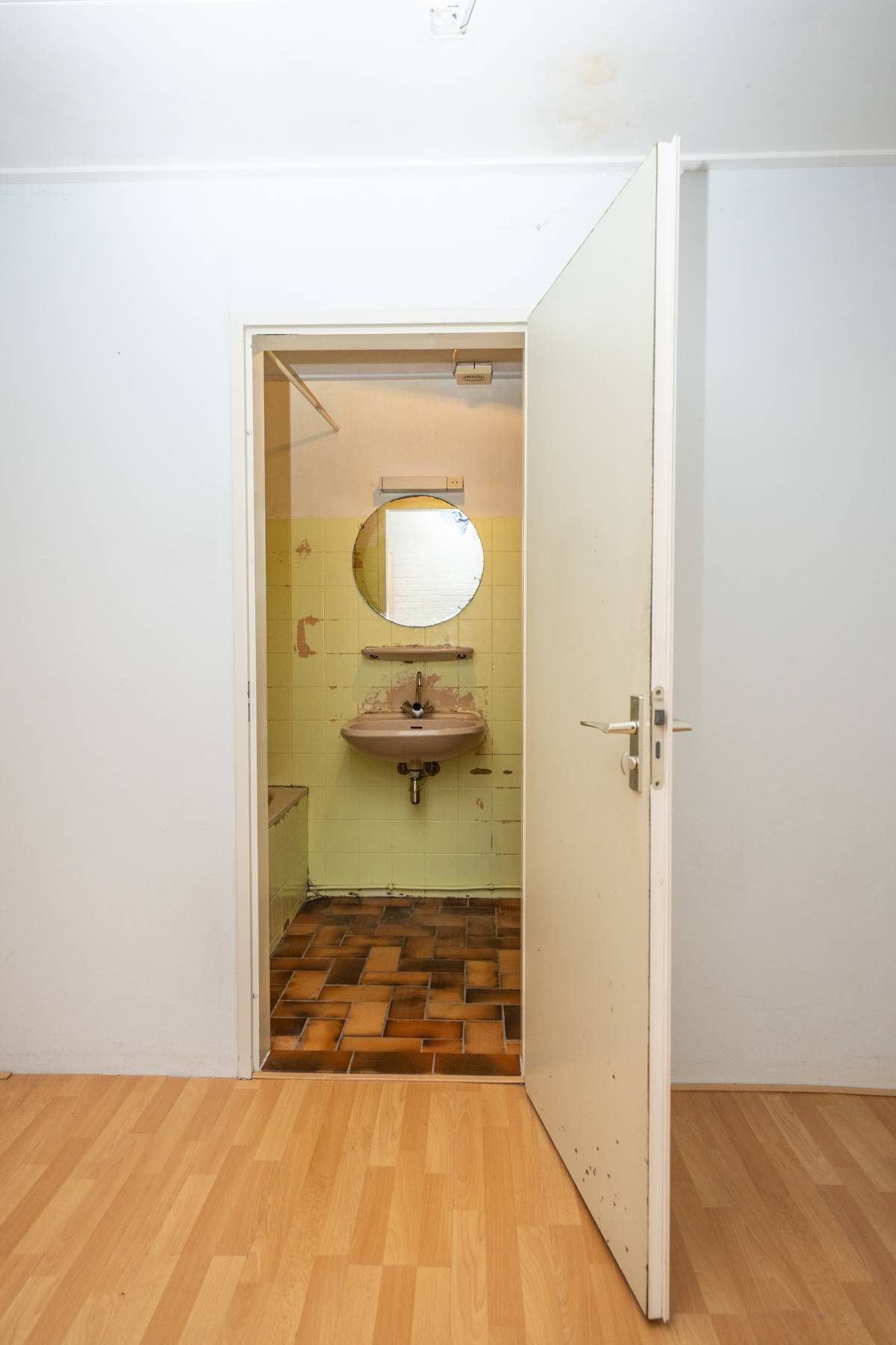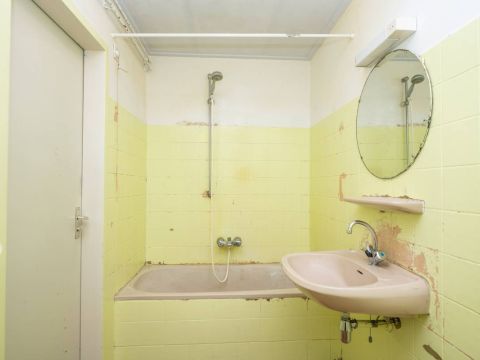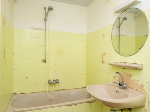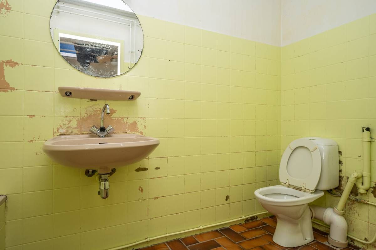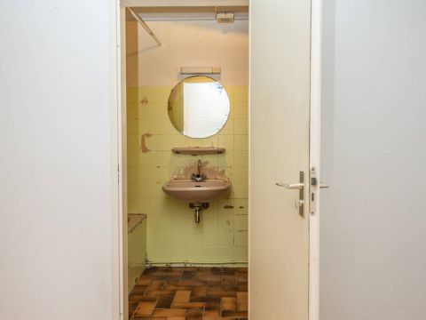Deze ruimte is toe aan een flinke make-over. Hier bevindt zich ook de aansluiting voor de wasmachine.