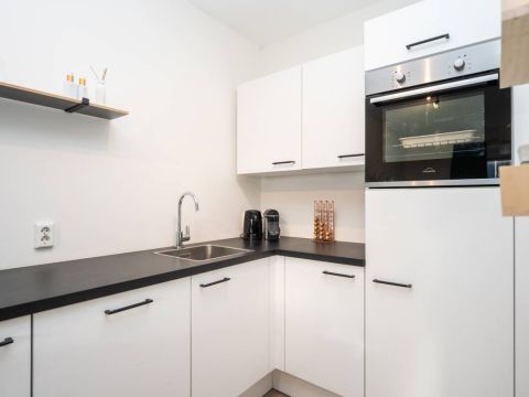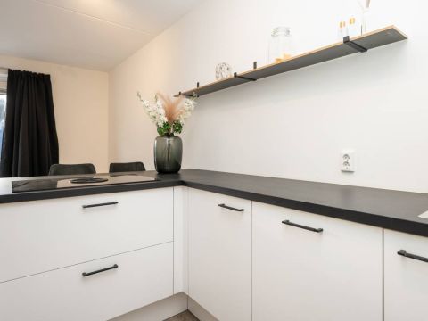 De moderne keuken is voorzien van diverse luxe inbouwapparatuur, waaronder een kookplaat met ingebouwde afzuiging, oven en voldoende kastruimte. Daarnaast is er aan het keukenblad een leuk barretje gecreëerd.