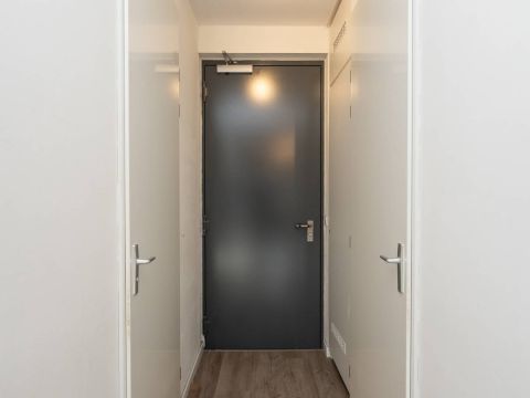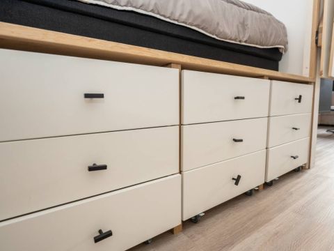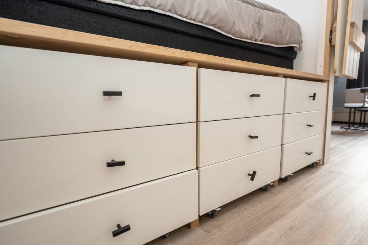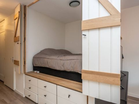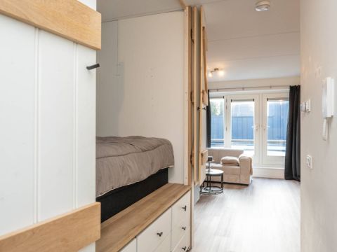 Omdat het een studio betreft, is er slim gebruikgemaakt van de ruimte. De charmante bedstede zorgt voor een knusse slaapplaats en biedt daaronder meerdere lades, ideaal voor het opbergen van kleding en overige spullen.