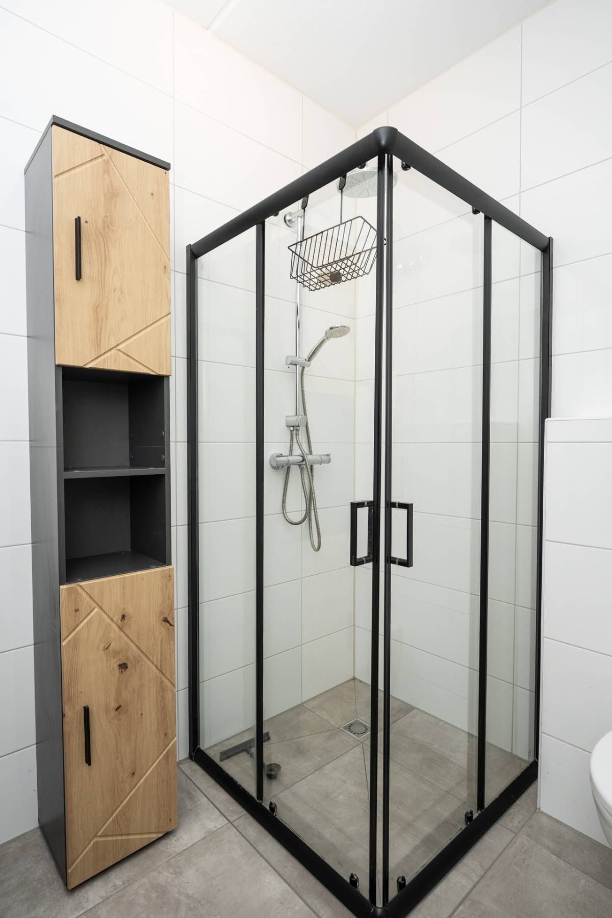 De complete badkamer beschikt over een inloopdouche, wastafel en toilet.