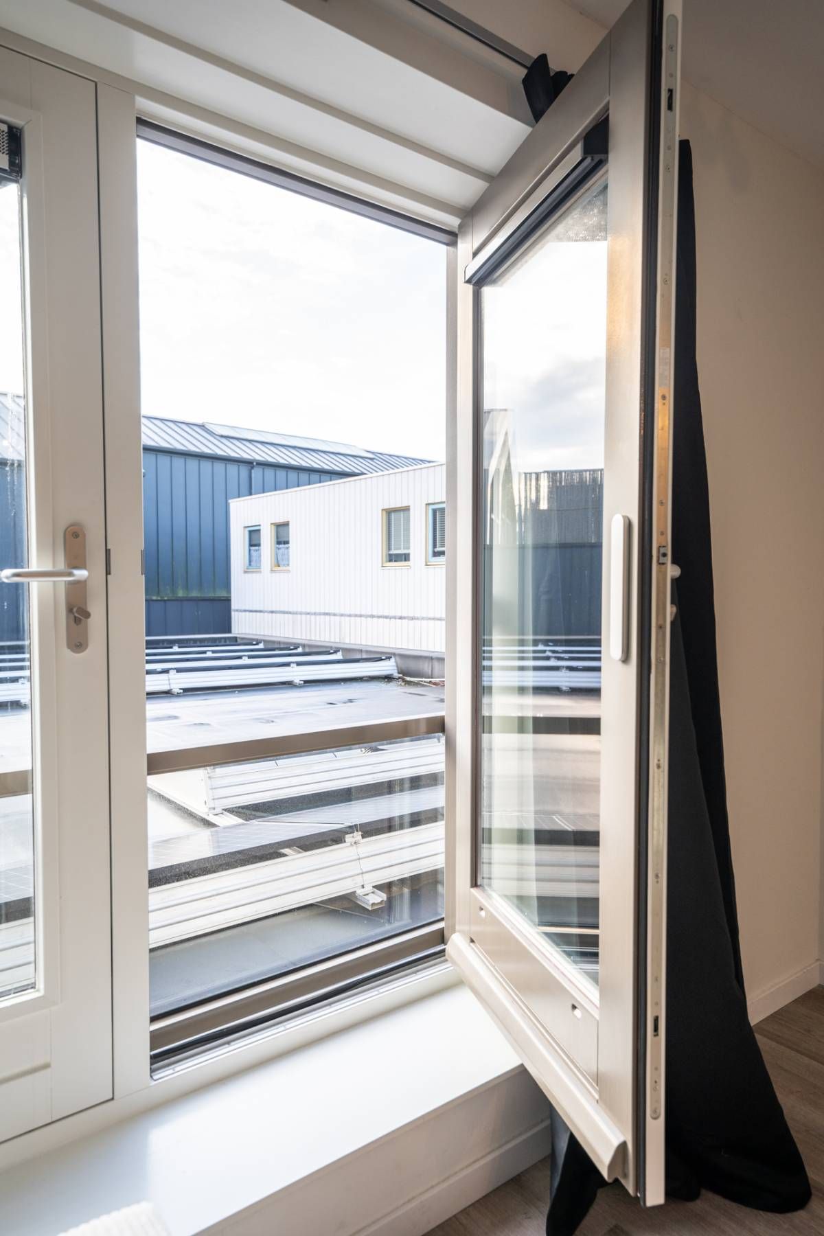 Via openslaande deuren kijk je uit op het platte dak, waardoor er volop daglicht binnenvalt.