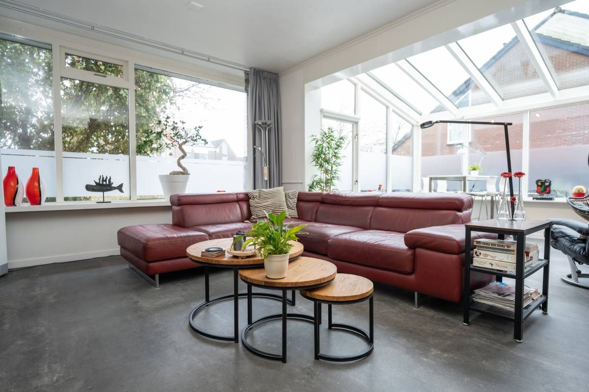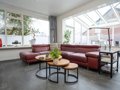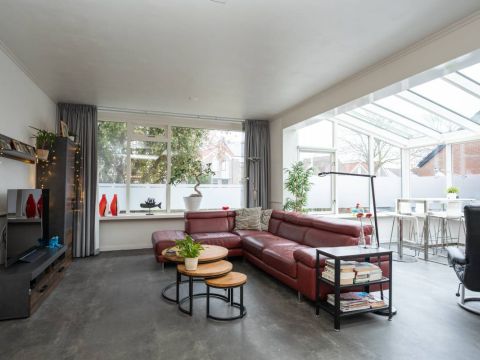 De woonkamer biedt direct een ‘wauw-effect’. Door de uitbouw met grote glaspartijen baadt de living in het licht, wat zorgt voor een heerlijk open en luxe sfeer. Het elektrisch zonnedoek (2x) garandeert comfort op zonnige dagen.