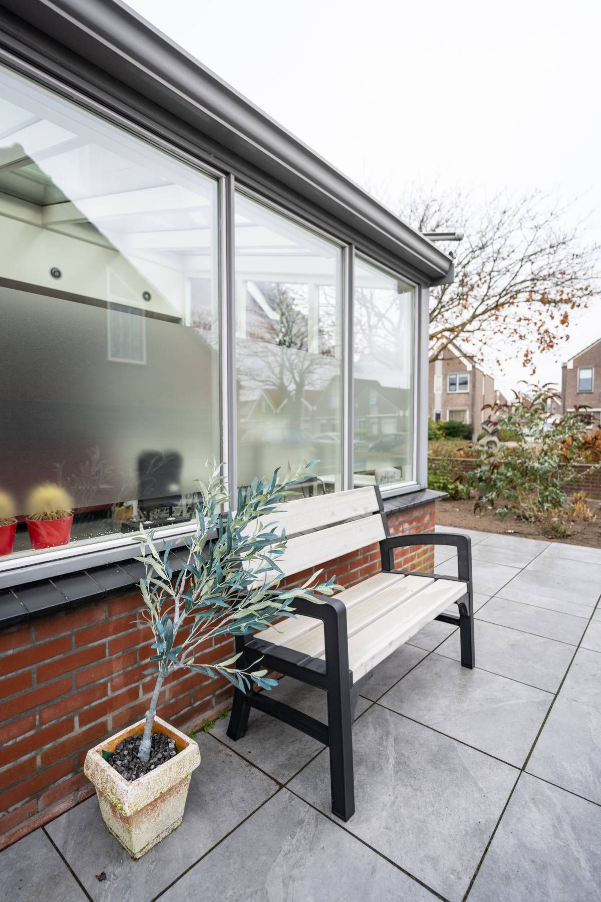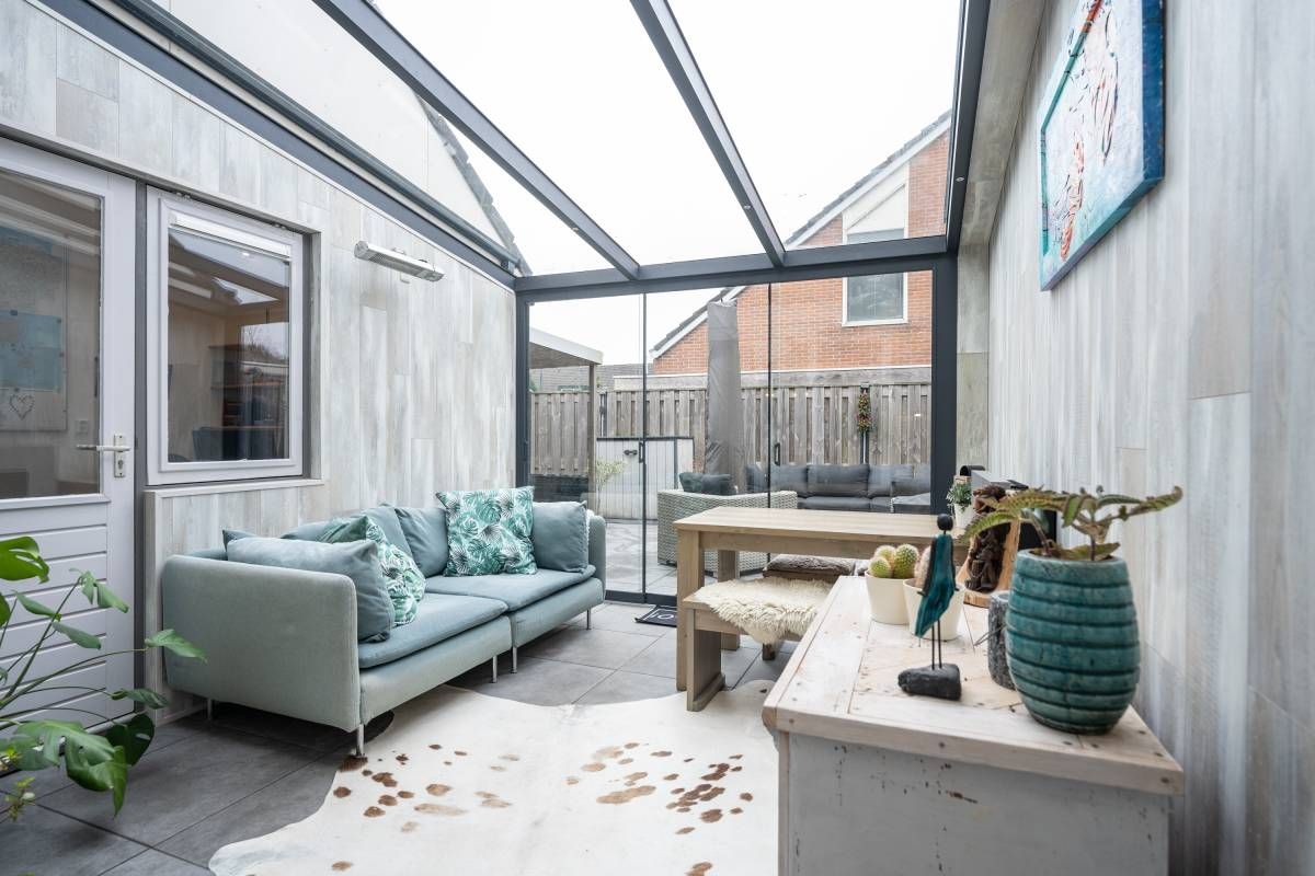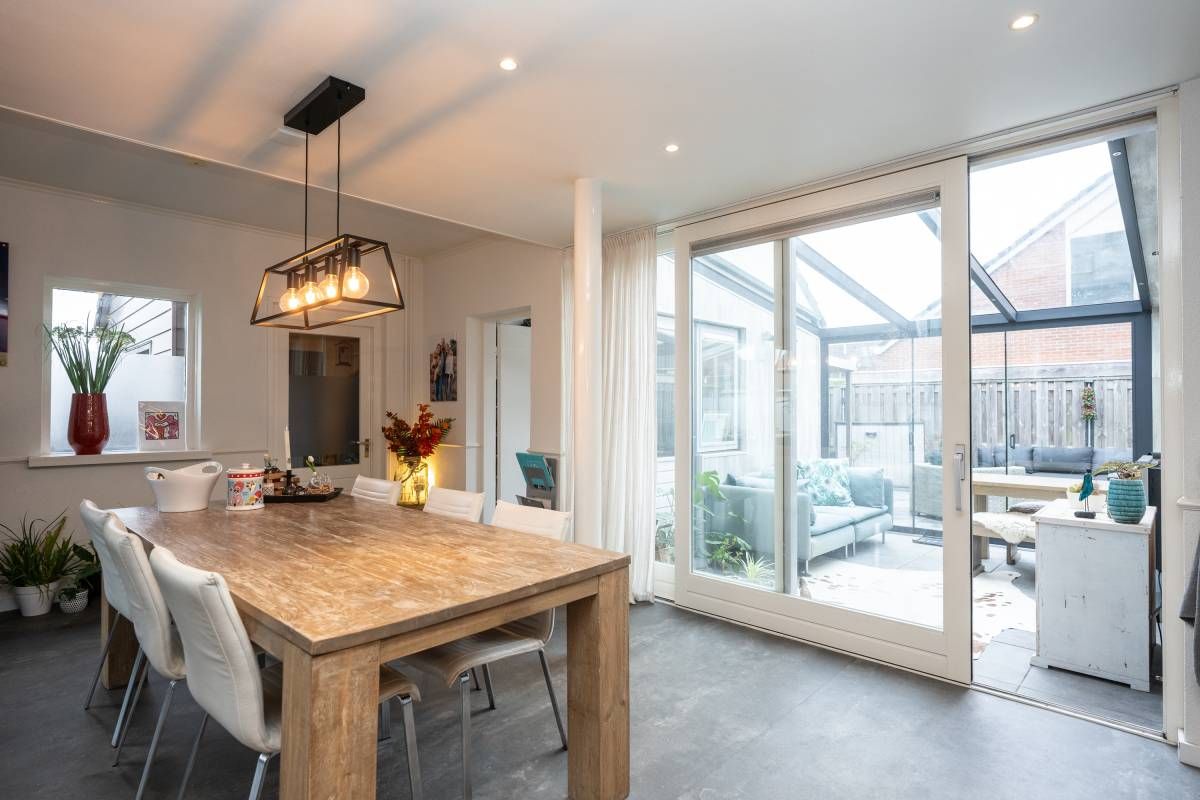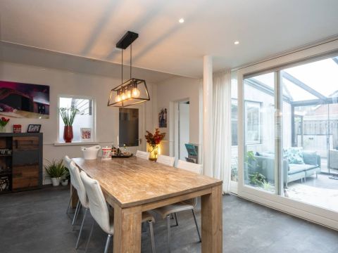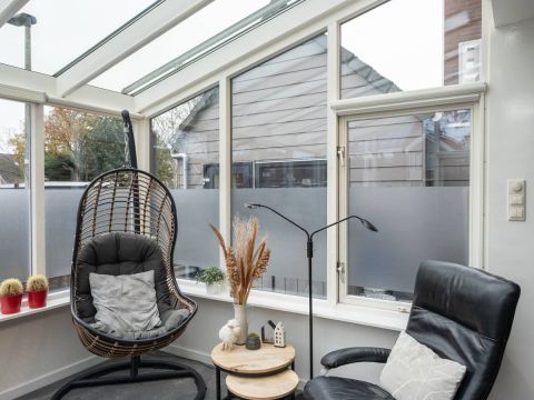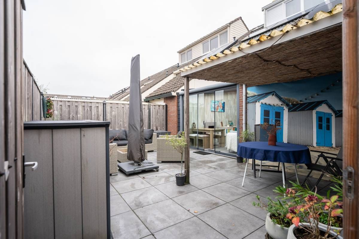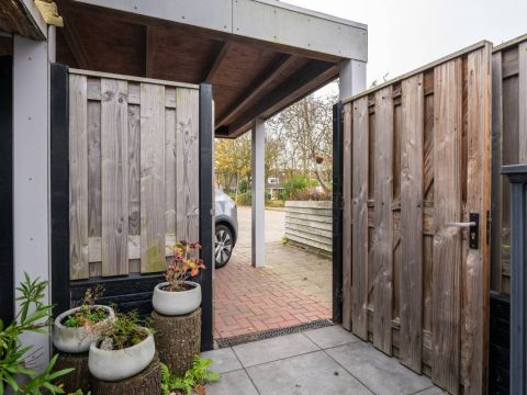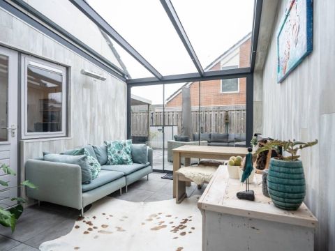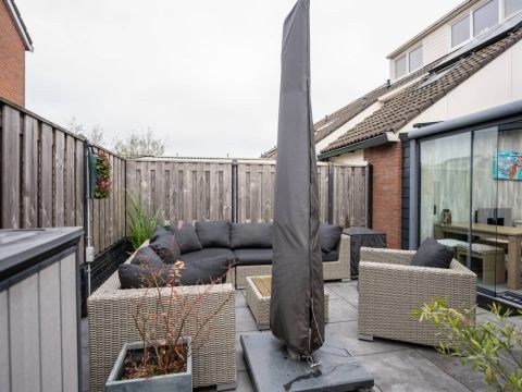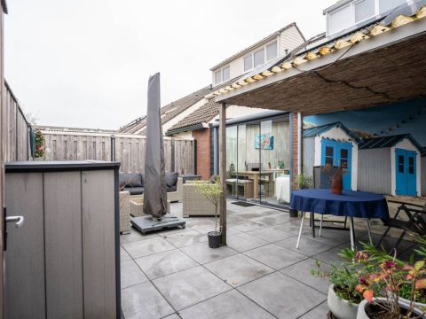 Bovendien is er een charmante overkapping aanwezig, waardoor je ook met minder weer comfortabel buiten kunt zitten. De glazen schuifpui geeft toegang tot de besloten, onderhoudsvriendelijke tuin waar je in alle rust kunt ontspannen.