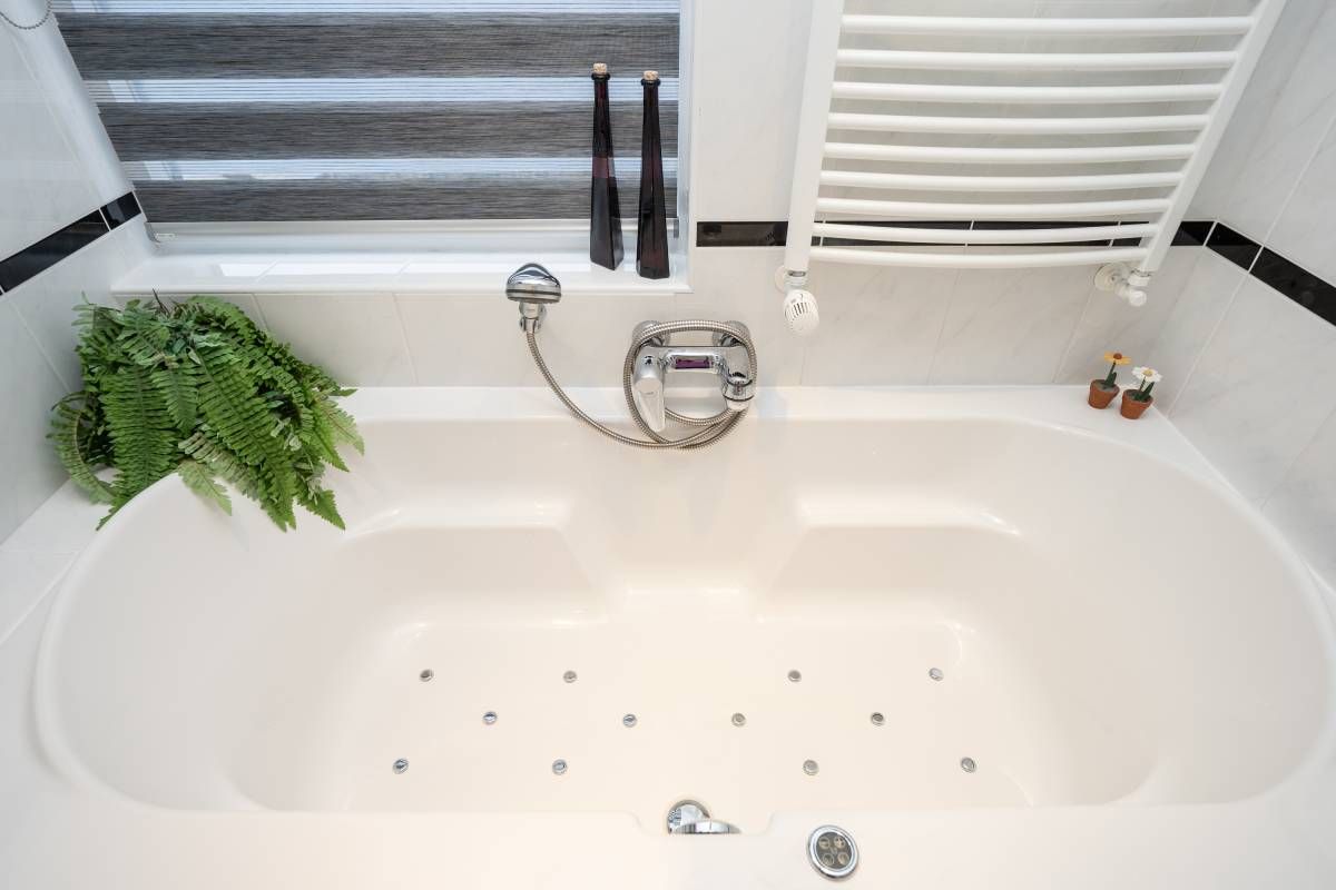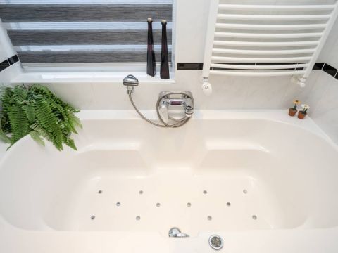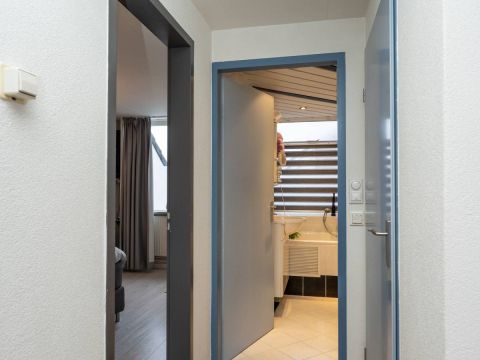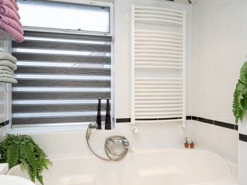 De badkamer met elektrische vloerverwarming is tevens uitgerust met een tweepersoons bubbelbad, douche, toilet en wastafelmeubel.