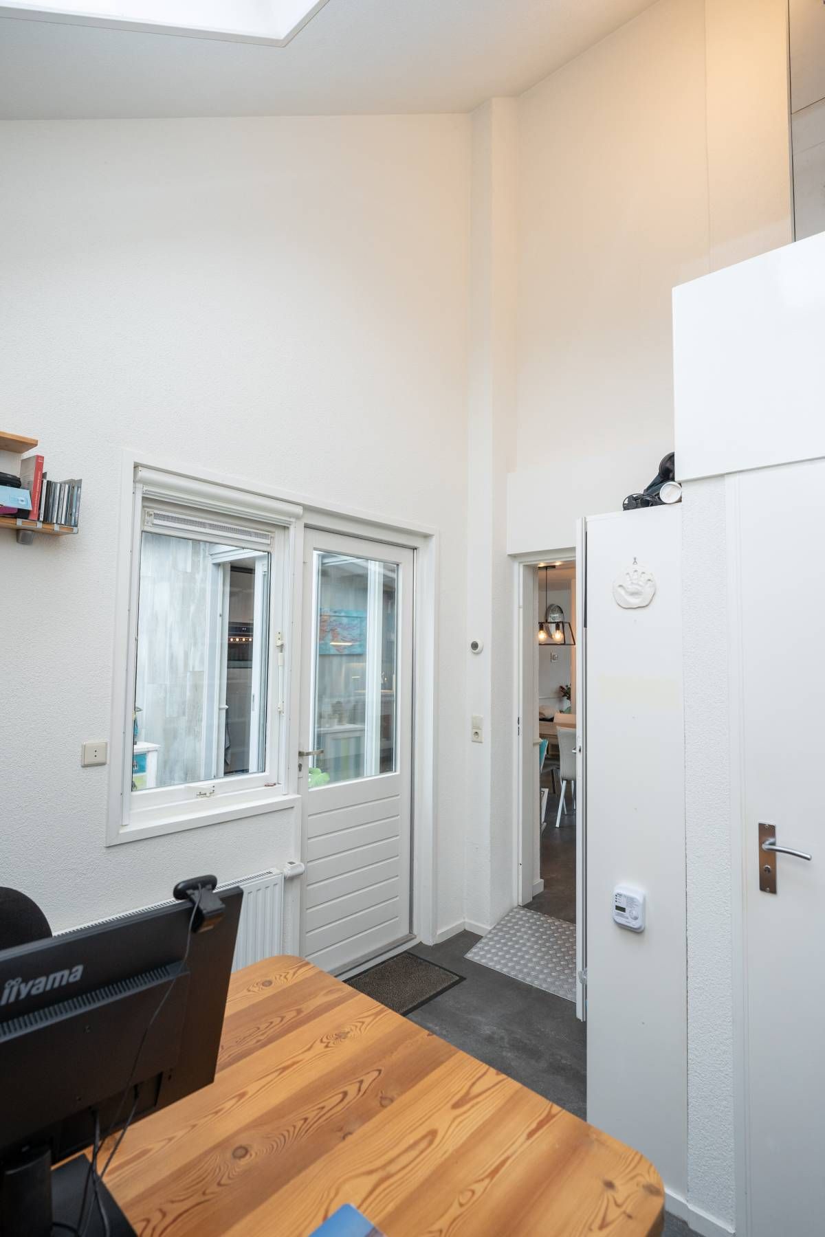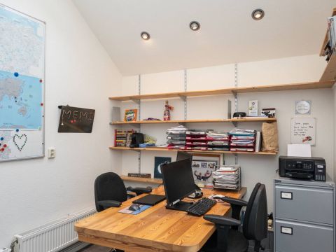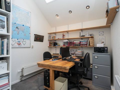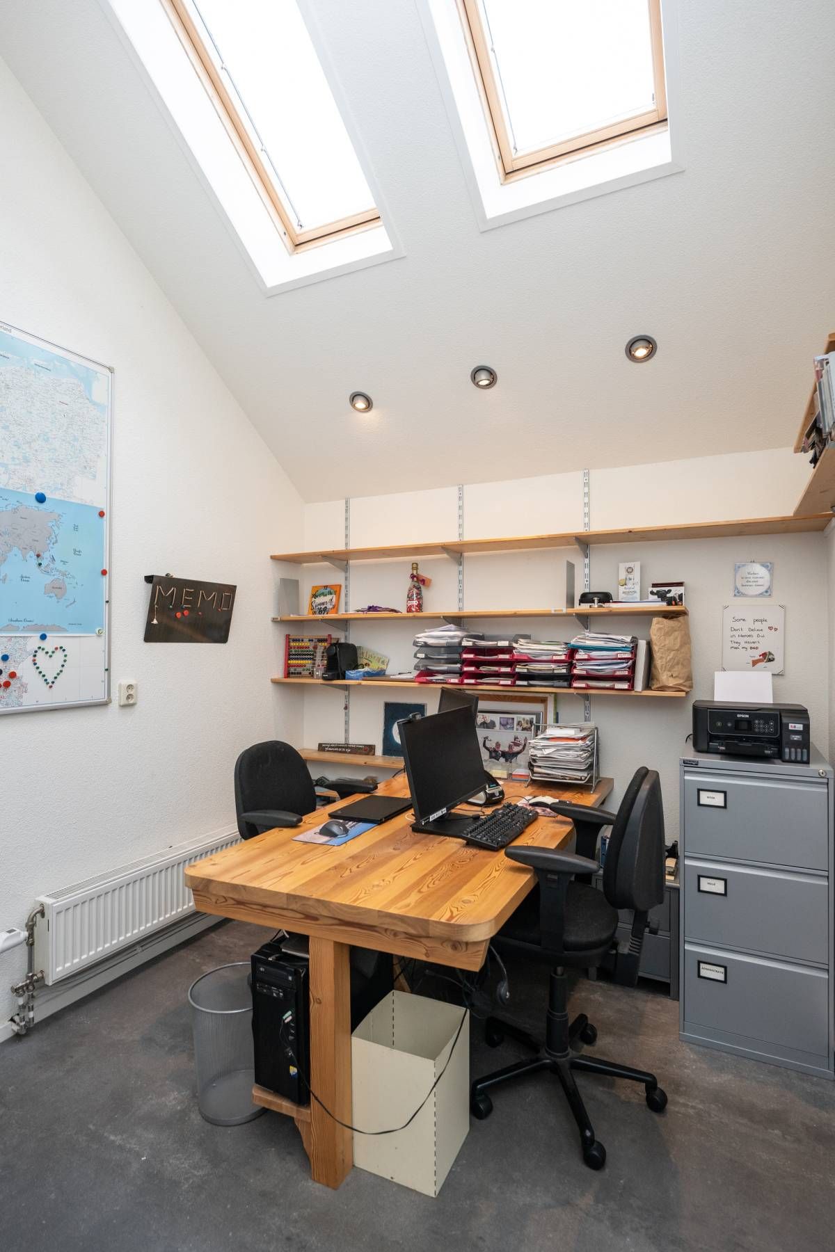 Vanuit de woonkamer bereik je tevens een veelzijdige kantoor-/hobbyruimte, ideaal als werkplek of bijvoorbeeld als speelkamer. In deze ruimte bevindt zich ook de toegang tot het toilet én een directe deur naar de tuin, wat het gebruiksgemak vergroot.