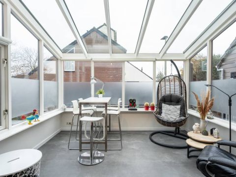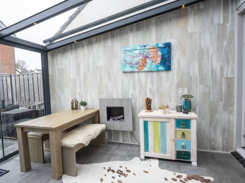 Aansluitend tref je via de schuifpui de sfeervolle wintertuin. Een echte meerwaarde: dankzij de elektrische haard geniet je hier het hele jaar door van warmte en gezelligheid.