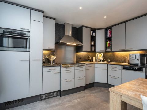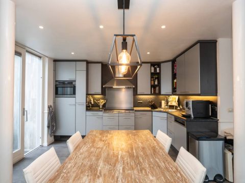 Aan de tuinzijde bevindt zich de complete en verzorgde hoekkeuken. Deze keuken is uitgerust met moderne inbouwapparatuur en luxe extra’s zoals een Quooker, alles ideaal voor de kookliefhebber.