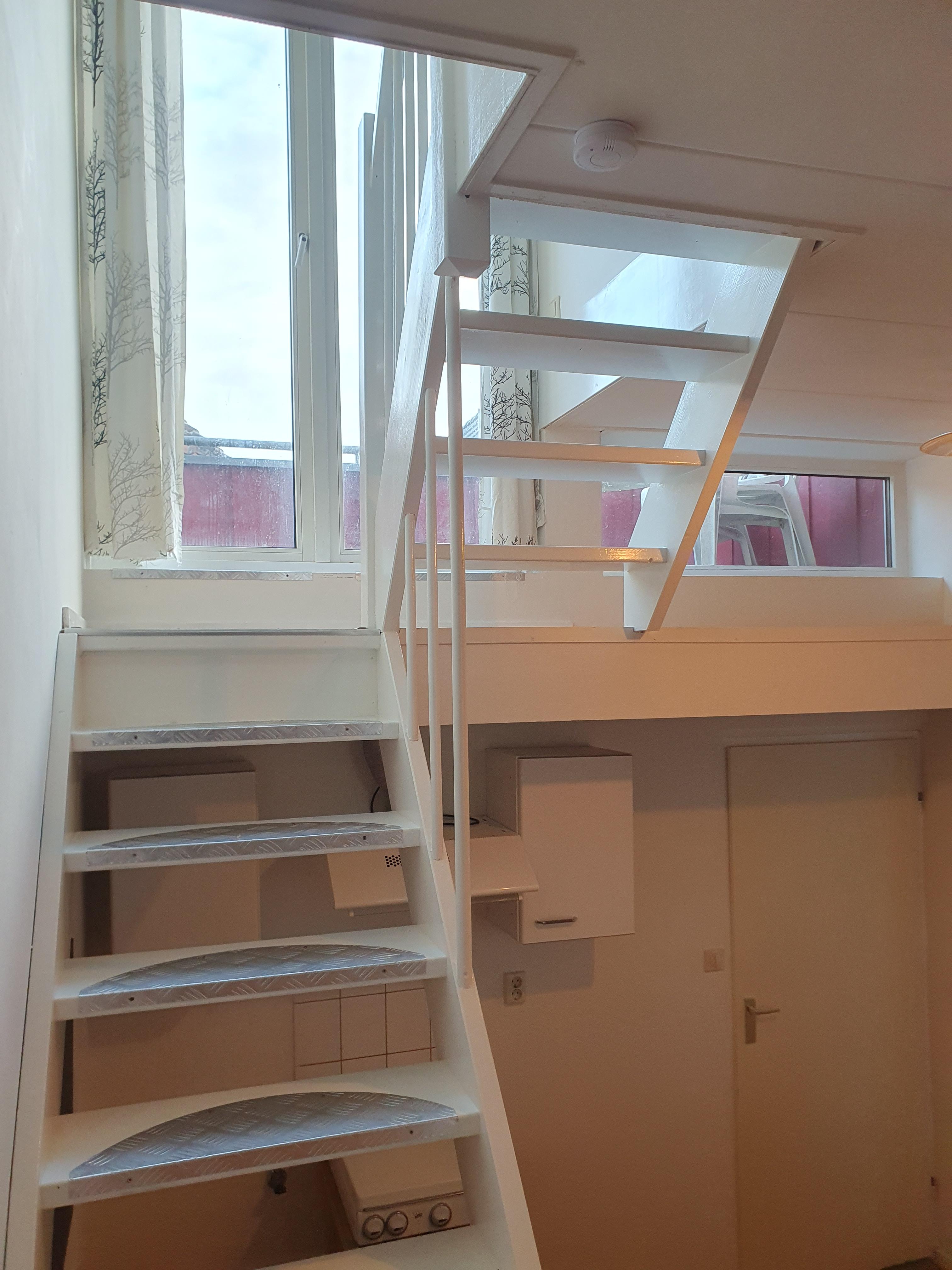Via een open trap bereikt u eerst de entresol en vervolgens de bovenverdieping. Dit is bewust zo gecreëerd voor extra lichtinval.
