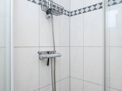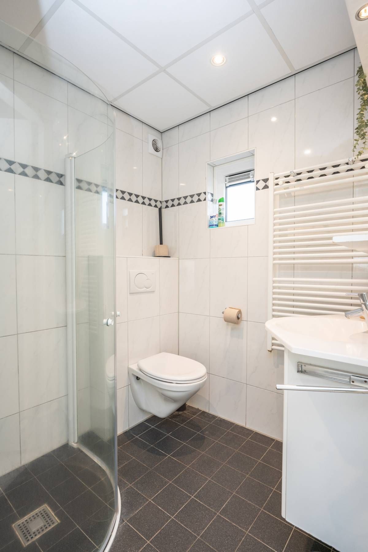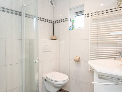 De badkamer is netjes en voorzien van een douche, toilet en wastafelmeubel. Een praktische en complete ruimte.