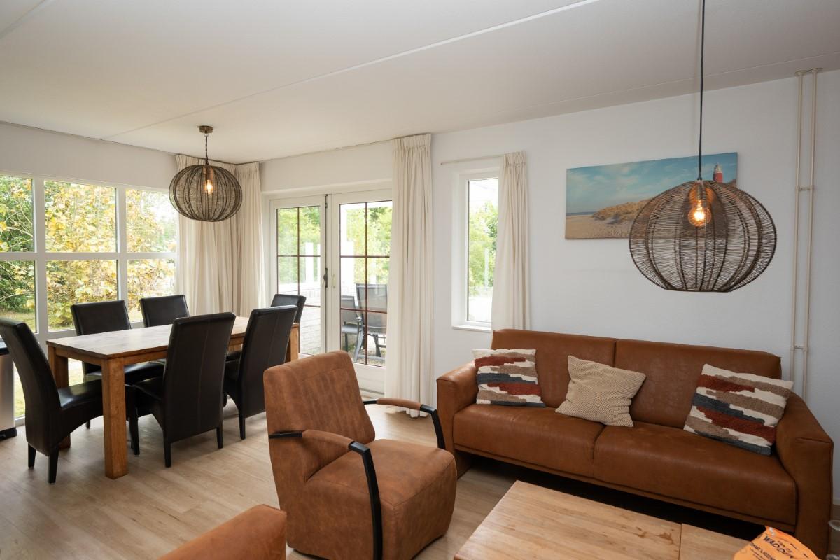 Prettige woonkamer met zithoek waar u kunt genieten van een knisperend haardvuurtje. De woonkamer heeft een zonnige lichtinval.