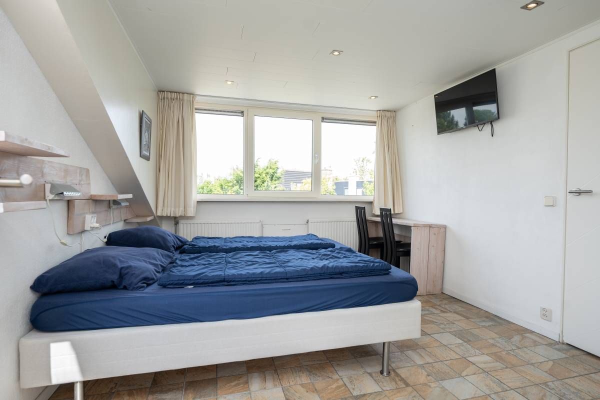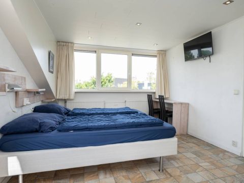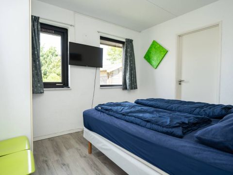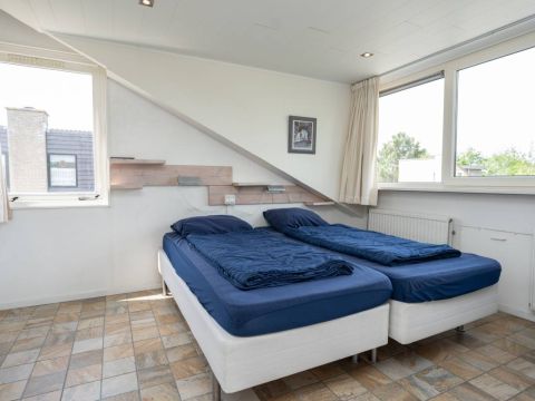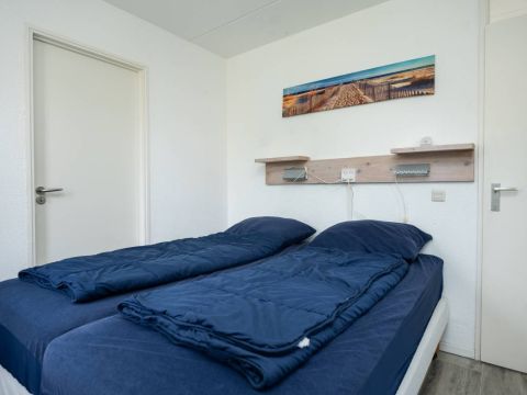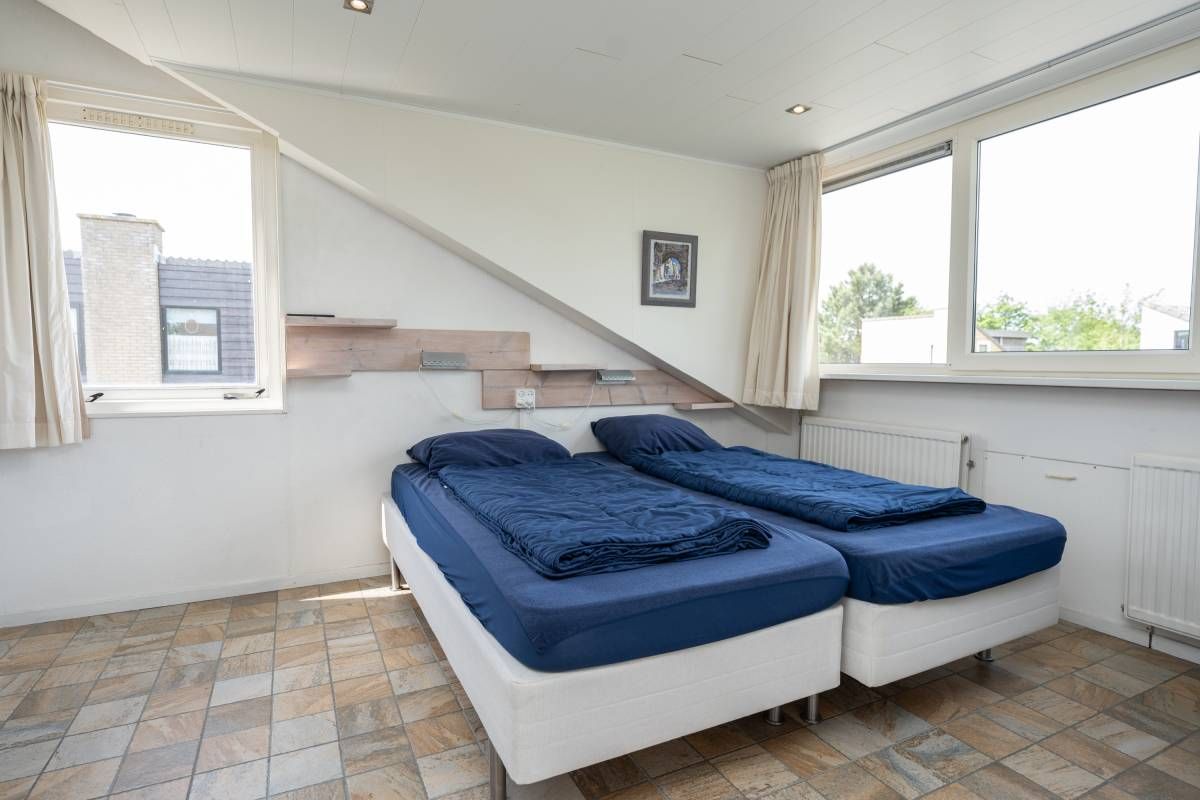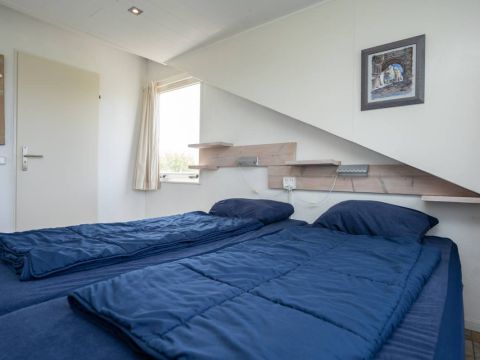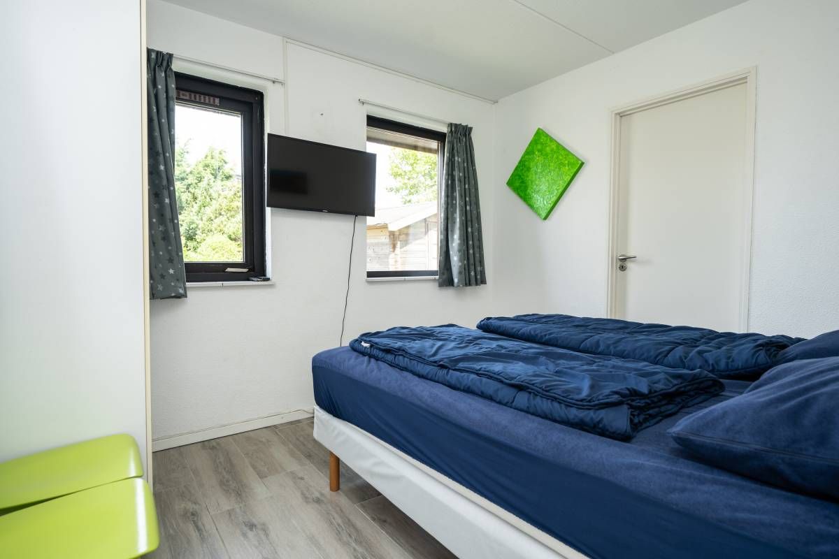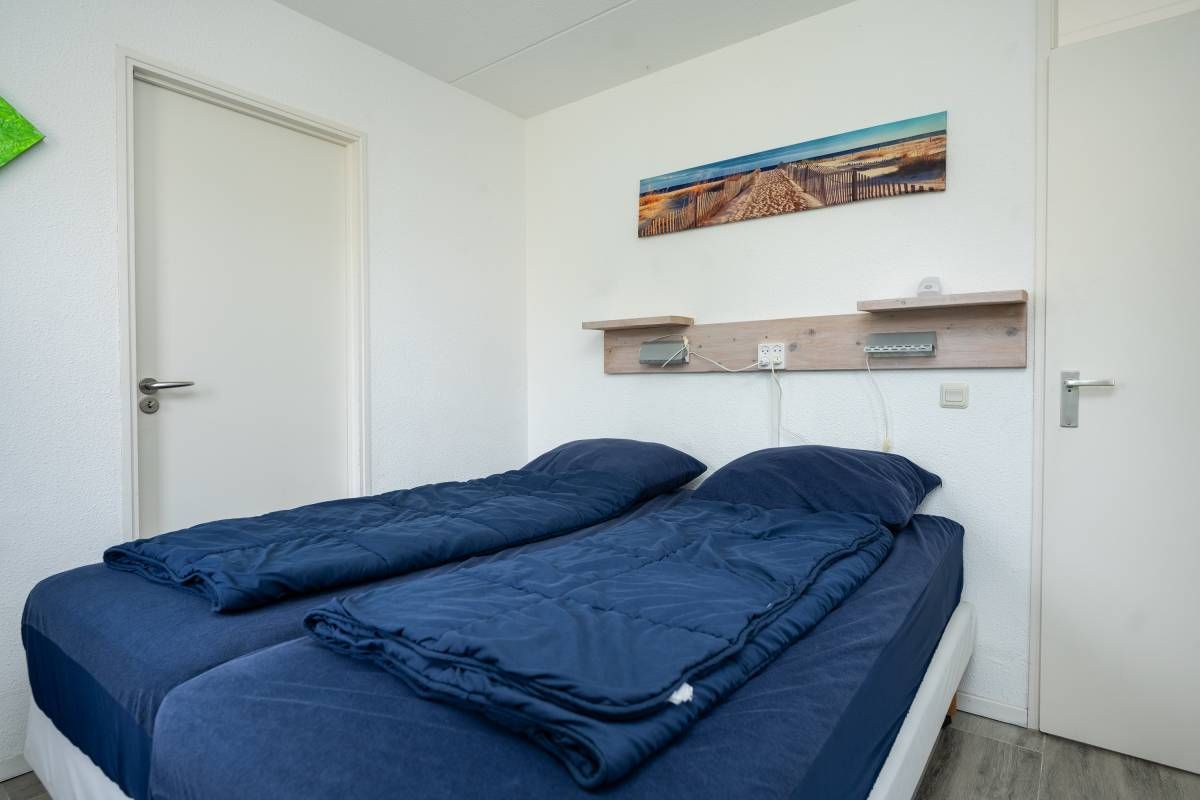 De slaapkamer op de begane grond is voorzien van twee eenpersoonsbedden en heeft bovendien directe toegang tot de praktische berging.