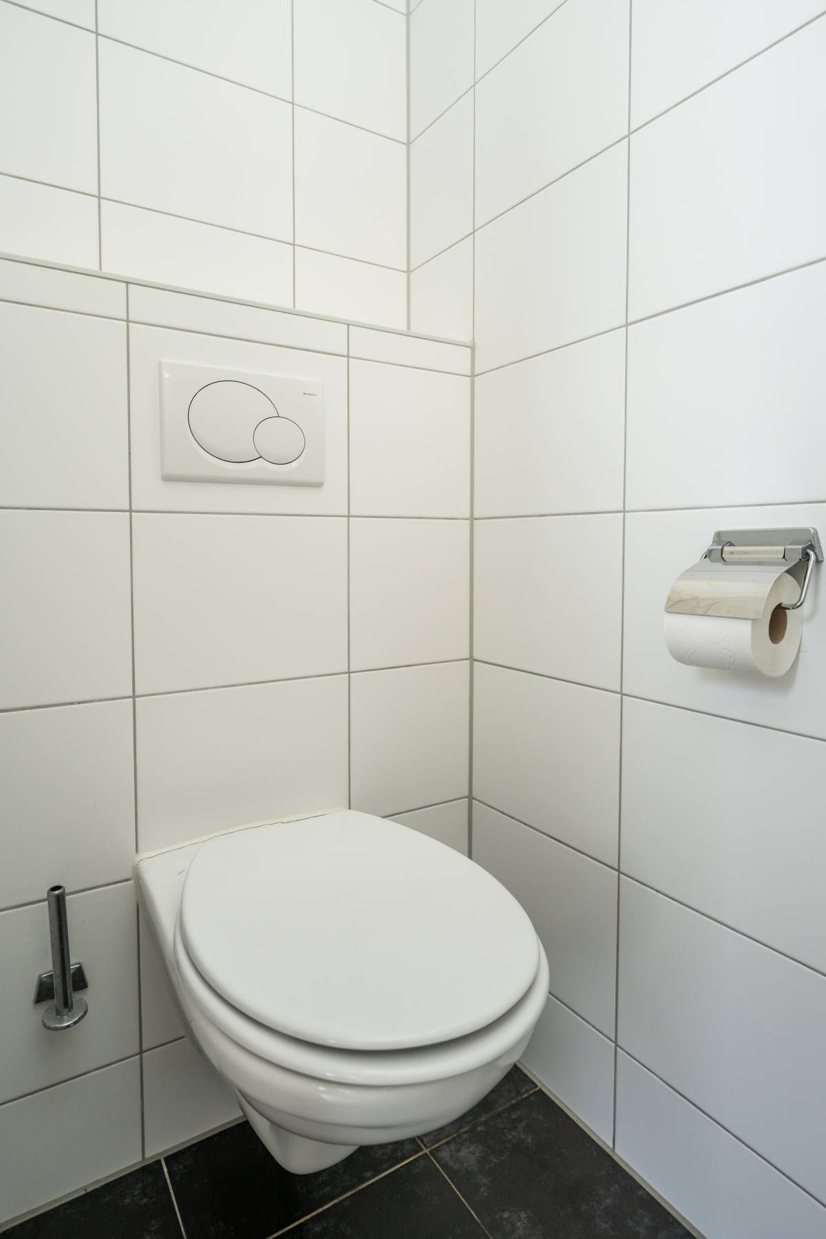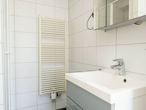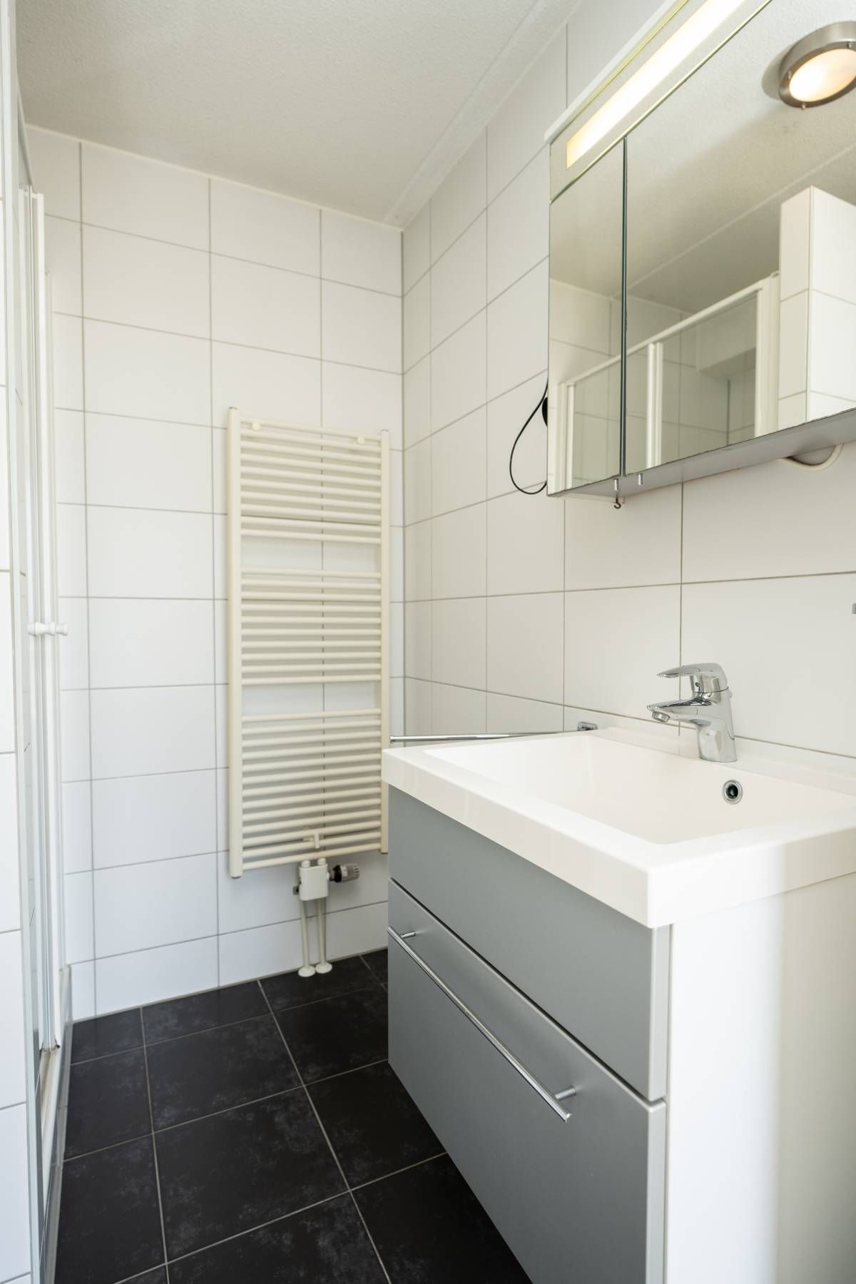 Grenzend aan de hal treft u de nette badkamer, compleet uitgevoerd met douche, wastafelmeubel en toilet.