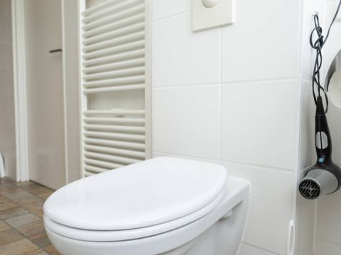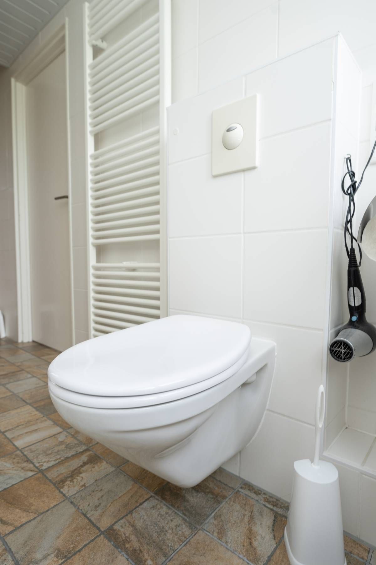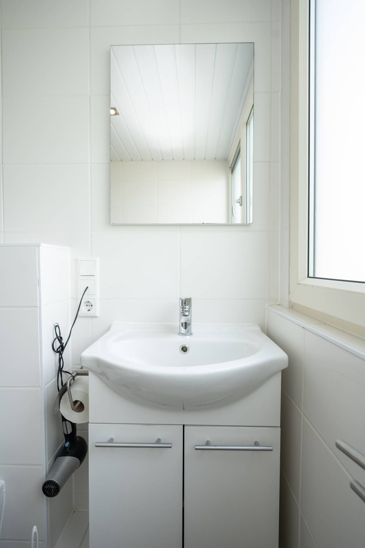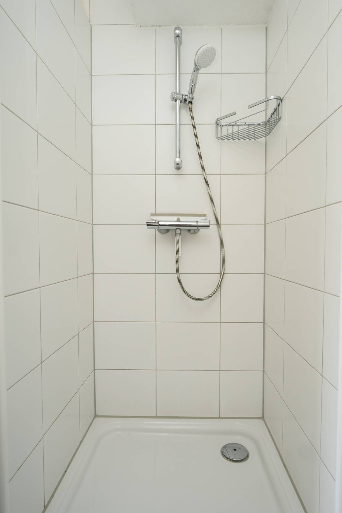 Grenzend aan de hal treft u de nette badkamer, compleet uitgevoerd met douche, wastafelmeubel en toilet.