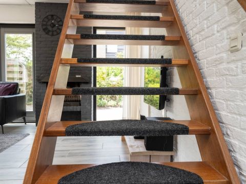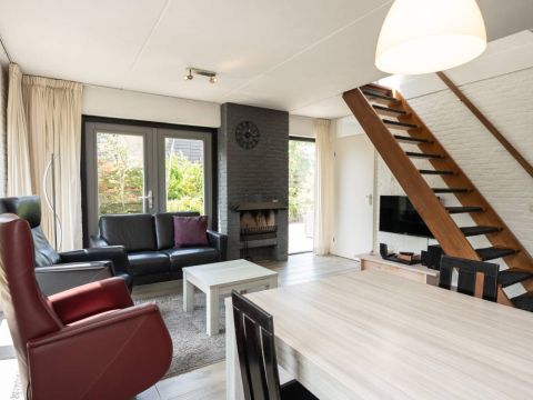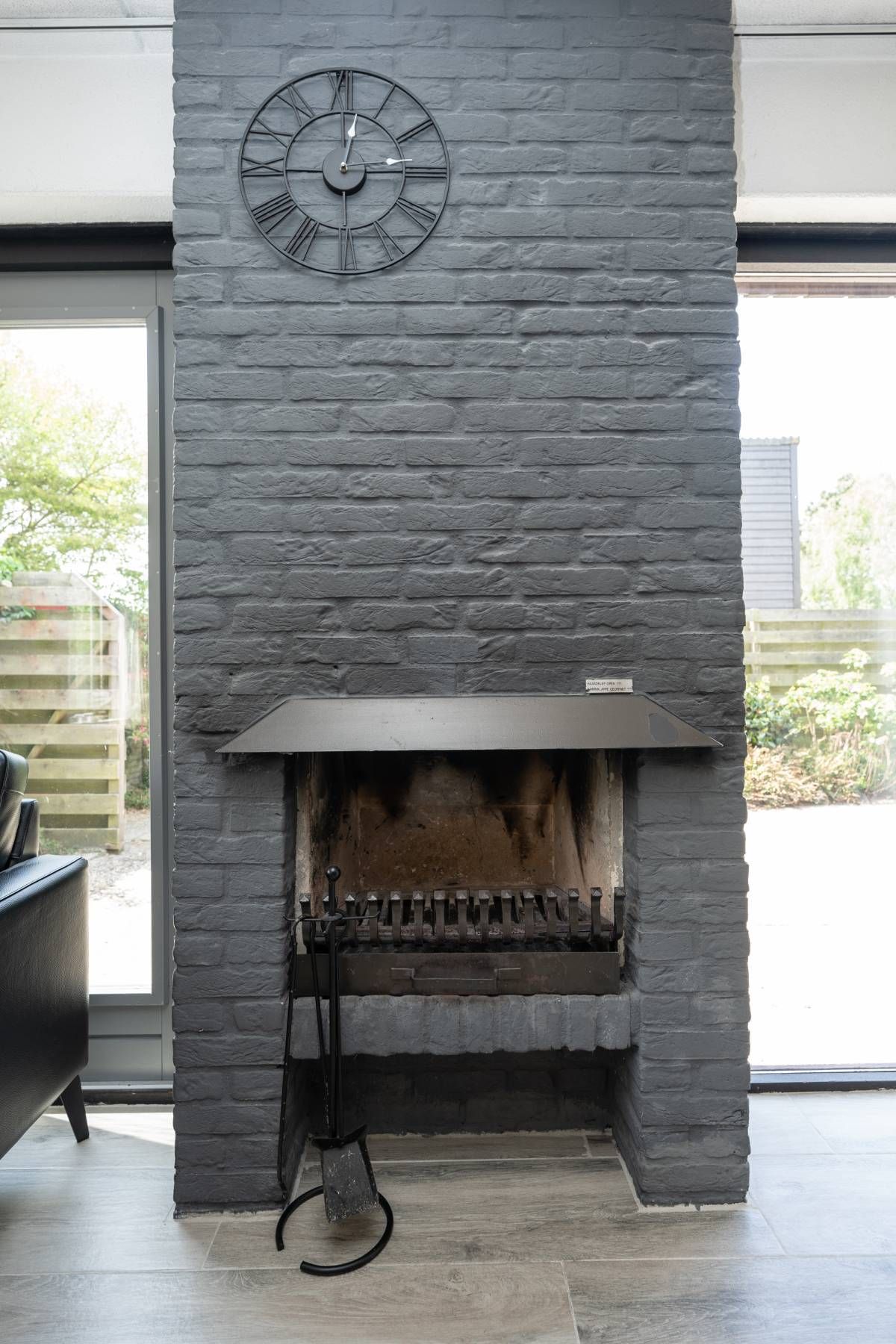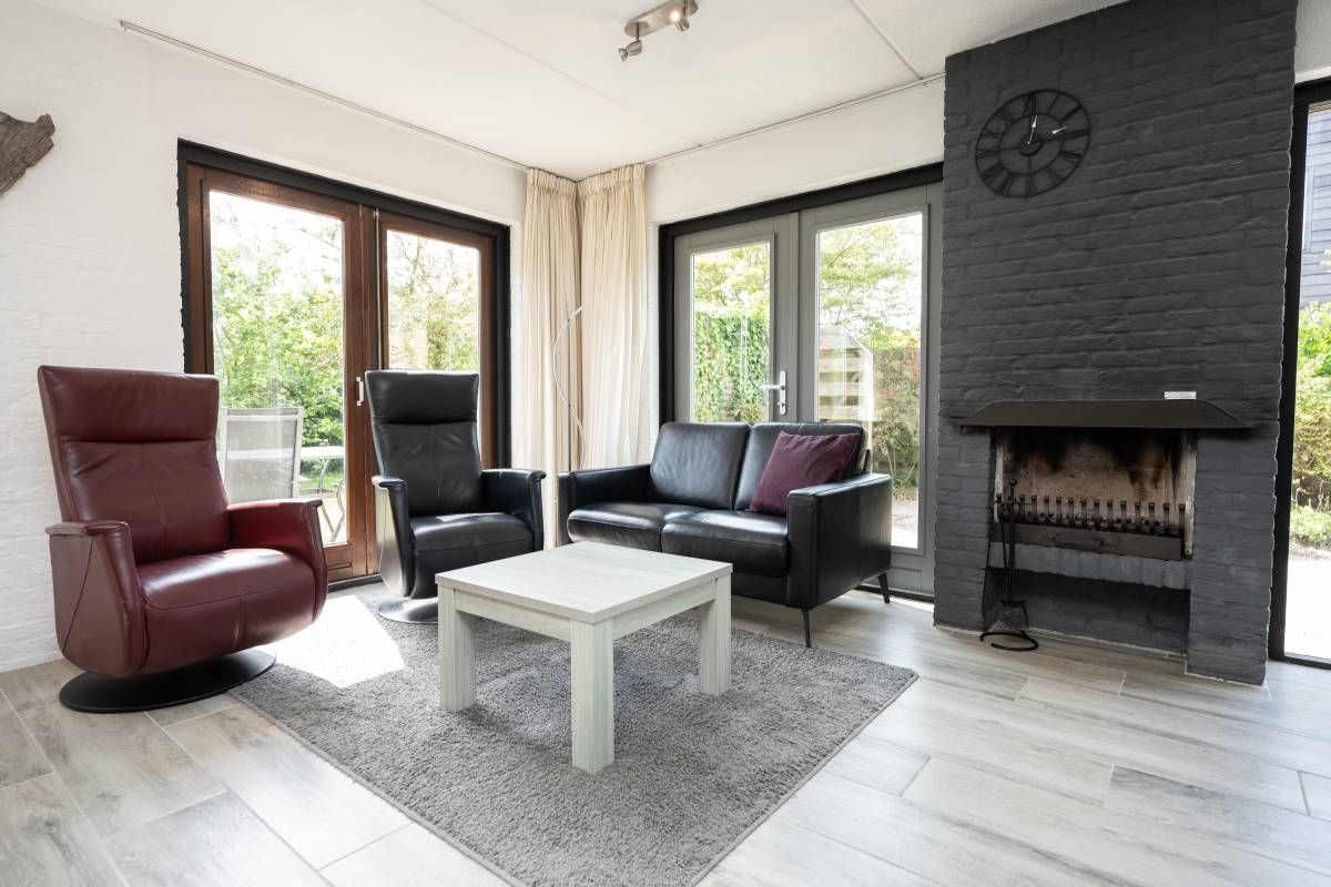 De woonkamer met openslaande deuren naar het zonnige terras is heerlijk ruim en heeft een gezellige sfeer dankzij de openhaard. De gehele begane grond is afgewerkt met nette plavuizen in een stijlvolle houtlook.