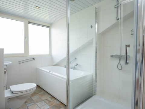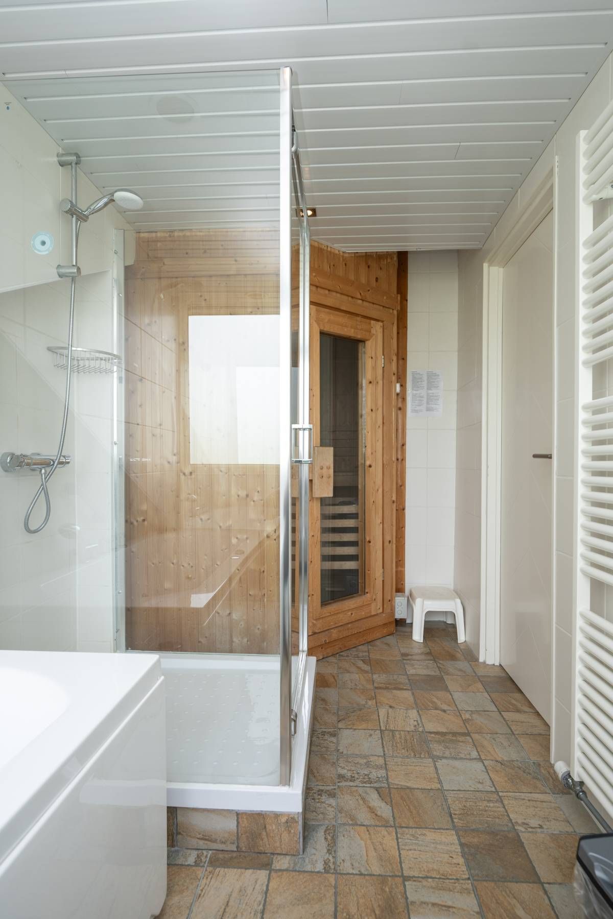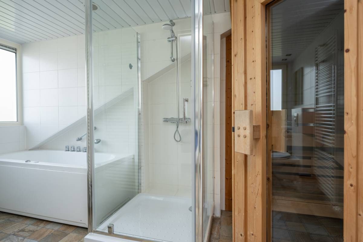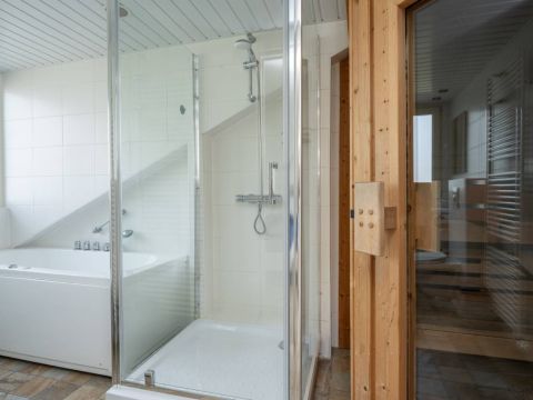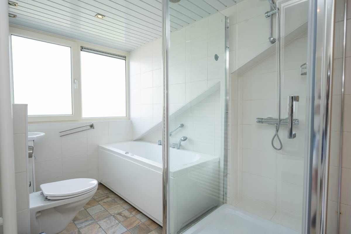 Aansluitend aan de slaapkamer de riante en luxe badkamer. Een prettige ruimte met ook hier een dakkapel. De badkamer is voorzien van een douche, whirlpool ligbad, wastafel meubel en toilet. Als kers op de taart is er op deze verdieping een sauna! Heerlijk om écht even te ontspannen en tot rust te komen.