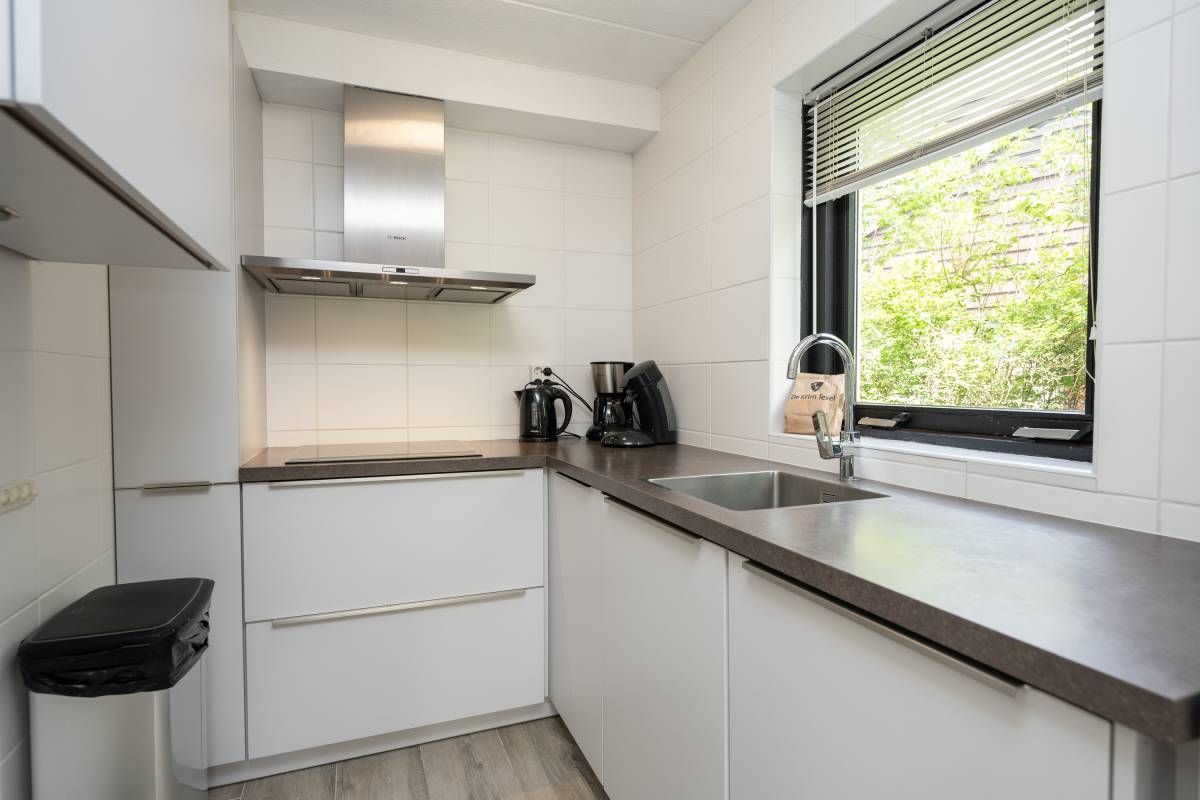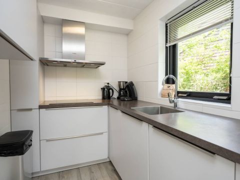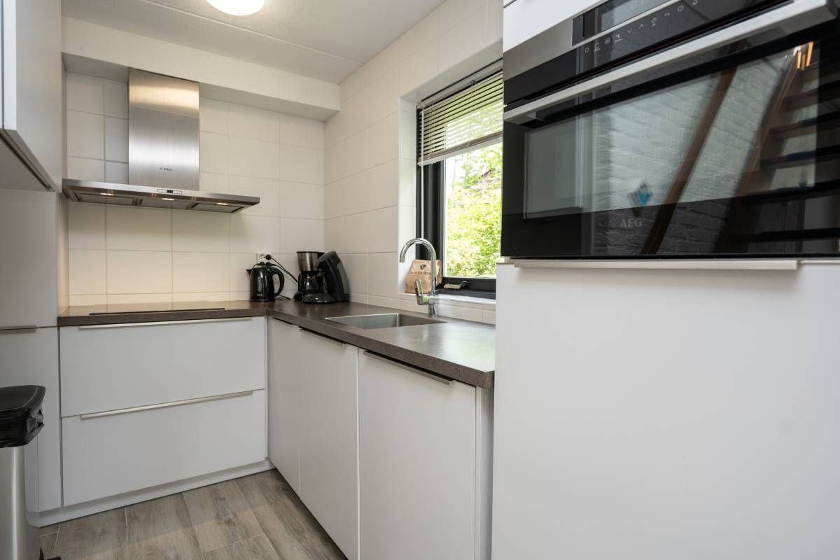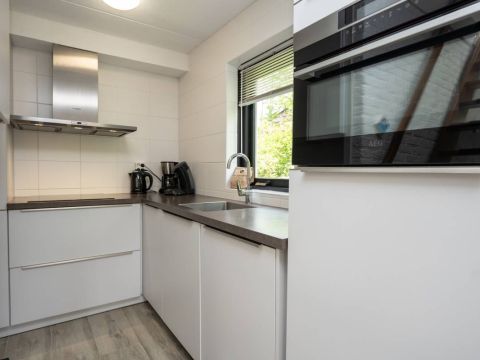 De moderne keuken beschikt over diverse inbouwapparatuur zoals een koelkast, vaatwasser, combi-oven, kookplaat en afzuigkap.