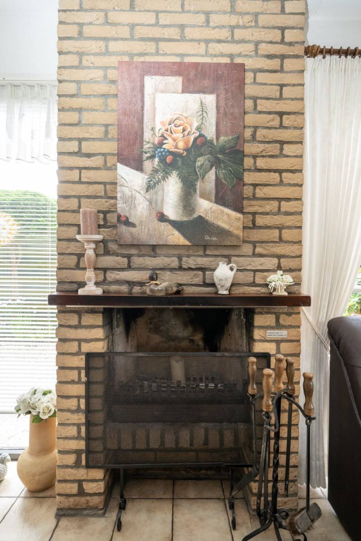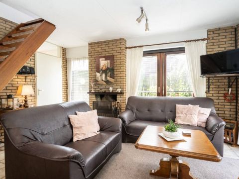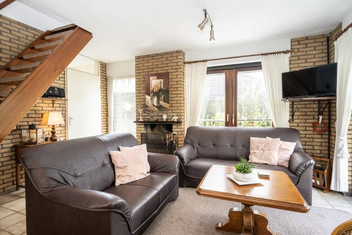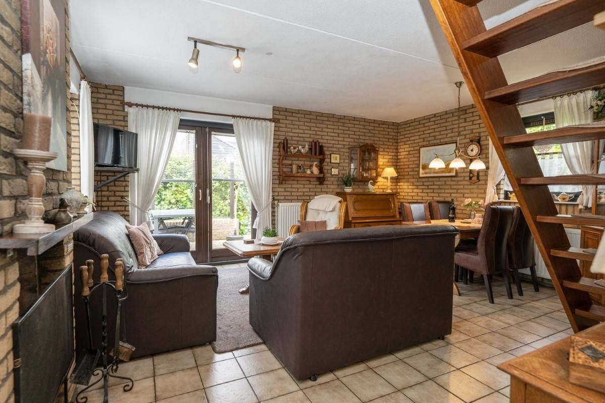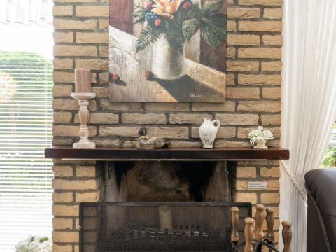 De woonkamer is voorzien van sfeervolle openhaard en aan beide zijden openslaande deuren naar de tuin en het terras.