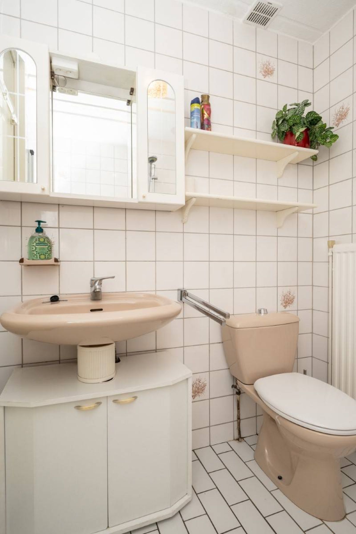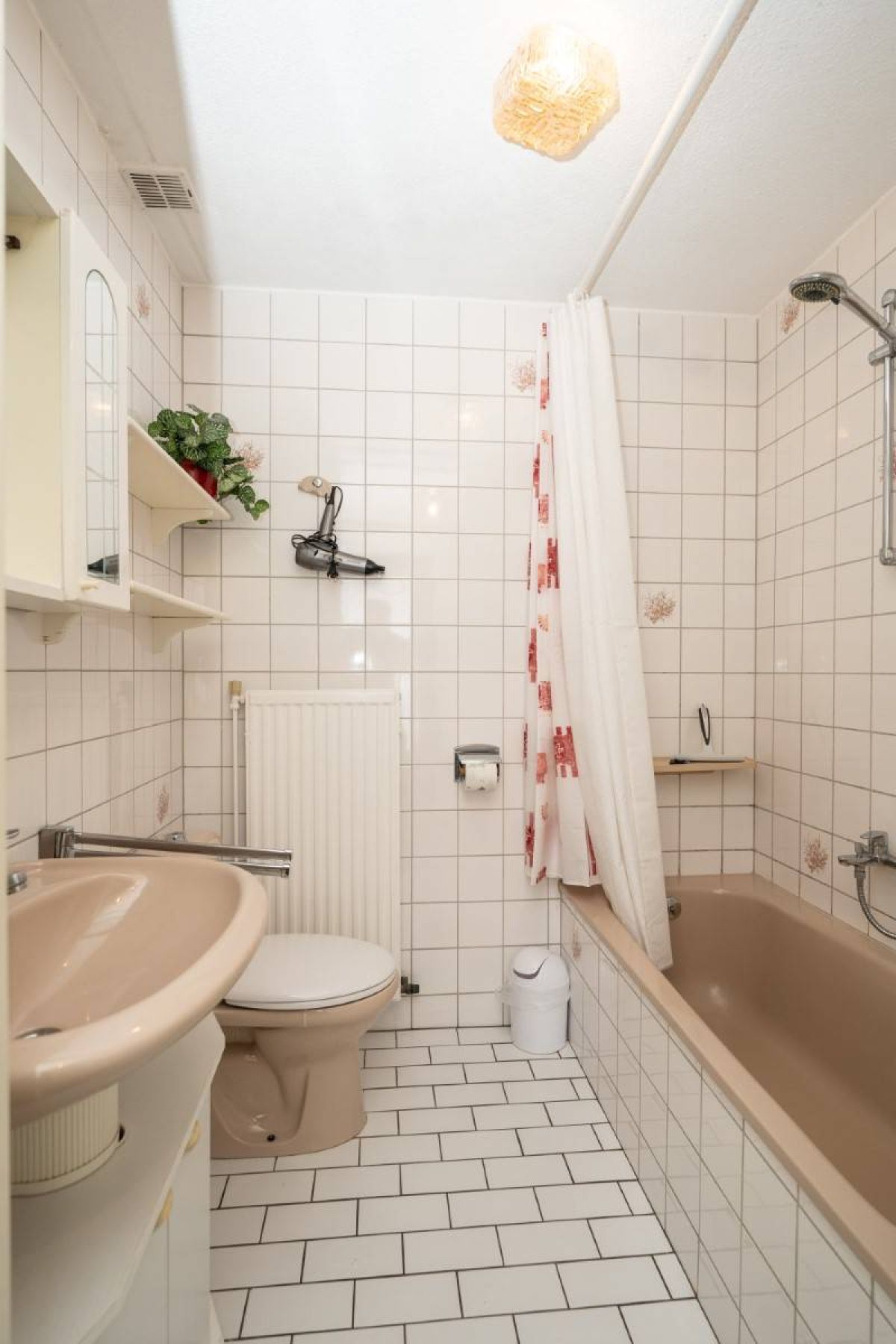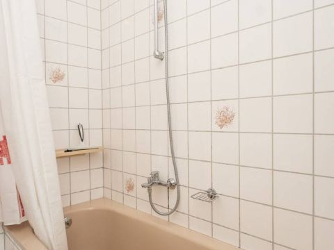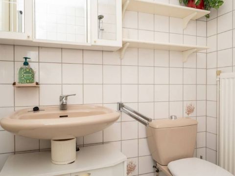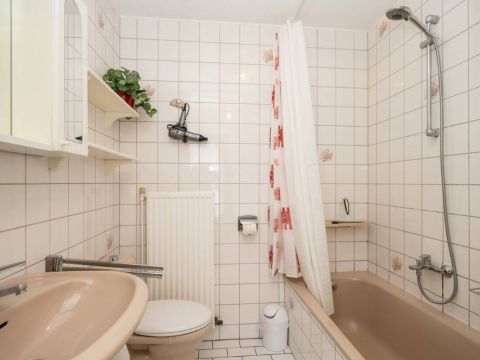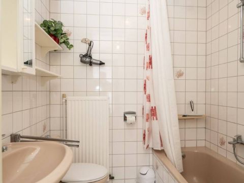 Via de hal bereikt u de badkamer. De badkamer is voorzien van een ligbad/douche, wastafel en toilet.