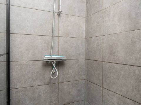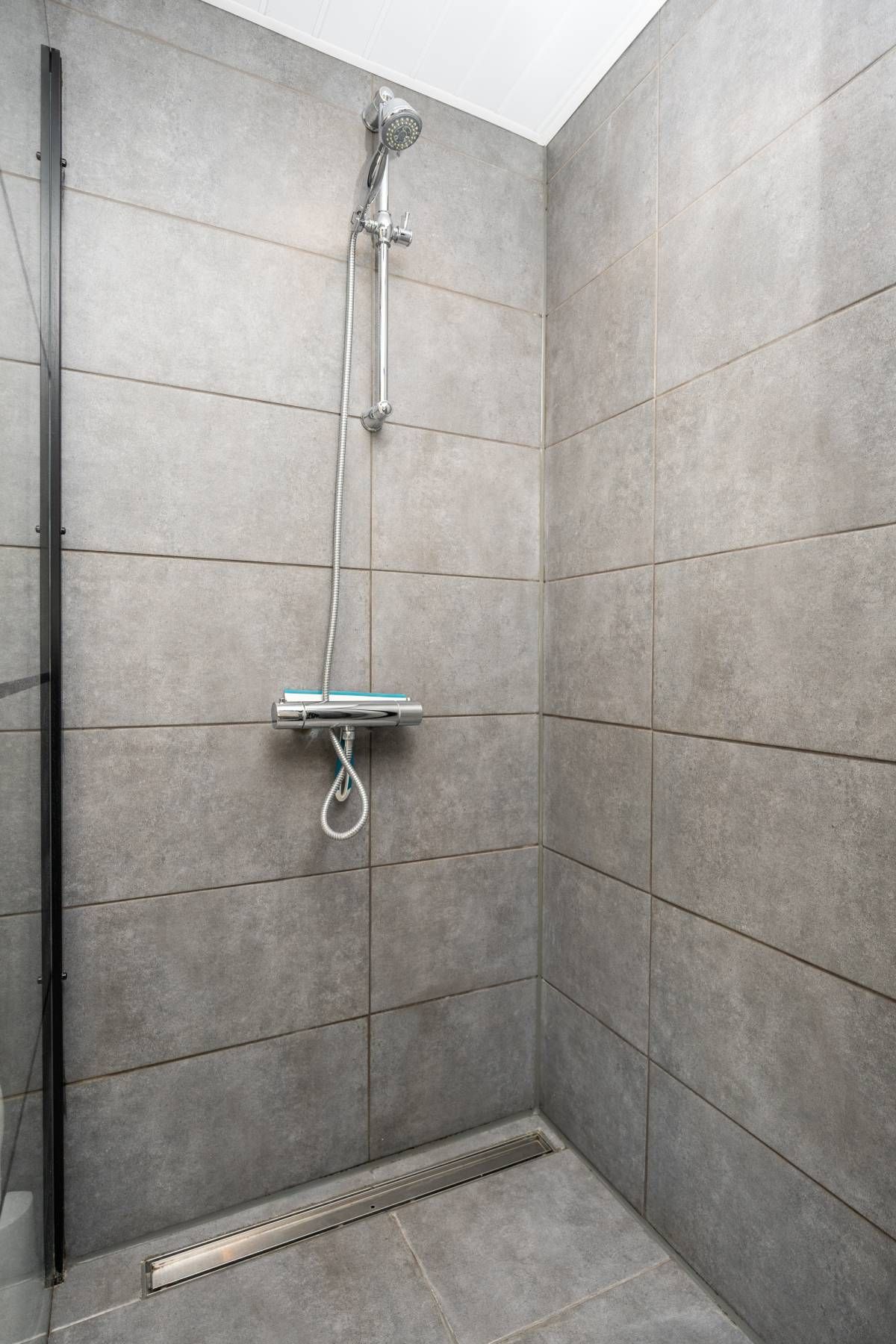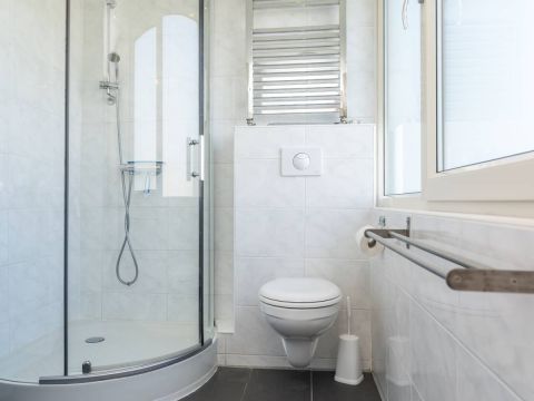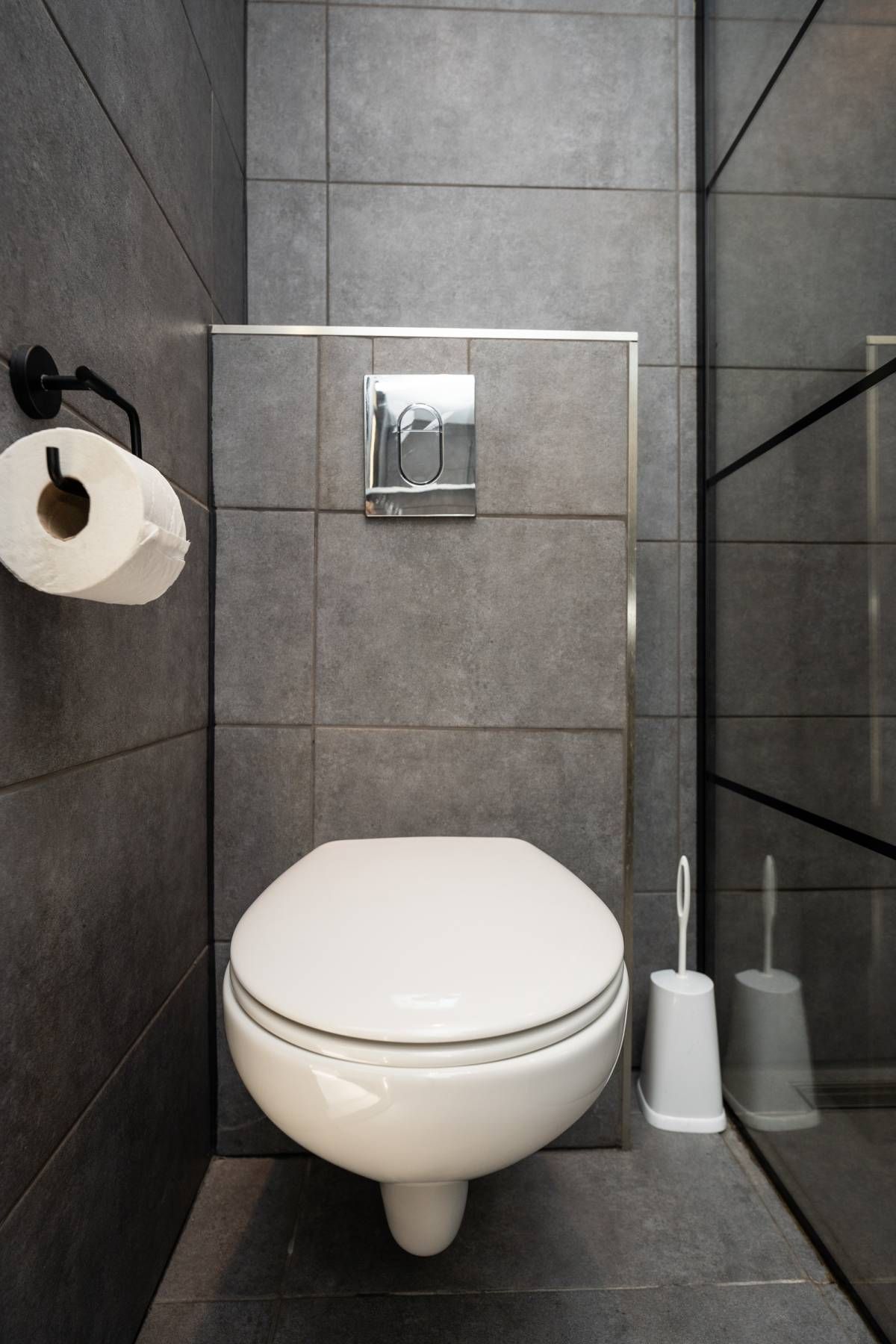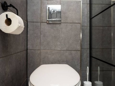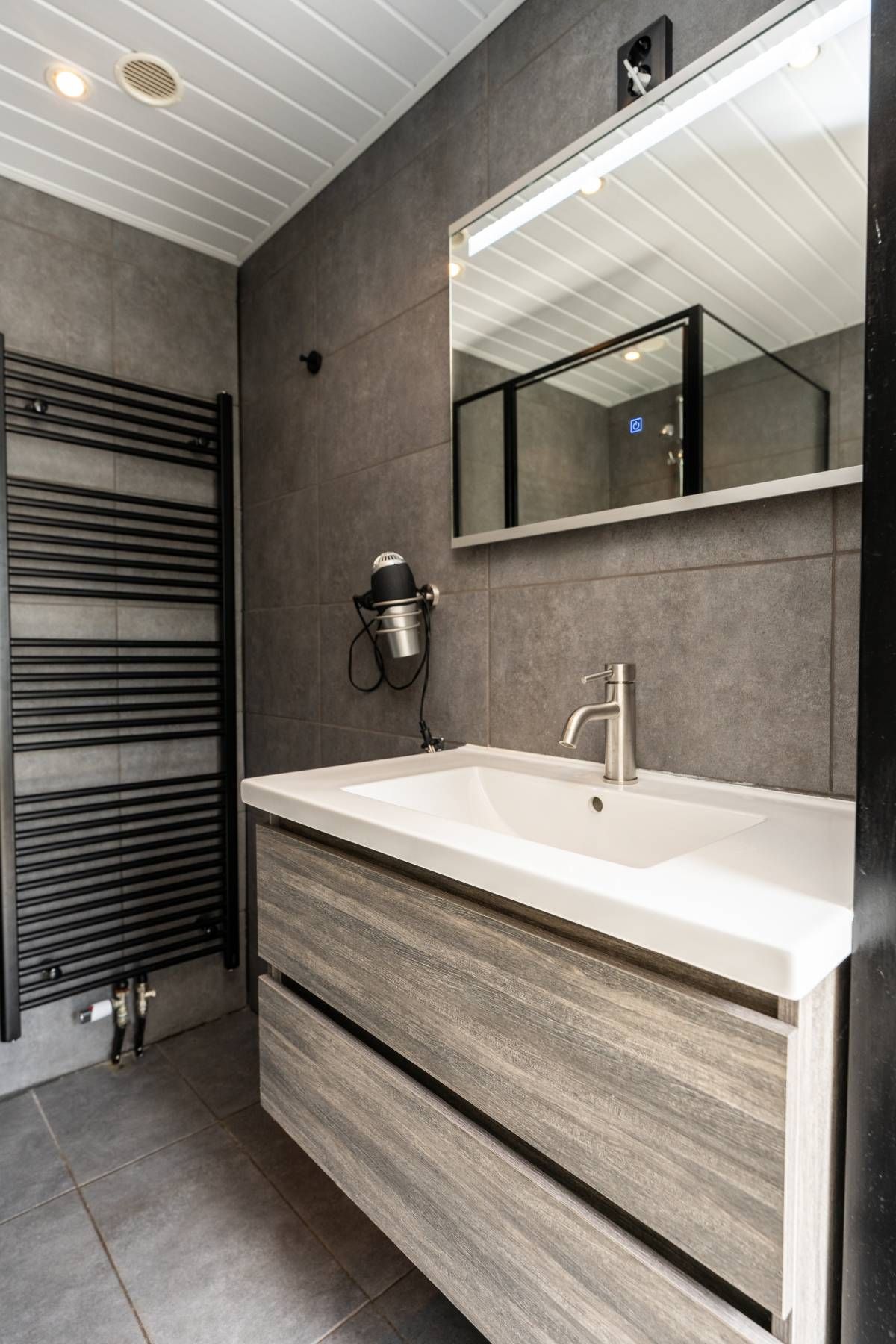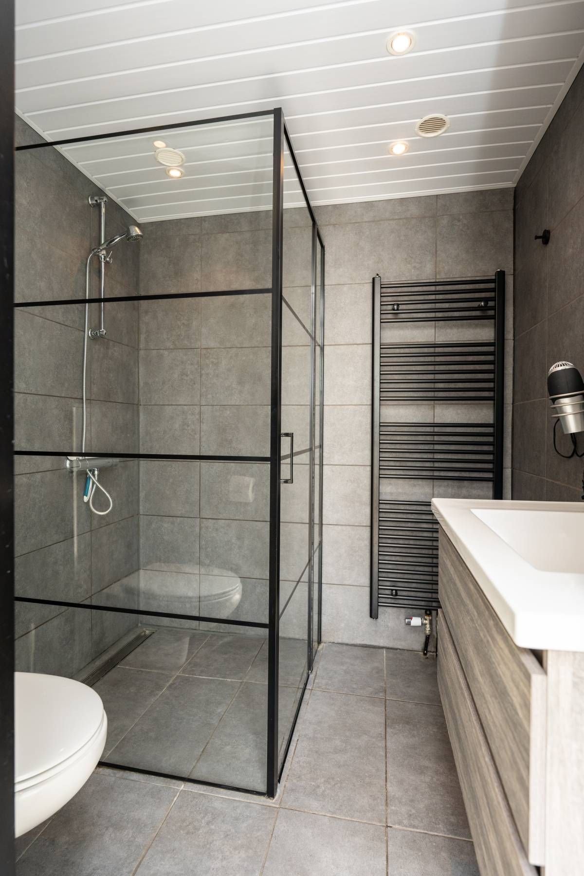 De stijlvolle en luxe badkamer is voorzien van een inloopdouche, een modern wastafelmeubel en een toilet. Ideaal voor wie gelijks vloer verblijft in de woning.