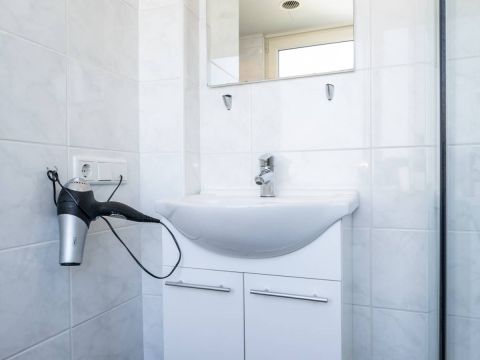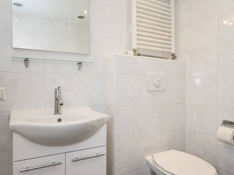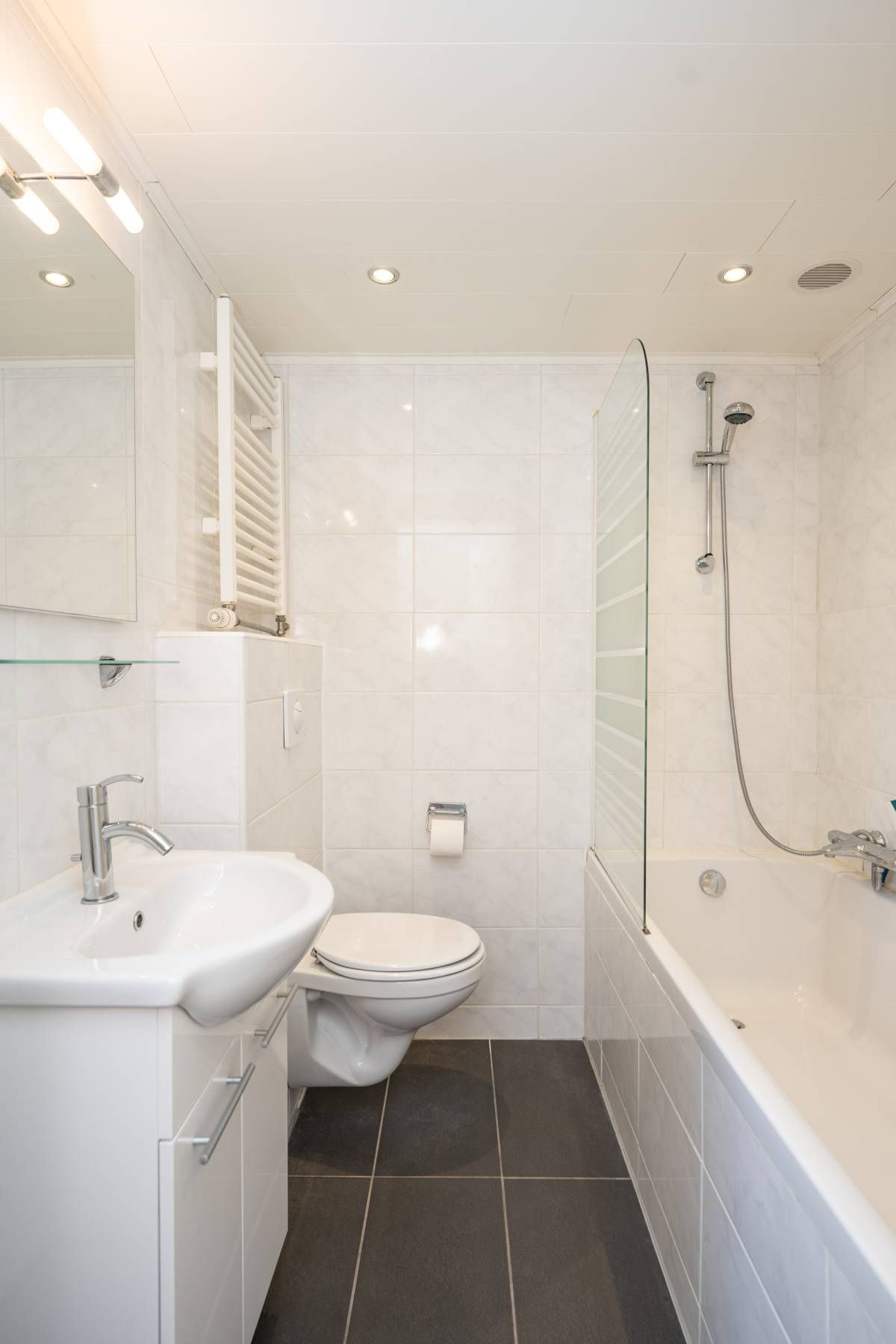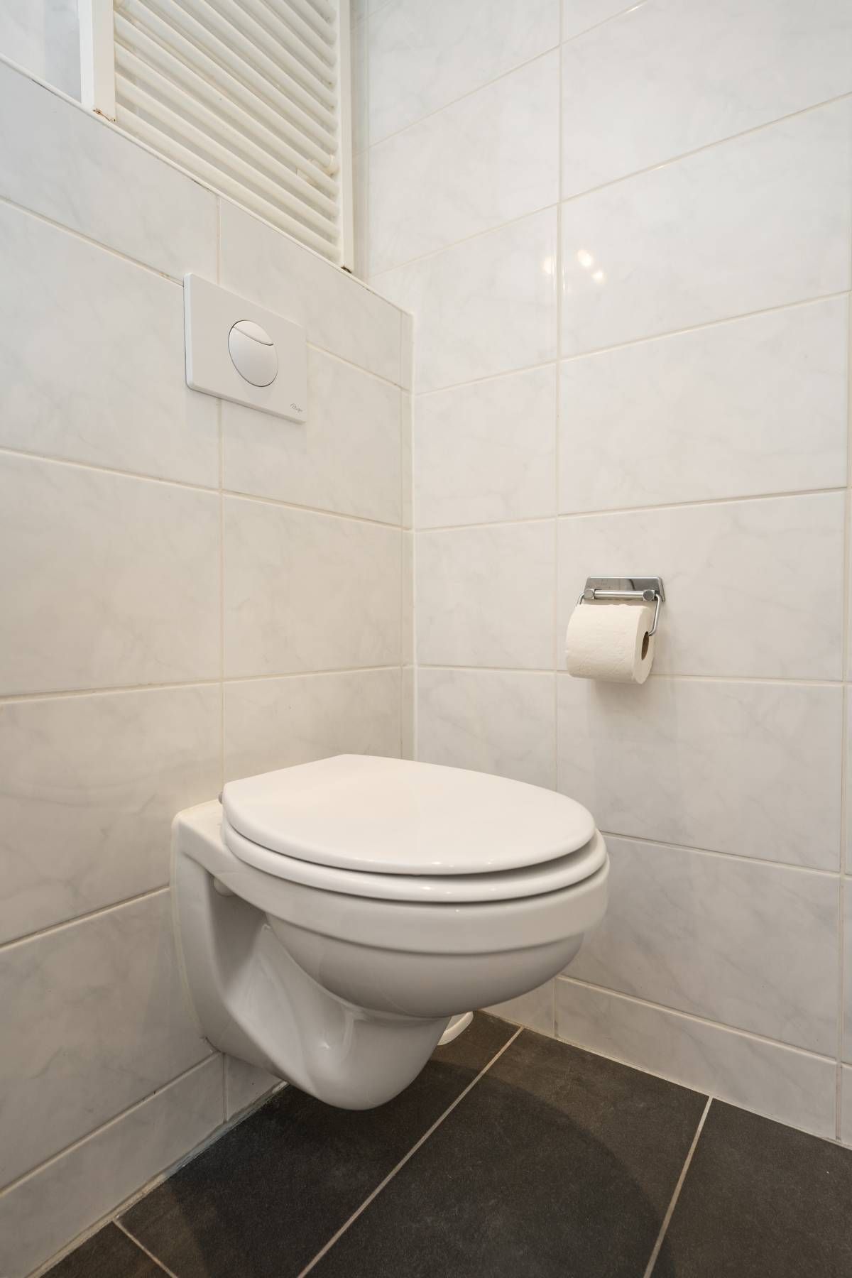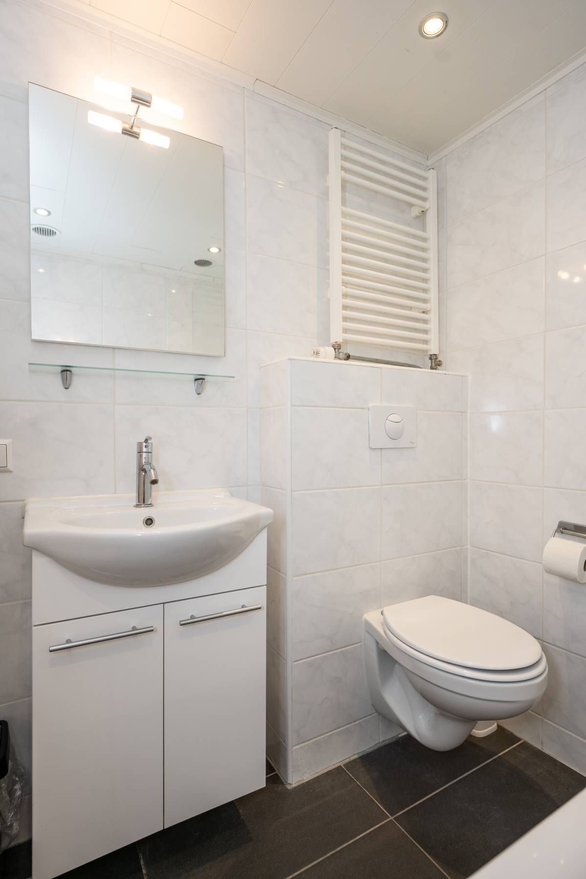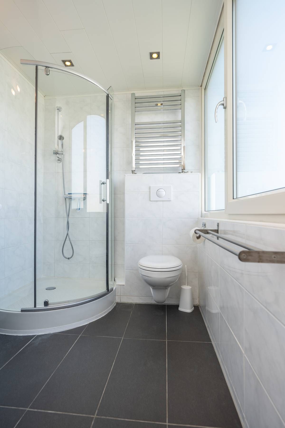 De tweede badkamer is keurig van opzet en beschikt over een douchecabine, een wastafelmeubel en een toilet.