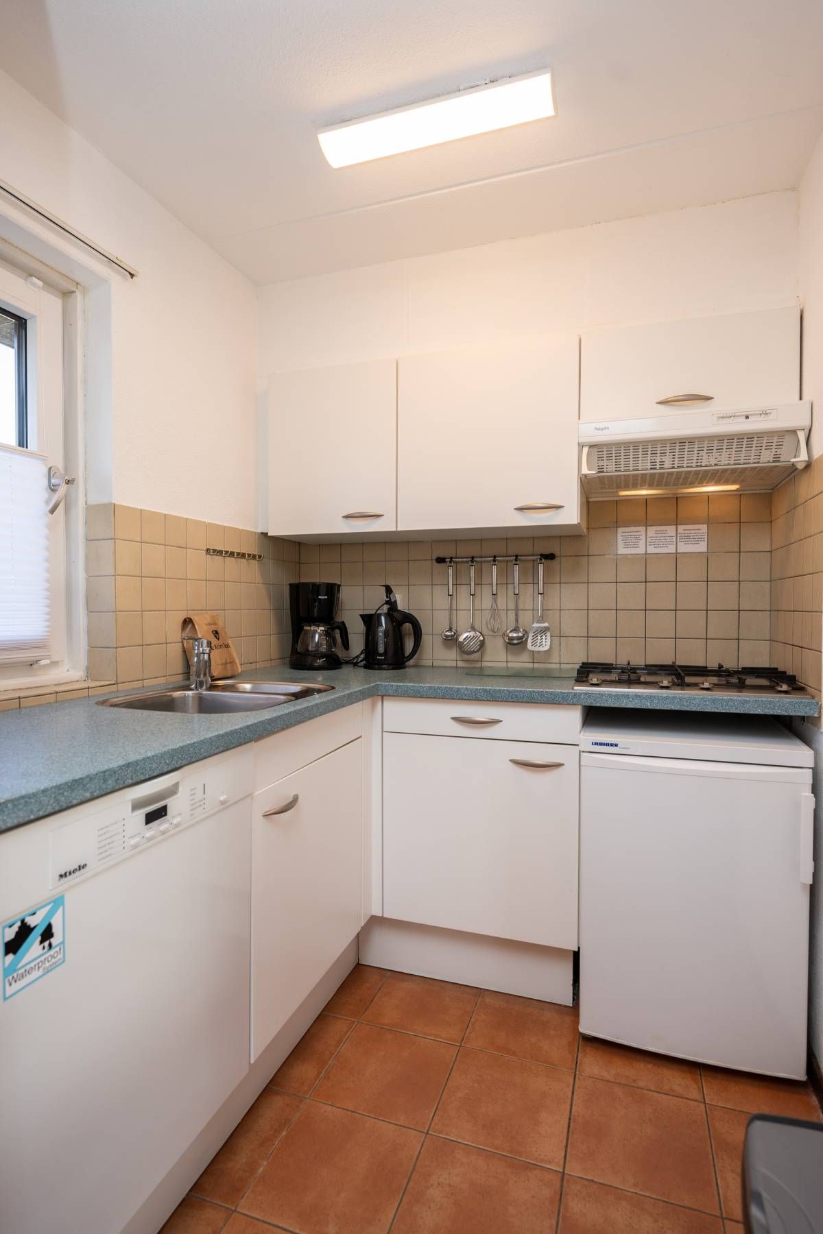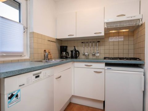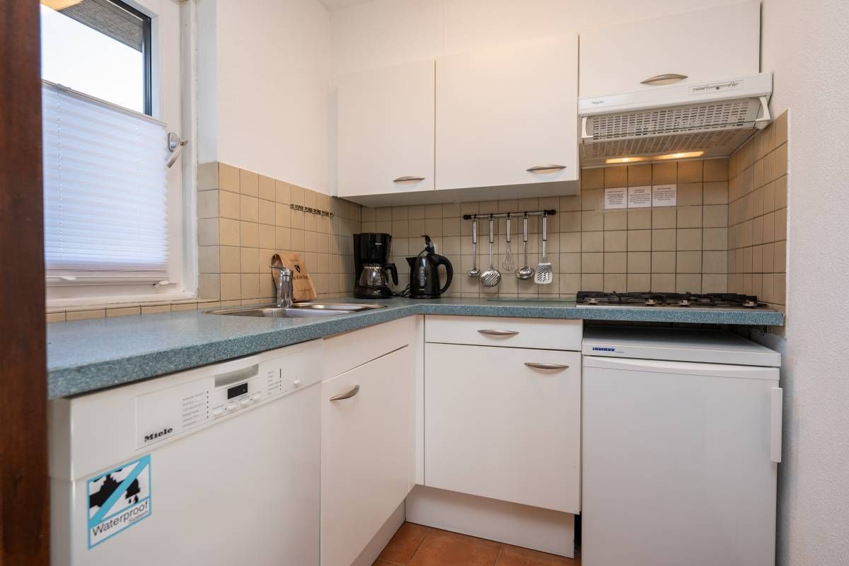 Met de comfortabele zit– en eethoek is er plek genoeg om samen te ontspannen en te genieten. De lichte compacte keuken is uitgerust met een gaskookplaat, afzuigkap, tafelmodel koel/vries combinatie en een afwasmachine.
