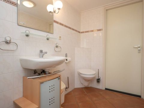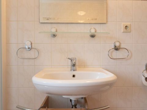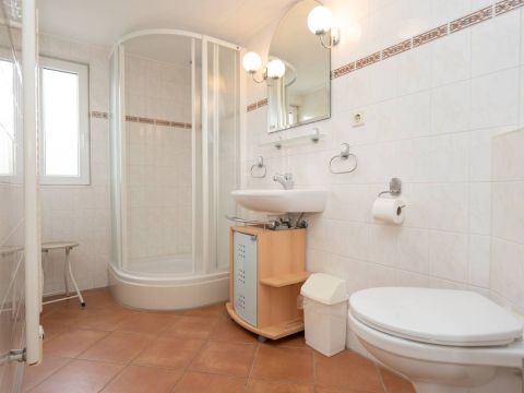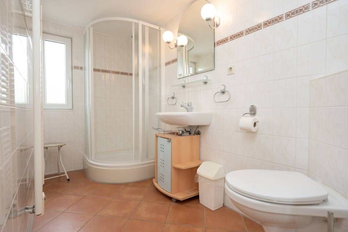 Via de trapopgang komt u op de overloop van de verdieping. Hier bevinden zich twee 2-persoons slaapkamers en een ruime badkamer met douche, toilet en wastafel. De keurige badkamer op de verdieping beschikt over een douchecabine, wastafel met meubel en een toilet.