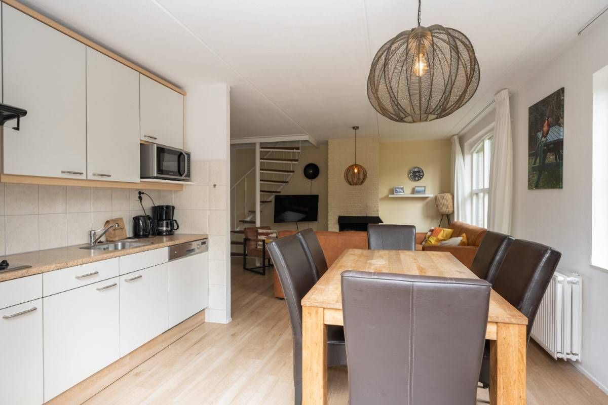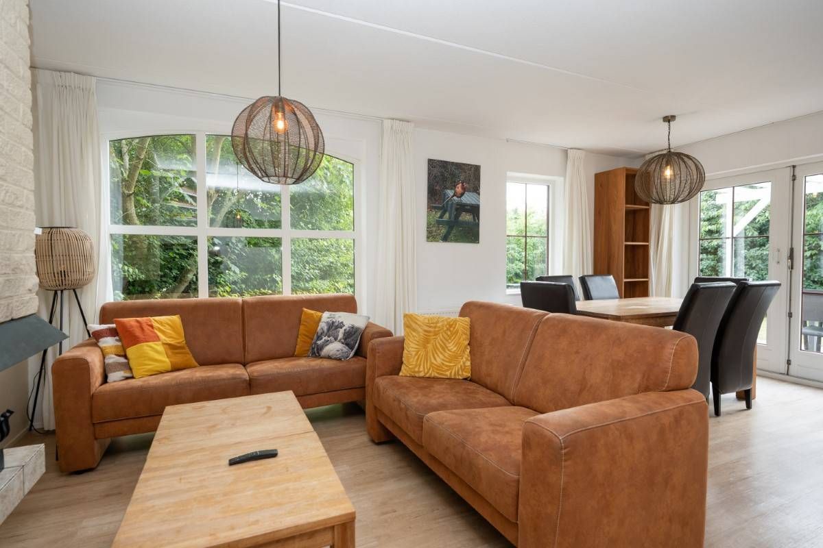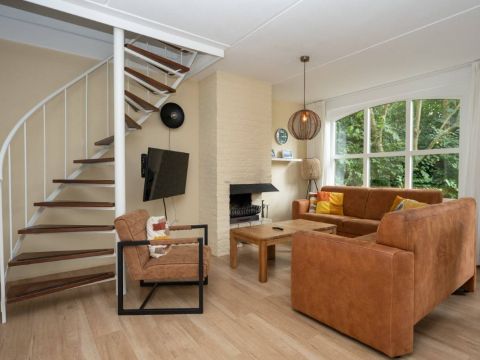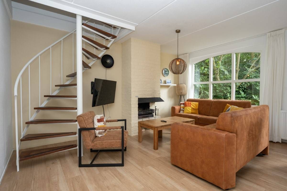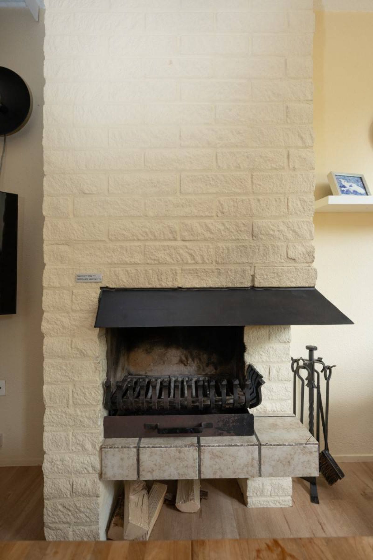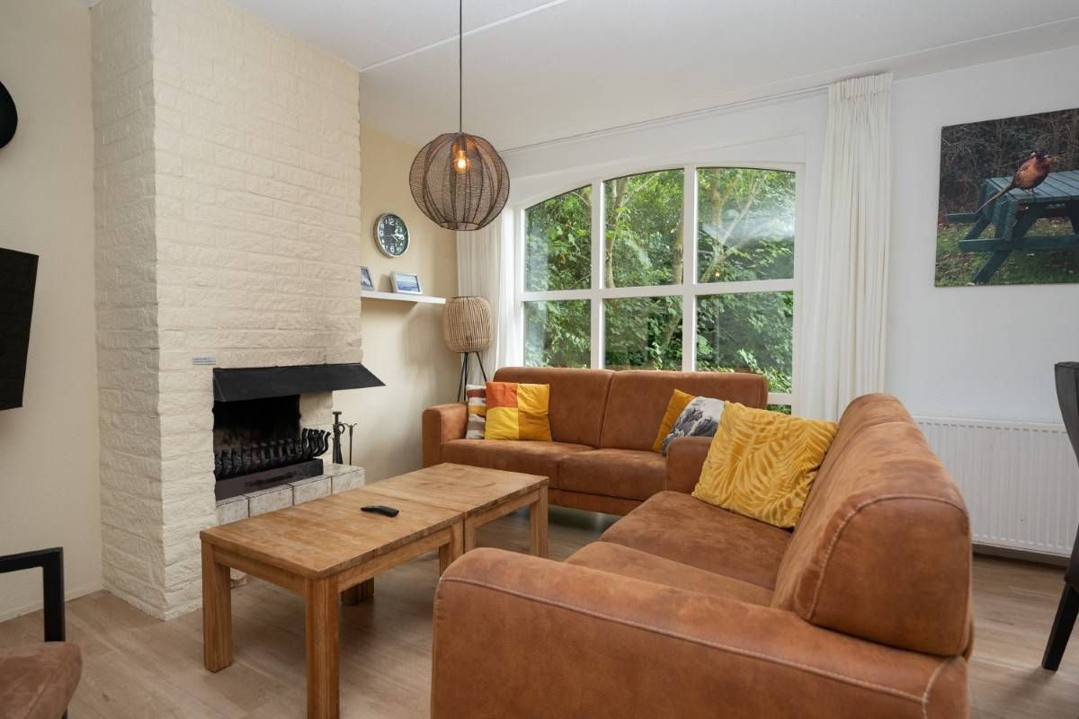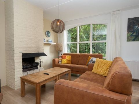 De sfeervolle woonkamer heeft een prettige zit– en eethoek, voorzien van openhaard en een keurige PVC vloer.