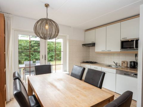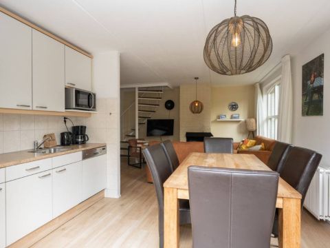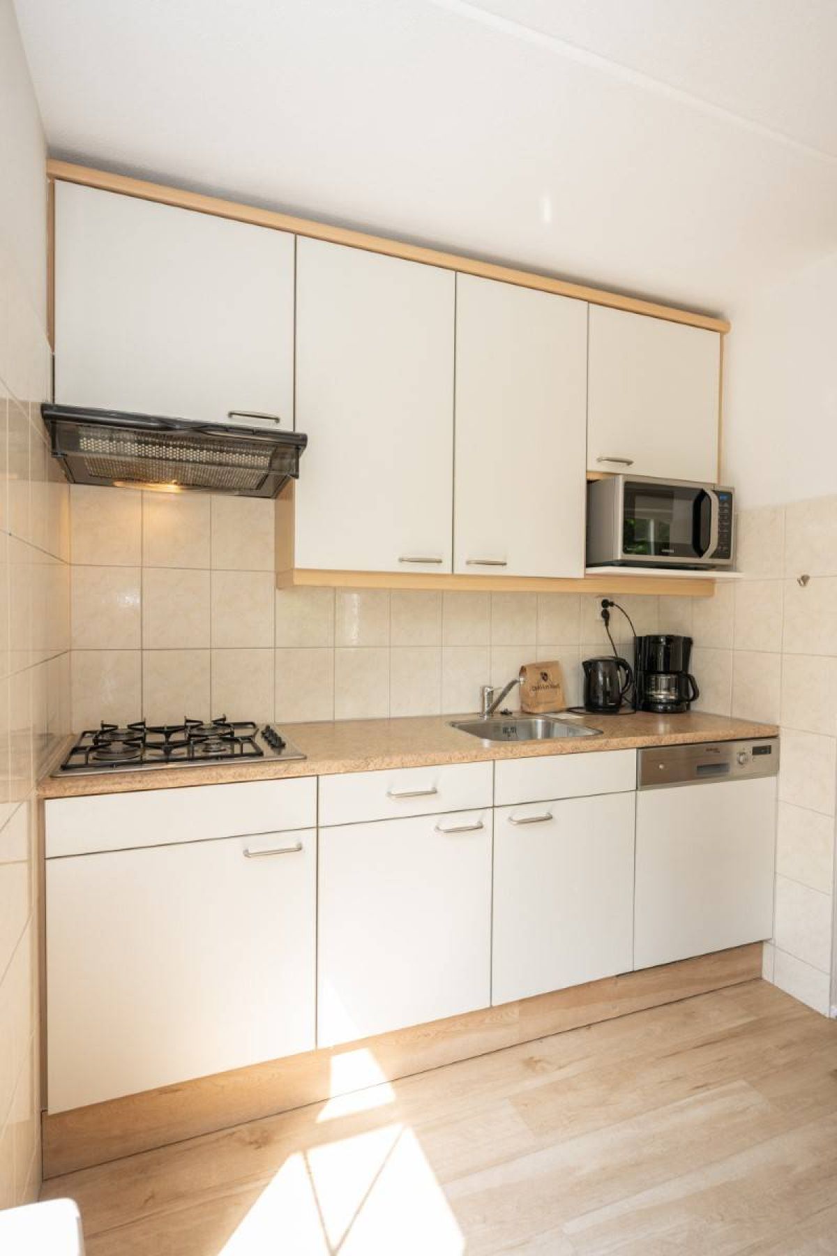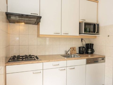 Aansluitend de nette keuken welke is voorzien van oa. een gaskookplaat, vaatwasmachine, magnetron en afzuigkap.