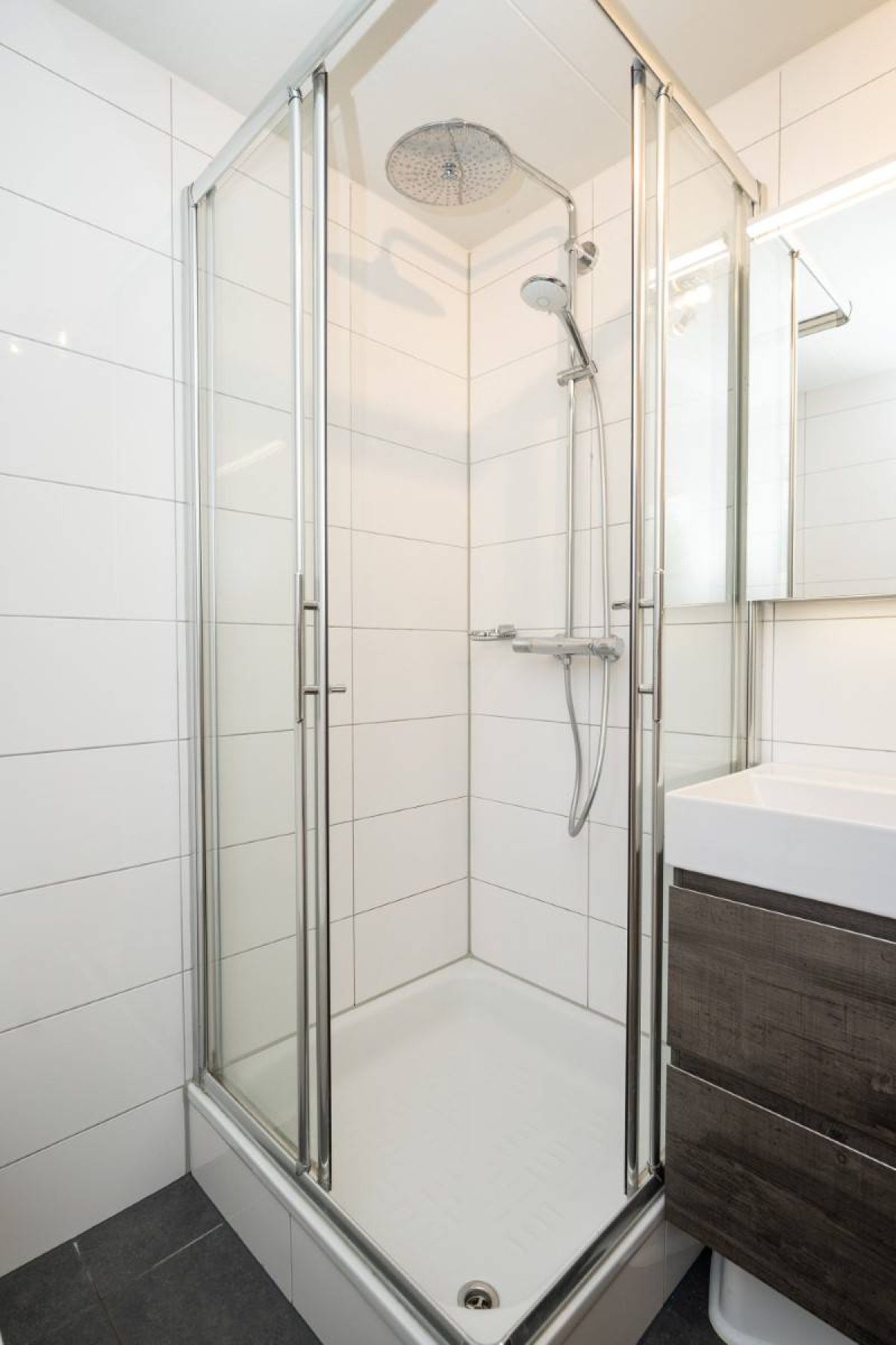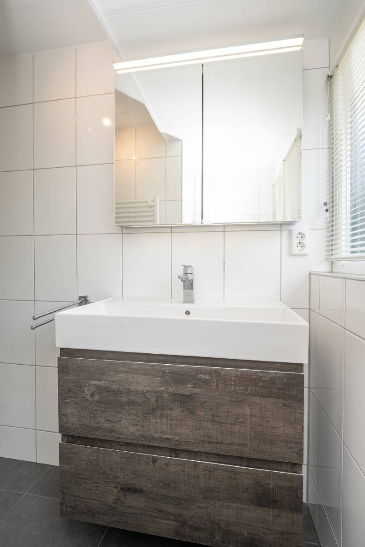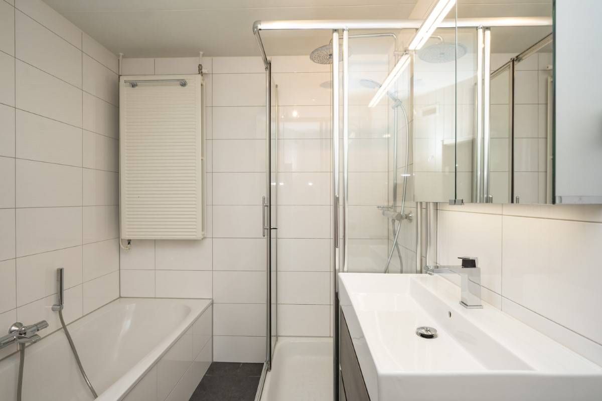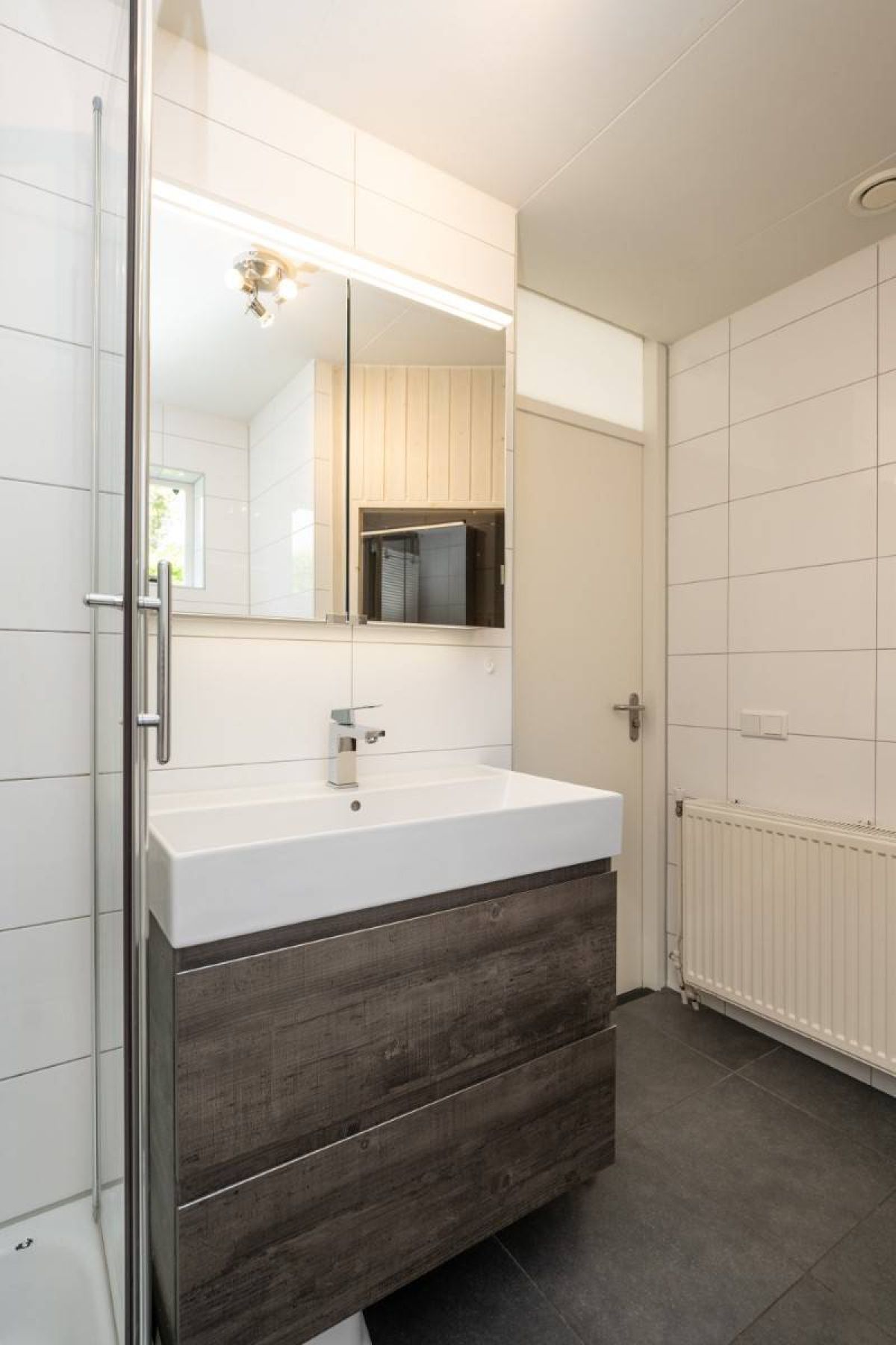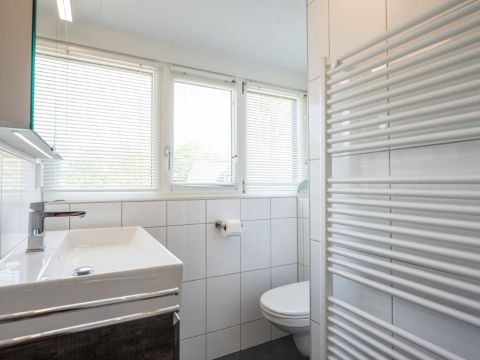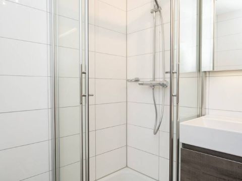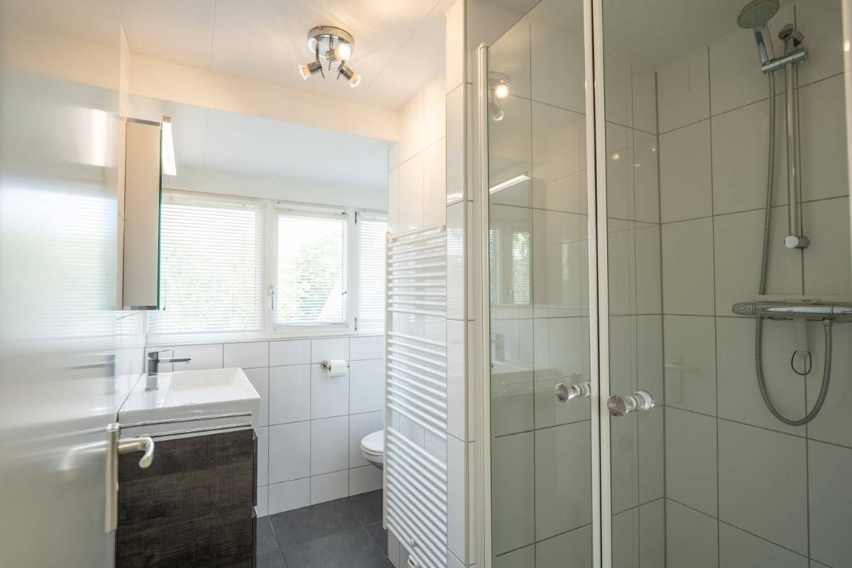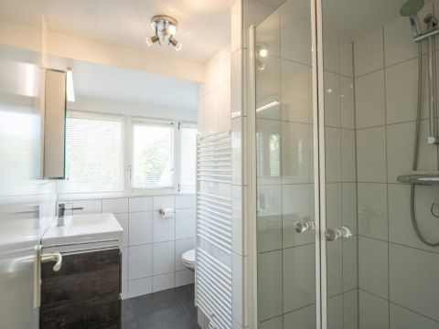Op de verdieping een tweede luxe badkamer welke beschikt over een douchecabine, wastafelmeubel en toilet.